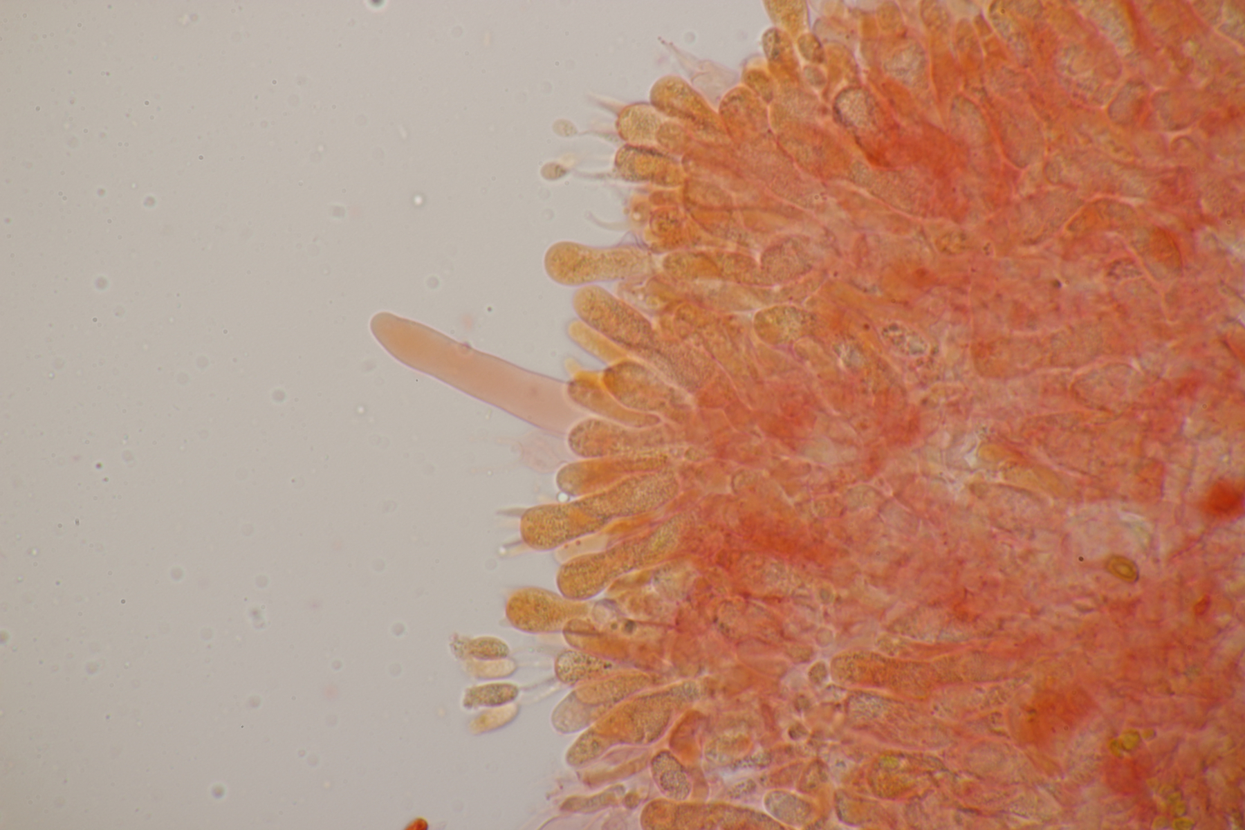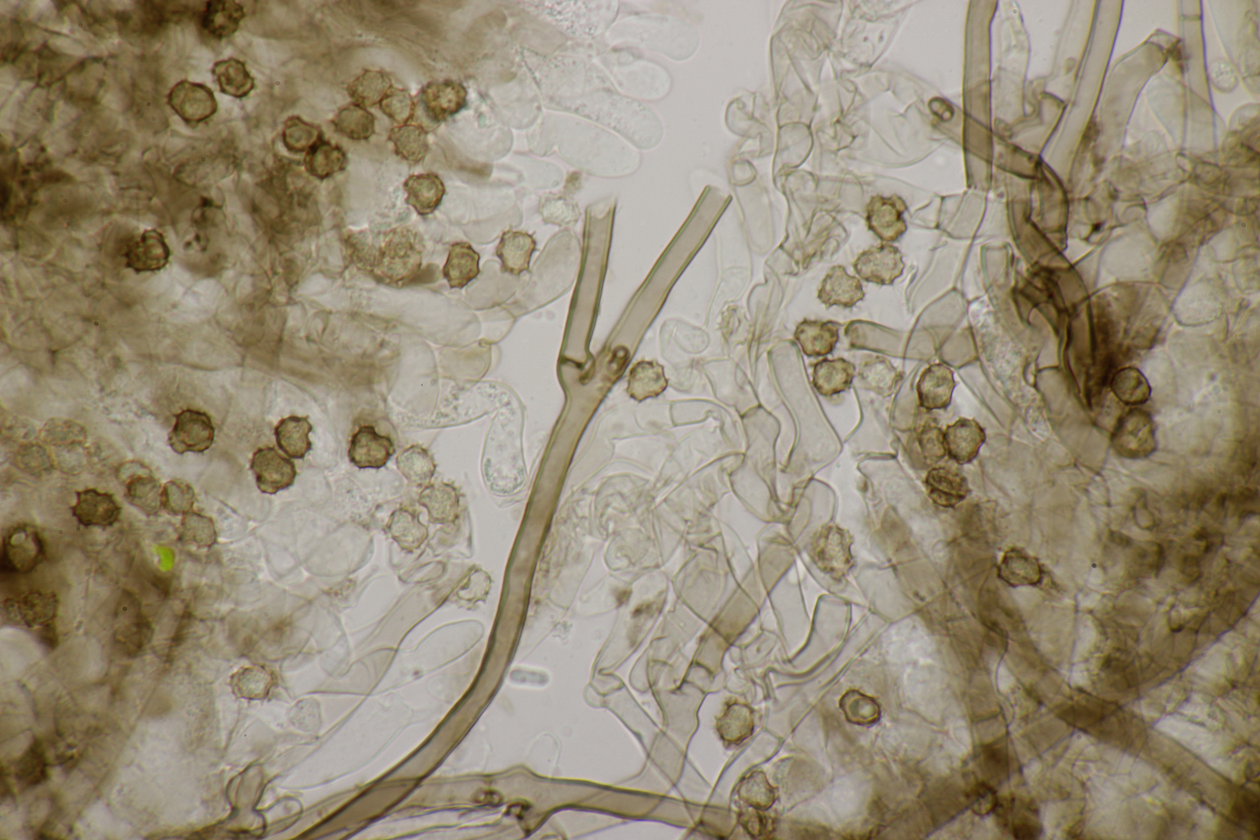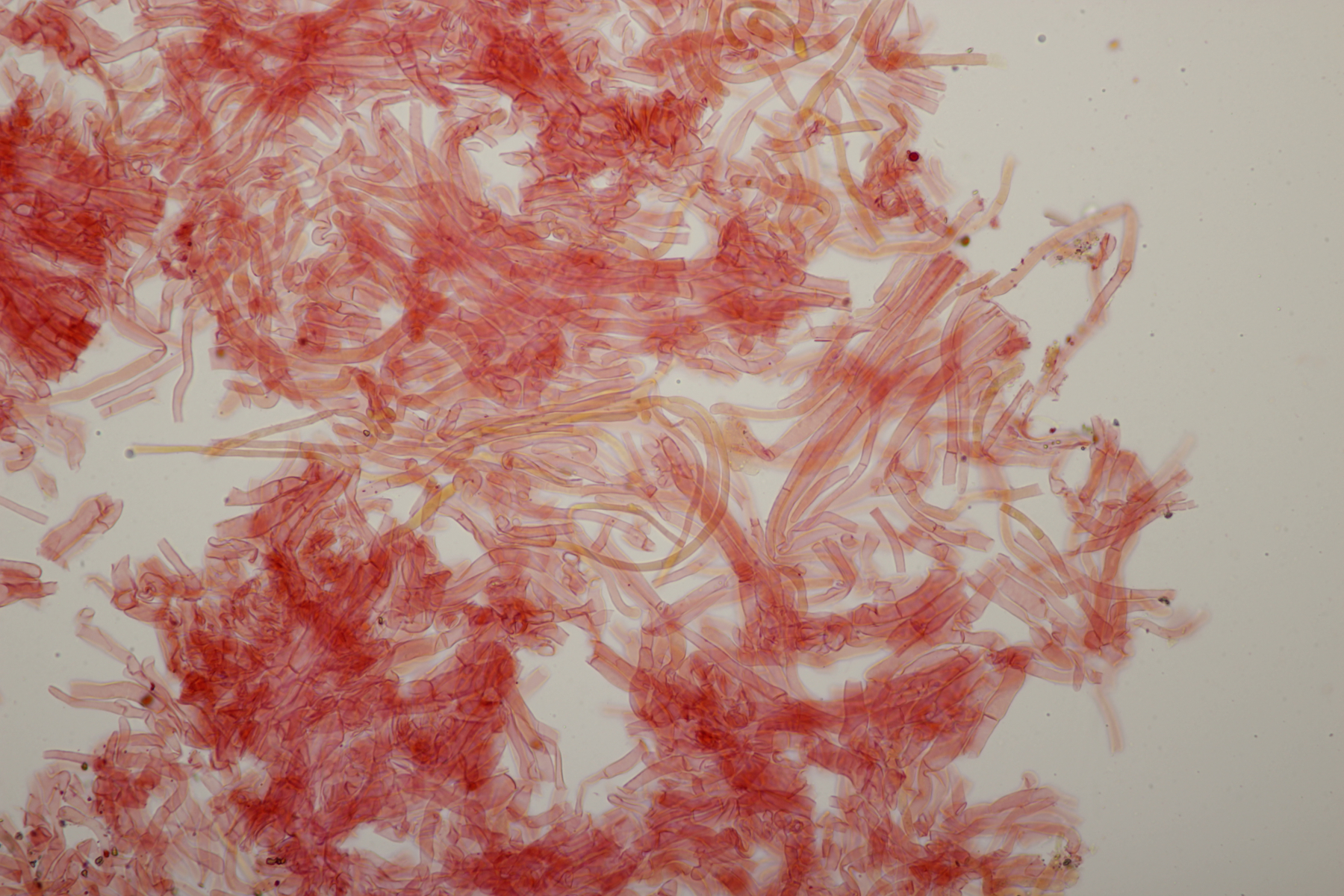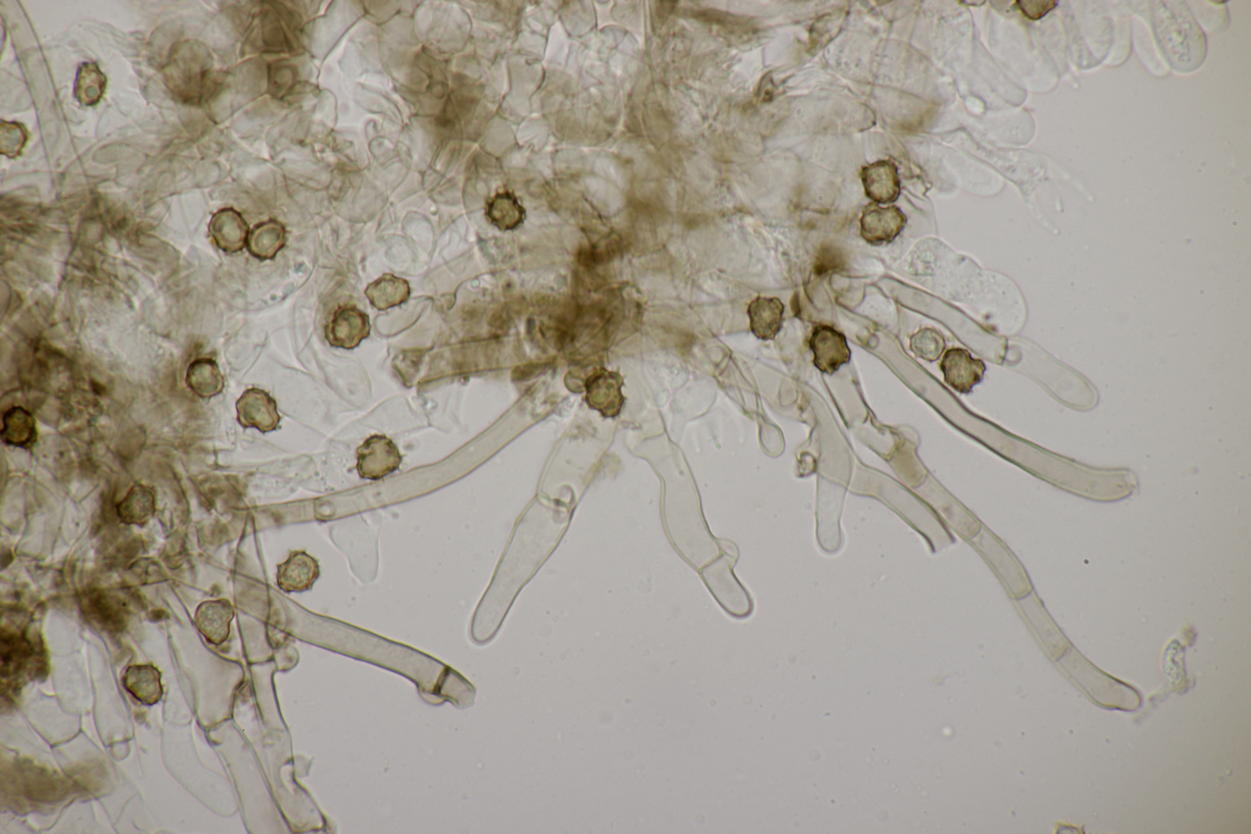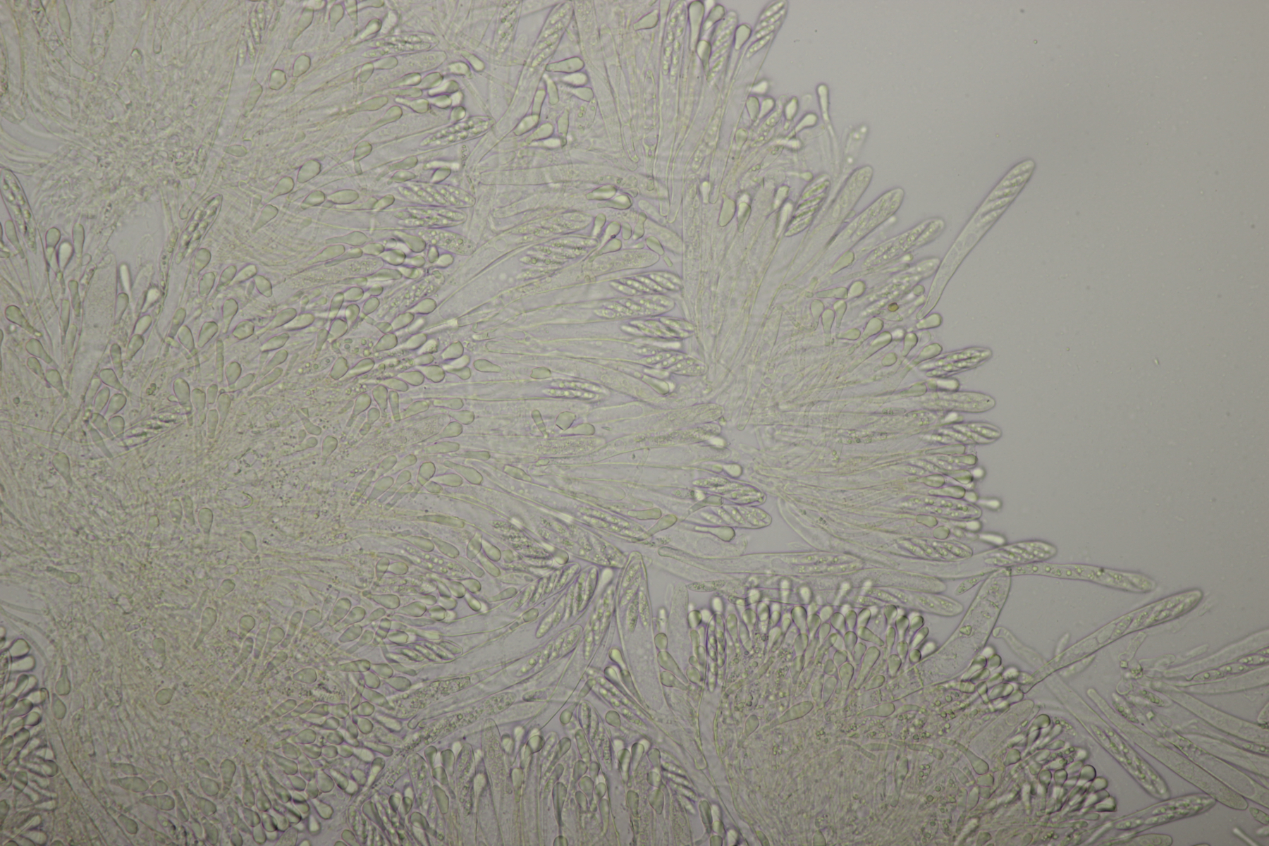 5. Daneben war aber noch ein Rindenpilz mit auf dem Stück Holz, der deutlich absporfreundlicher war. Sporenmaße (8.5+-0.6) µm x (5.0+-0.3) µm, Q=1.7+-0.1 bzw. (7.8-9.8) µm x (4.4-5.4) µm, Q=1.6-1.9, Schnallen vorhanden, Basidien 4-sporig, dazu nicht inkrustierte, lange Zystiden. Die Basidien würde ich tendentiell für suburniform halten und dann bei Hyphoderma schlüsseln, wo ich dann bei H. obtusum lande. Was meint ihr?