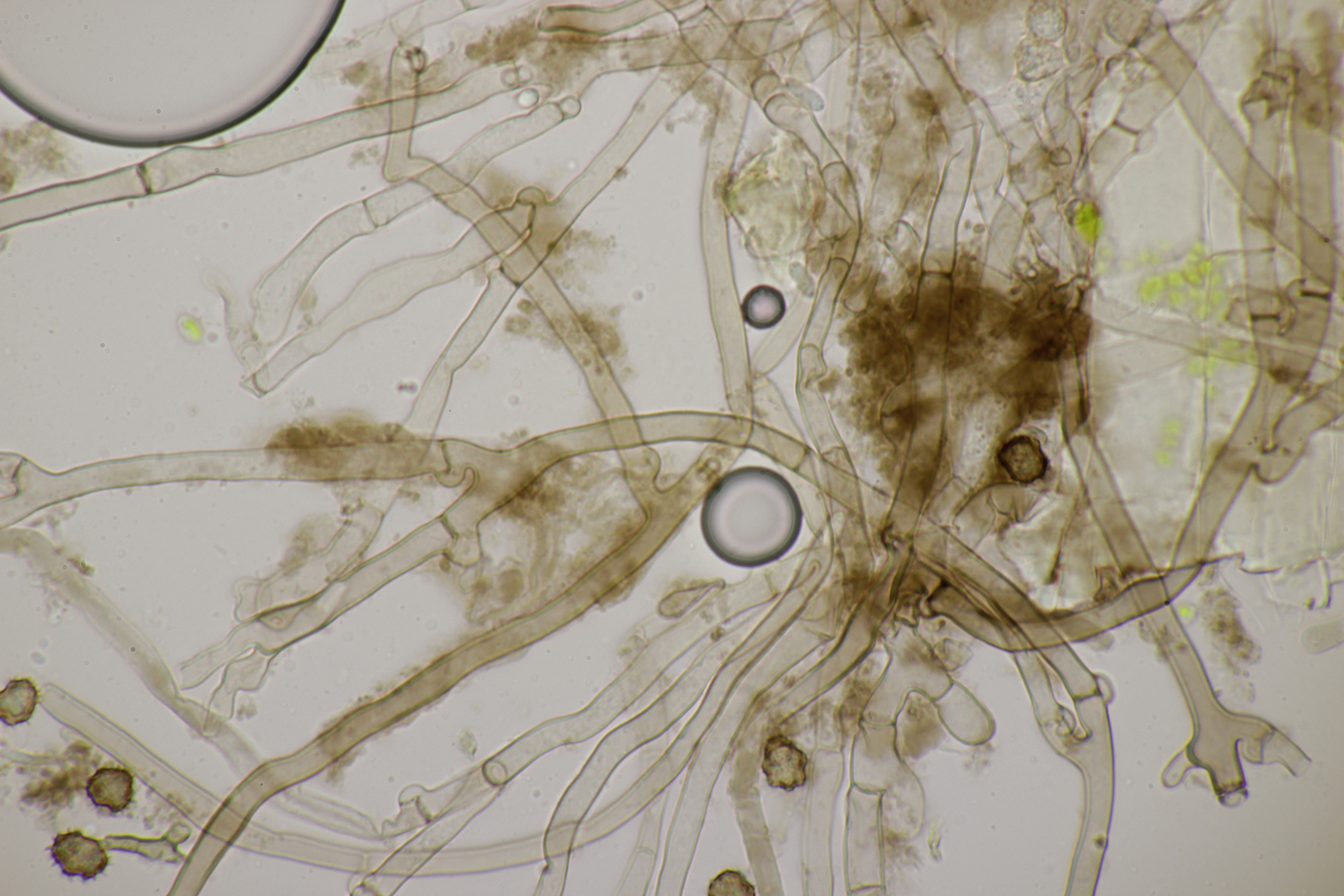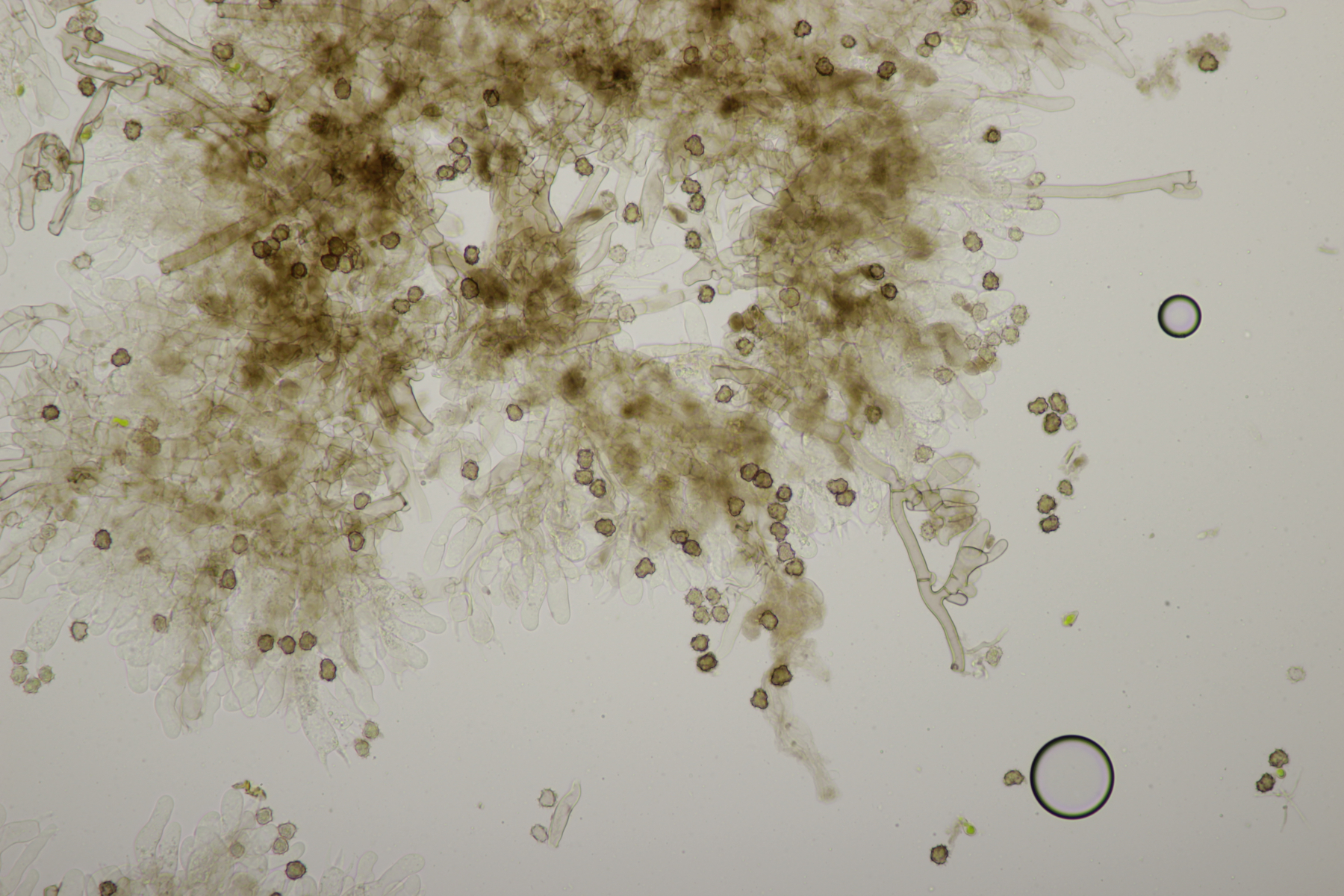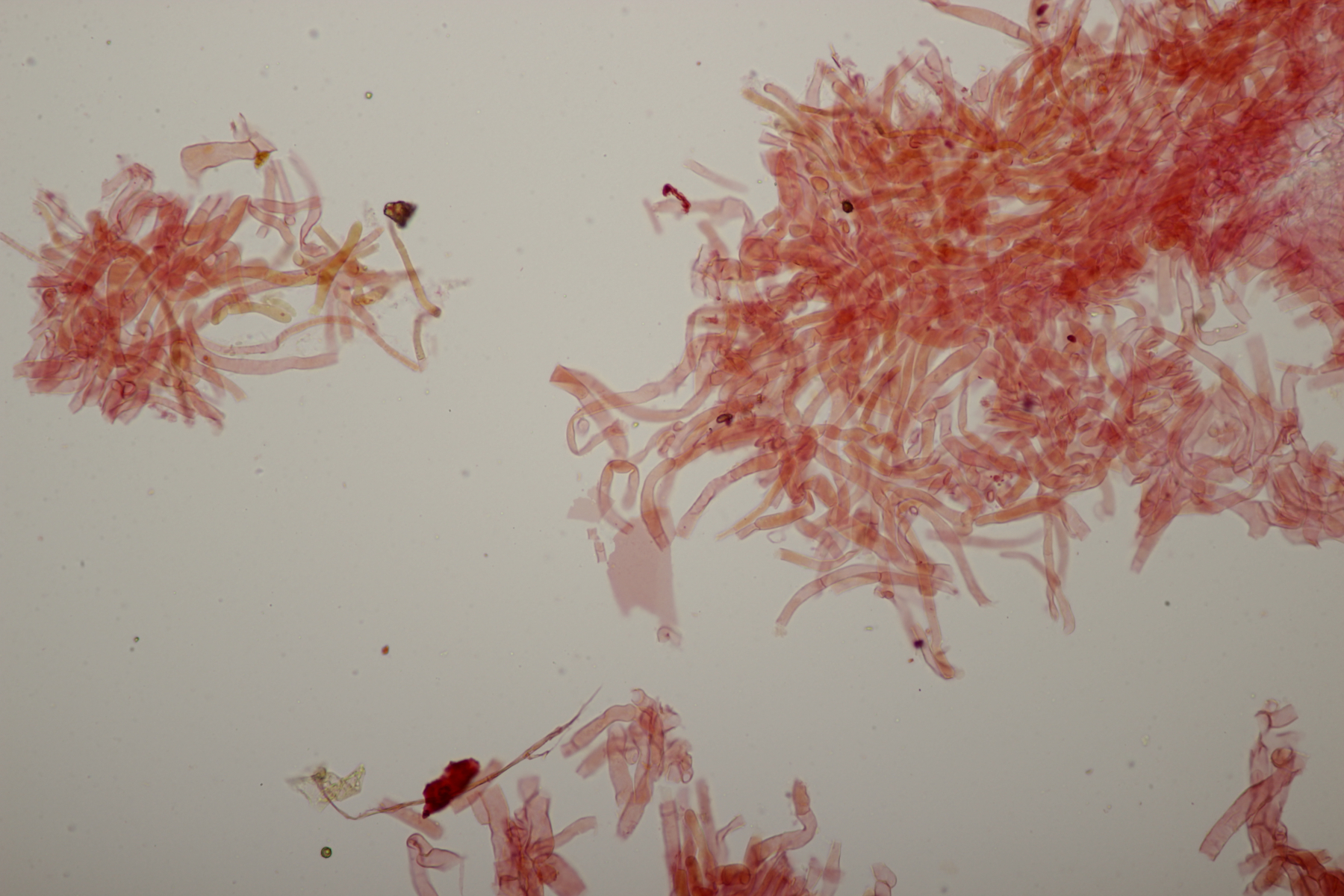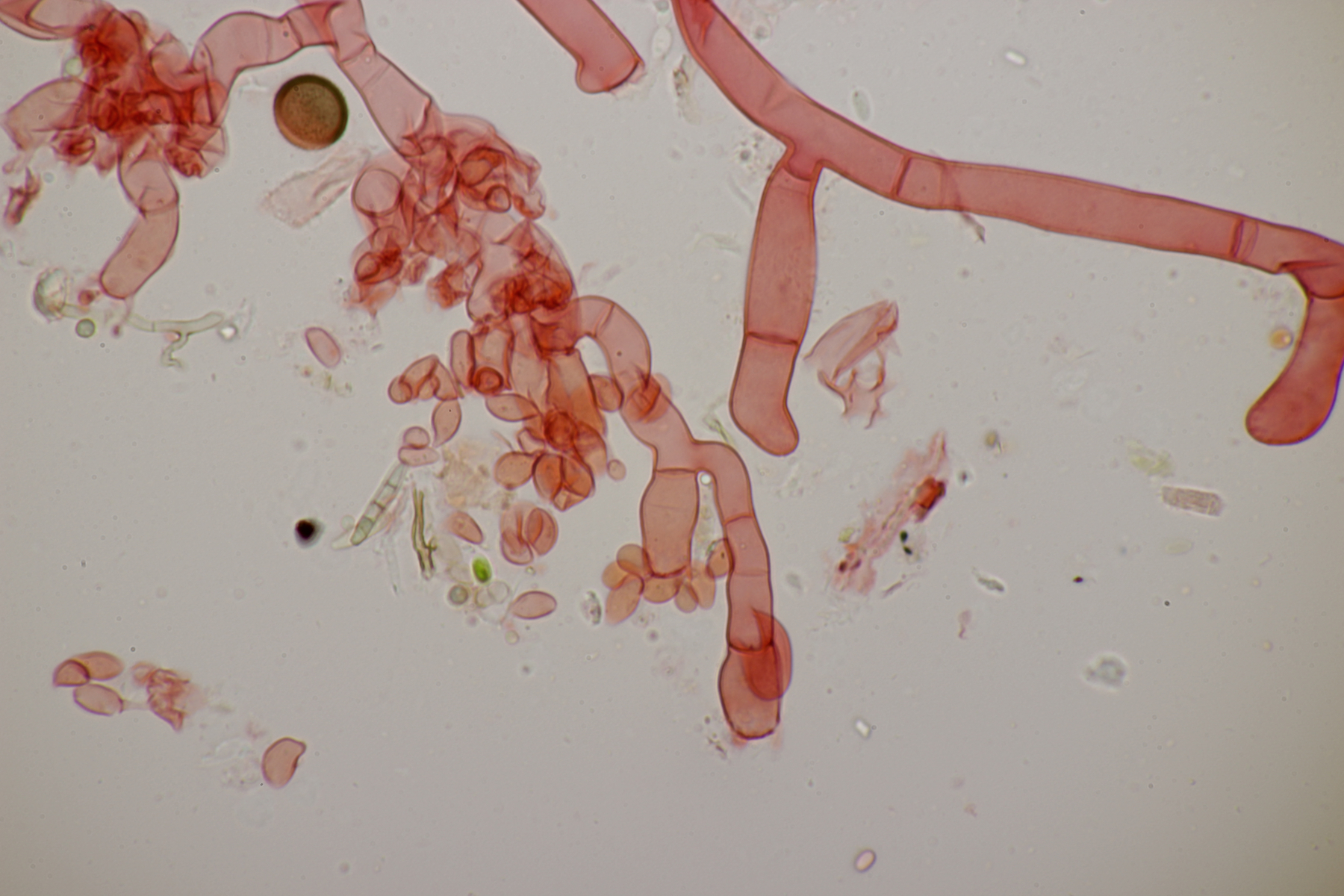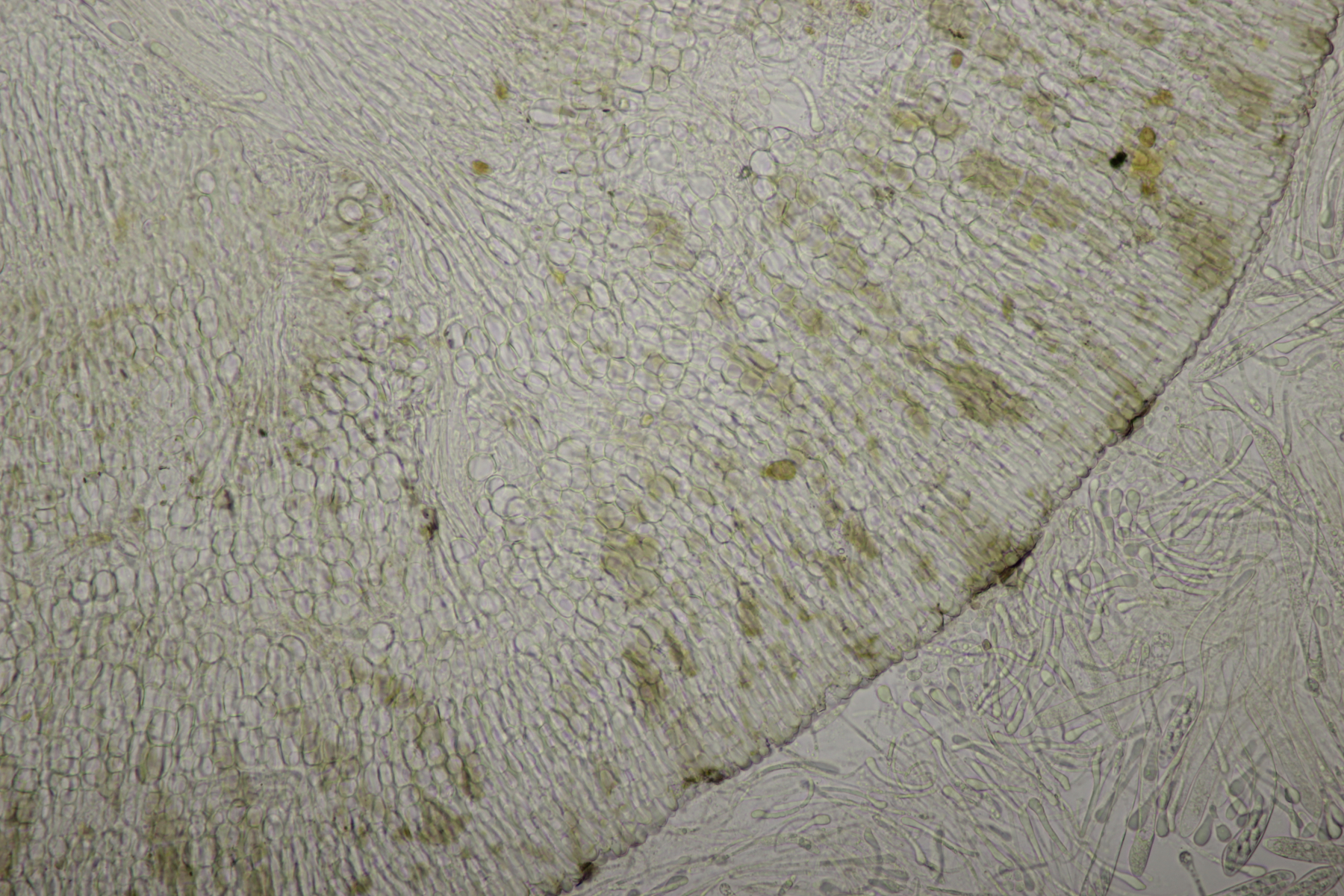 5. Daneben war aber noch ein Rindenpilz mit auf dem Stück Holz, der deutlich absporfreundlicher war. Sporenmaße (8.5+-0.6) µm x (5.0+-0.3) µm, Q=1.7+-0.1 bzw. (7.8-9.8) µm x (4.4-5.4) µm, Q=1.6-1.9, Schnallen vorhanden, Basidien 4-sporig, dazu nicht inkrustierte, lange Zystiden. Die Basidien würde ich tendentiell für suburniform halten und dann bei Hyphoderma schlüsseln, wo ich dann bei H. obtusum lande. Was meint ihr?