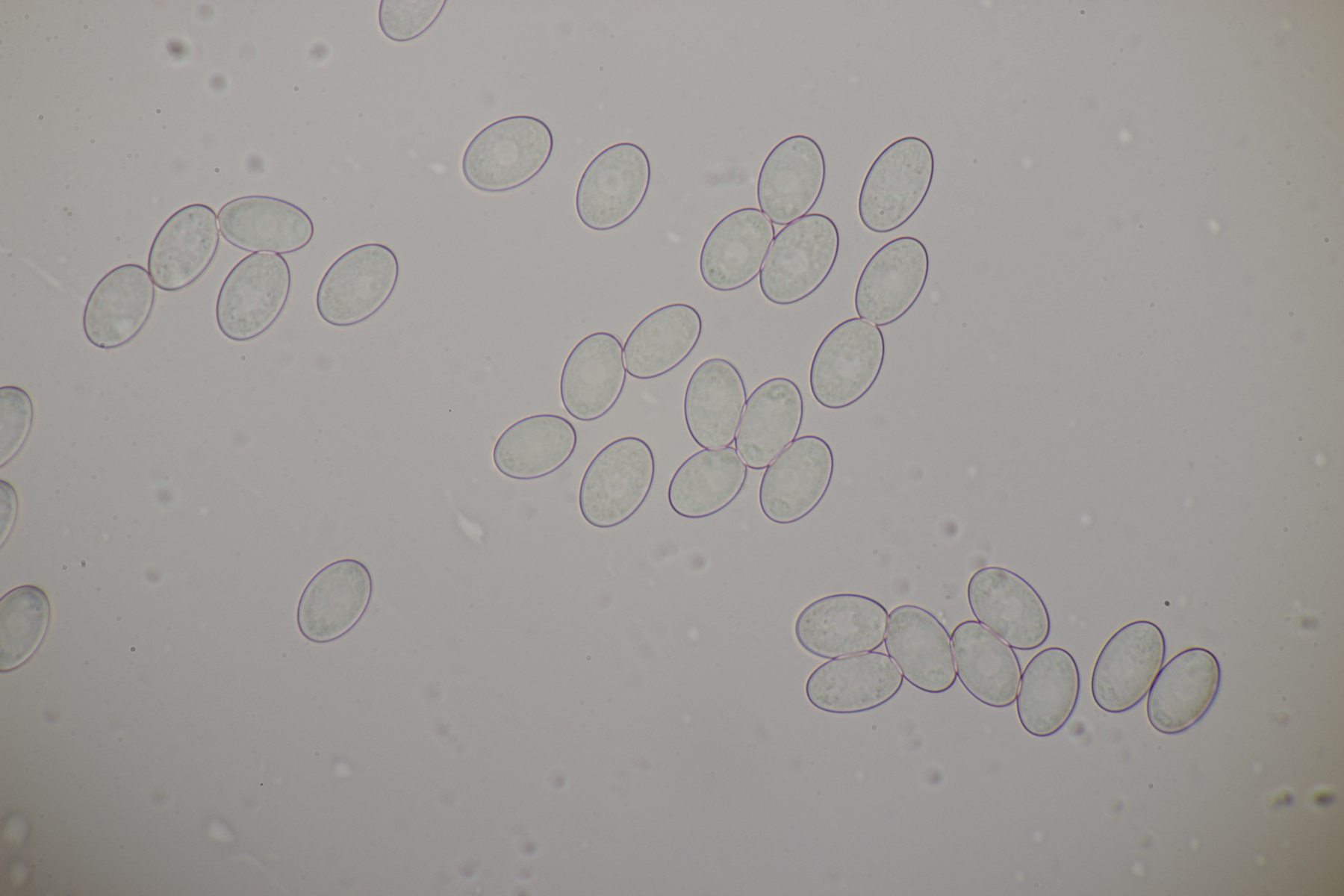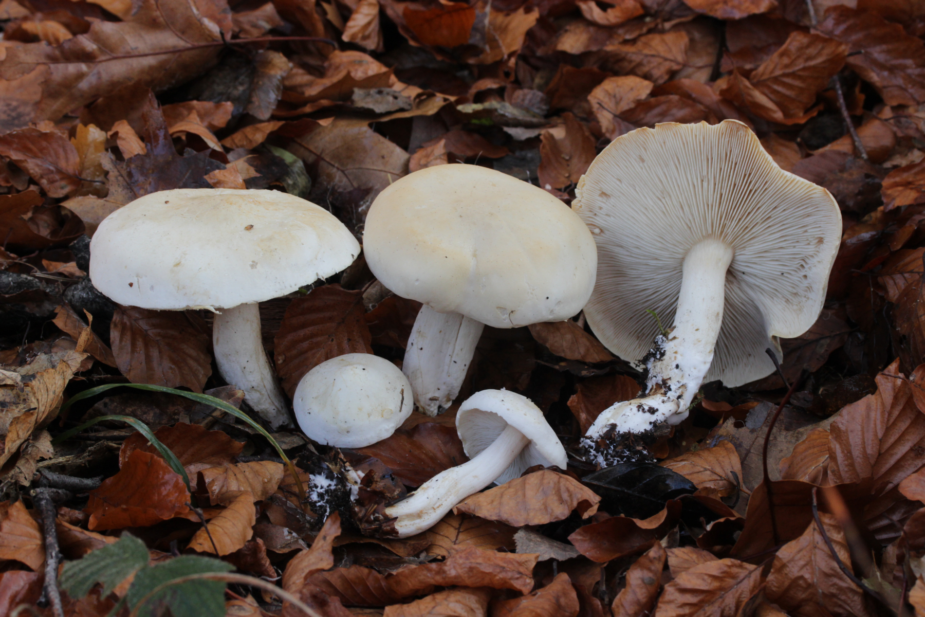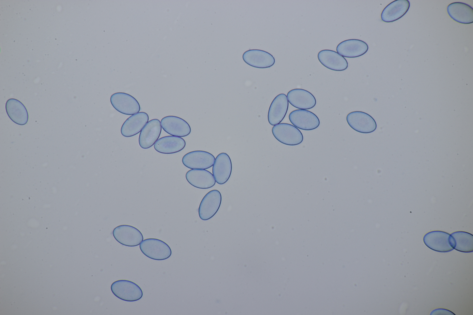 2. Ein weißer Ritterling.... Begleitbäume waren Fagus und Betula, wobei ich Betula für den konkreten Partner halten würde, da die Pilze immer direkt um die einzelnen Birken wuchsen. Der Geruch ist schwer zu beschreiben, teilweise eher süßlich angenehm, aber dann auch mal mit leicht unangenehmer Note. Schnallen waren in der Huthaut an einigen Stellen reichlich vorhanden und an anderen Stellen dann wieder Mangelware. Die Sporen messen (5.5+-0.3) µm x (3.7+-0.3) µm, Q=1.5+-0.1 bzw. (5.0-6.1) µm x (3.3-4.6) µm, Q=1.3-1.6. Tricholoma stiparophyllum? Oder doch was anderes?