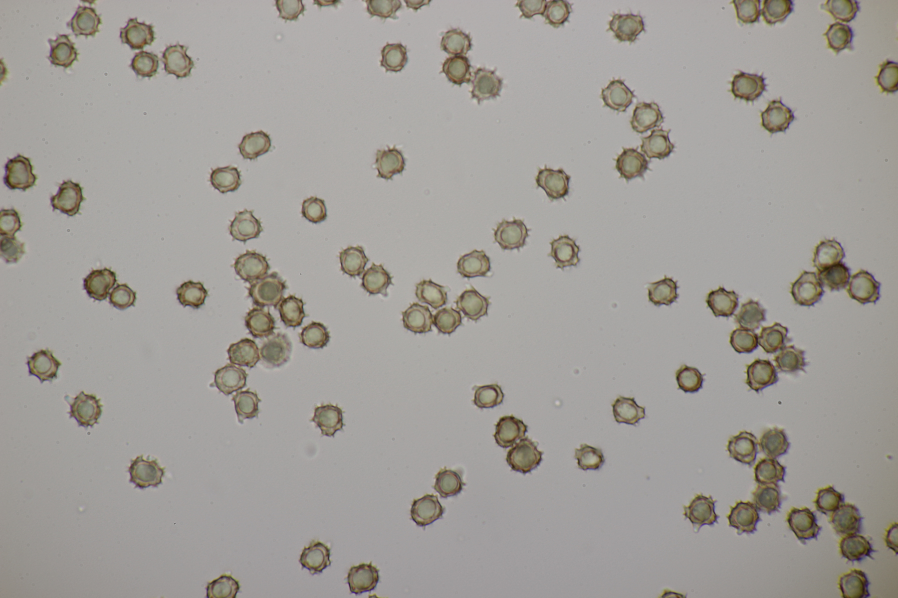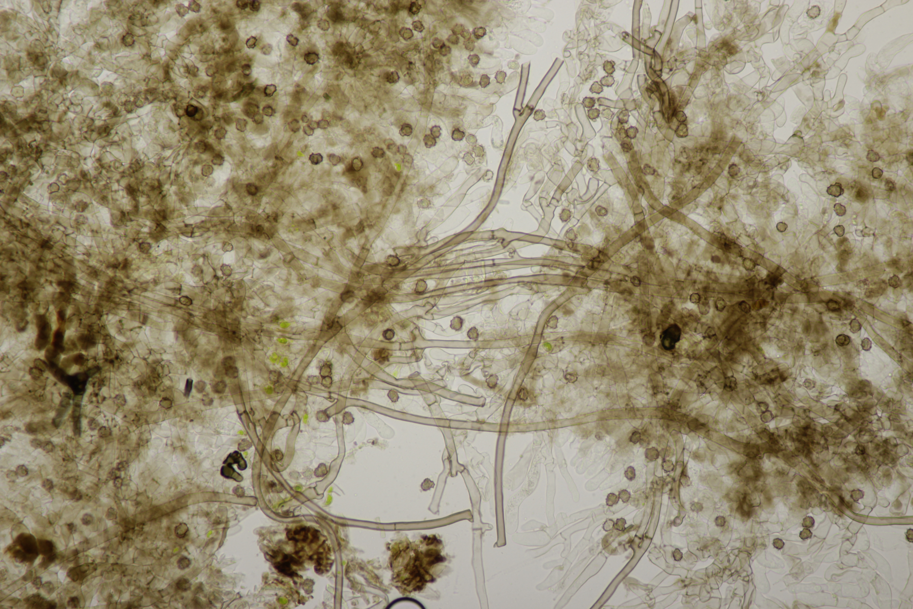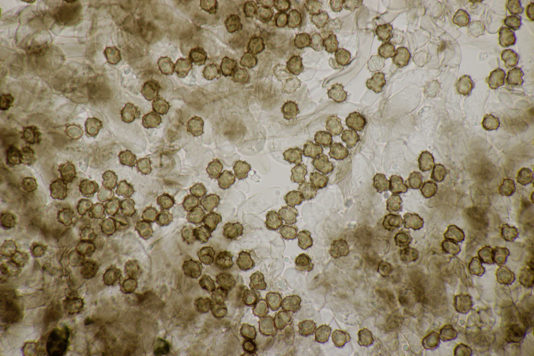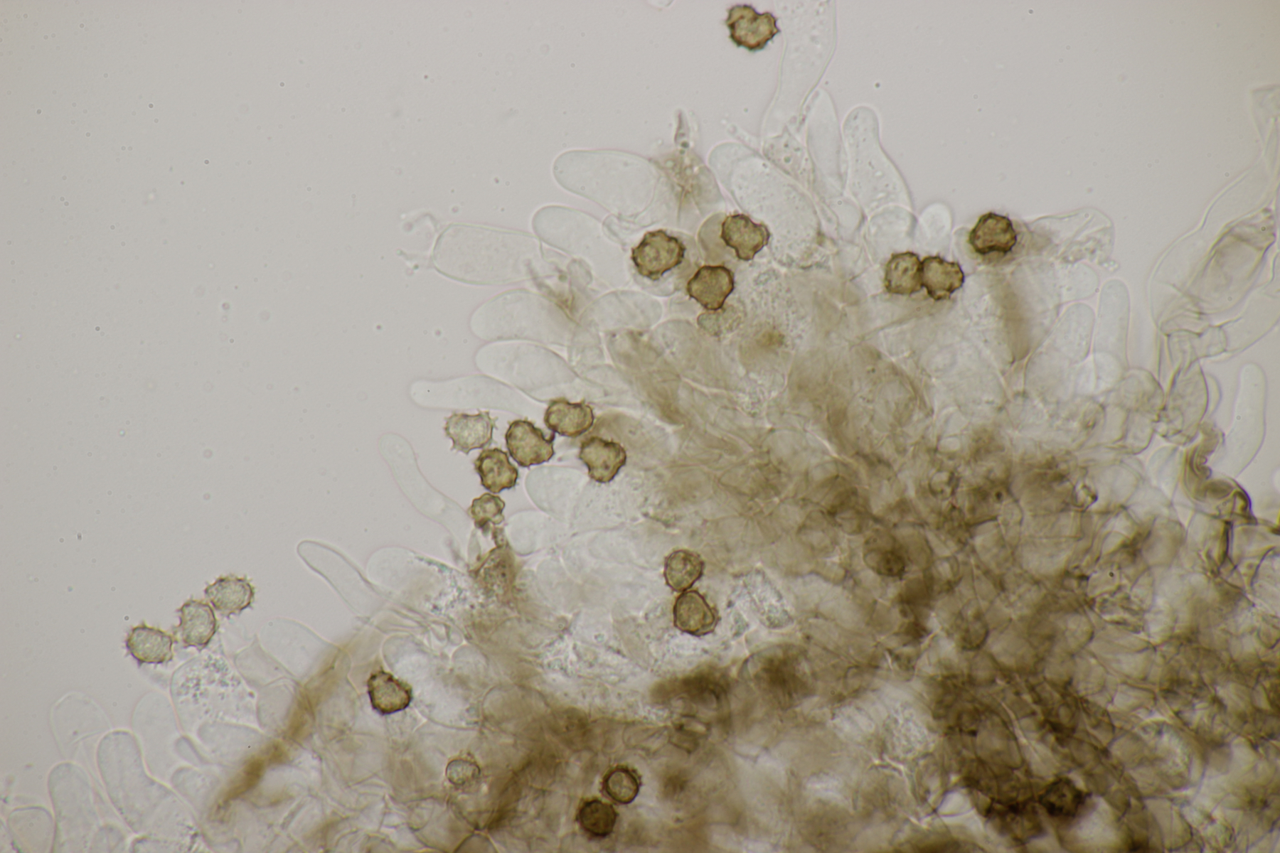 Die Sporen messen (8.0+-0.4) µm x (6.2+-0.4) µm, Q=1.3+-0.1 bzw. (7.5-8.8) µm x (5.6-7.0) µm, Q=1.1-1.4 und sind unregelmäßig geformt. Die Hyphen sind um die 5,5 µm breit. Schnallen sind vorhanden, Zystiden nicht, und das Hymenium ist nicht cyanescent. Wenn ich dann mit Franks Schlüssel arbeite, lande ich am ehesten bei T. umbrinospora, was aber farblich nicht gut paßt. Was sagen die Experten?