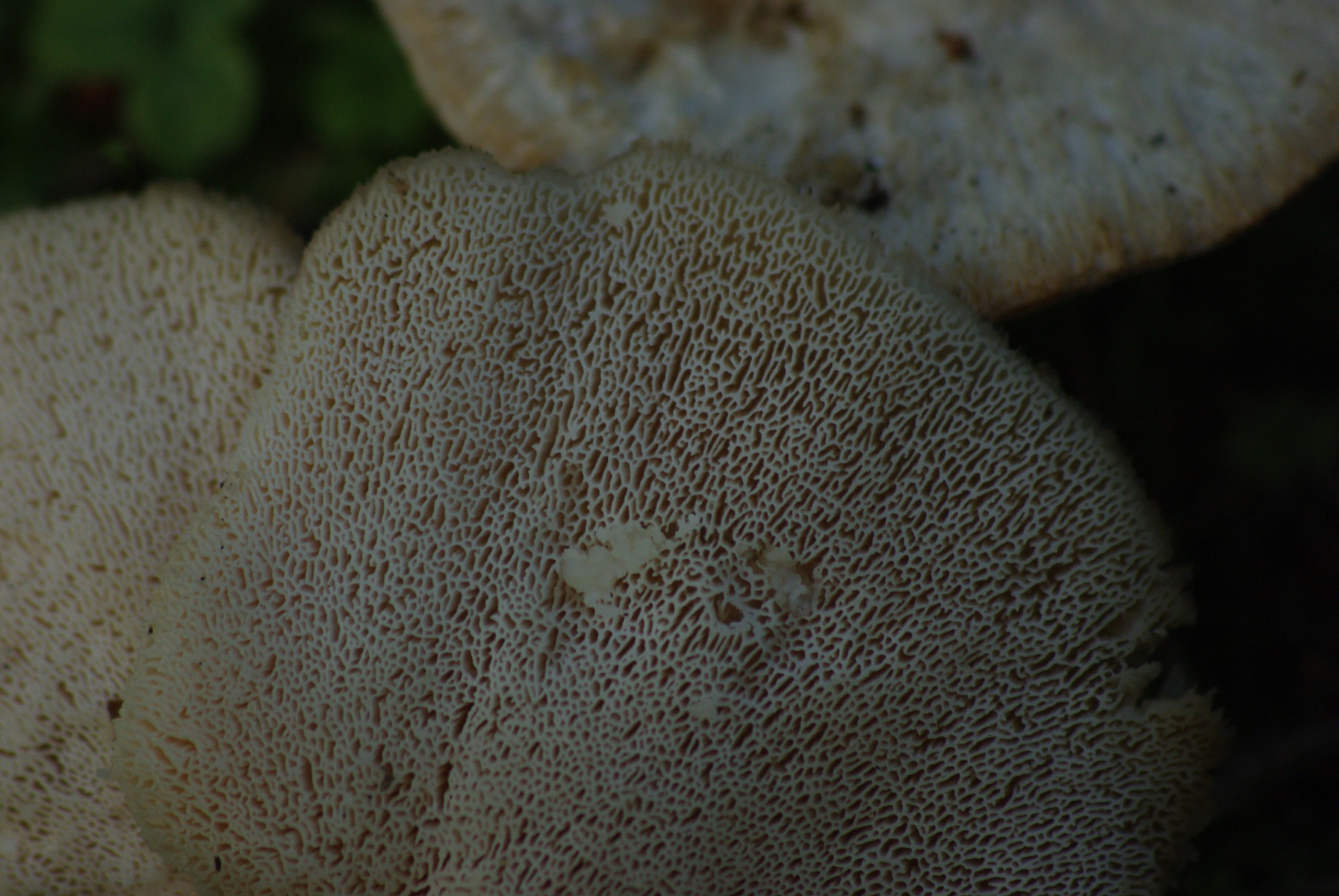 So unterschiedlich sind die Poren gar nicht. Nur bei dem oben aufsitzenden Fruchtkörper etwas mehr lacerat / irpicoid, weil da wohl das Hymenophor schräger ausgerichtet ist, nicht so wagerecht wie bei dem (vermutlich mehr konsolig wachsenden) Fruchtkörper an der Stumpfflanke.