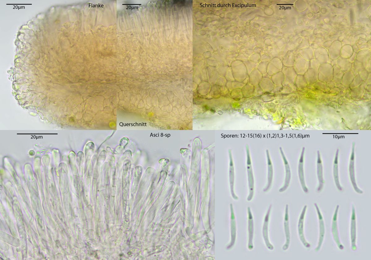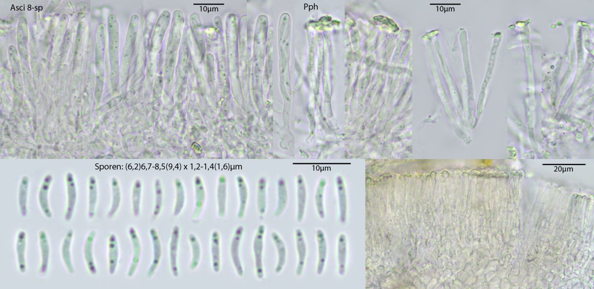Als Beispiel für eine Art an Krautstängeln habe ich mir Orbilia cardui ausgesucht. Ich habe davon mehrere Kollektionen untersucht, leider konnten die keinen Einzug mehr in die Monografie finden, die nur wenige Funde der Art enthält. Mir wurde die Art erstmals von Torsten Richter zugesandt, an Brennnesselstängeln. Keine zwei Wochen später fand ich sie selbst, an Springkraut. Beide Kollektionen hatten etwas längere Sporen als in Zottos Referenz. Farblich weicht meine von Torstens Fund durch kräftigere Orangetöne ab, aber das ist bei Orbilien häufig sehr variabel. Ich werde versuchen davon noch eine Sequenz zu bekommen.