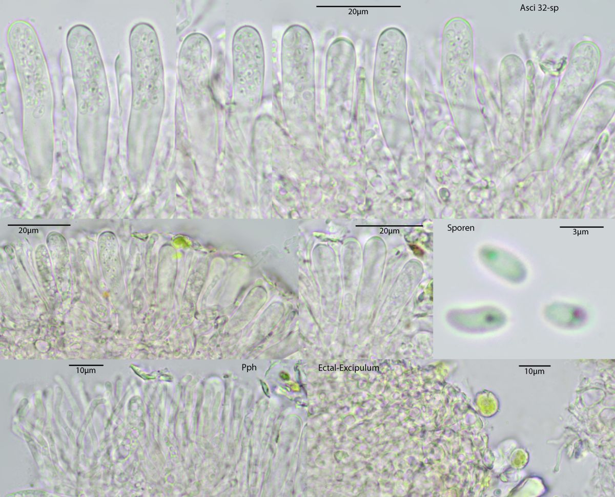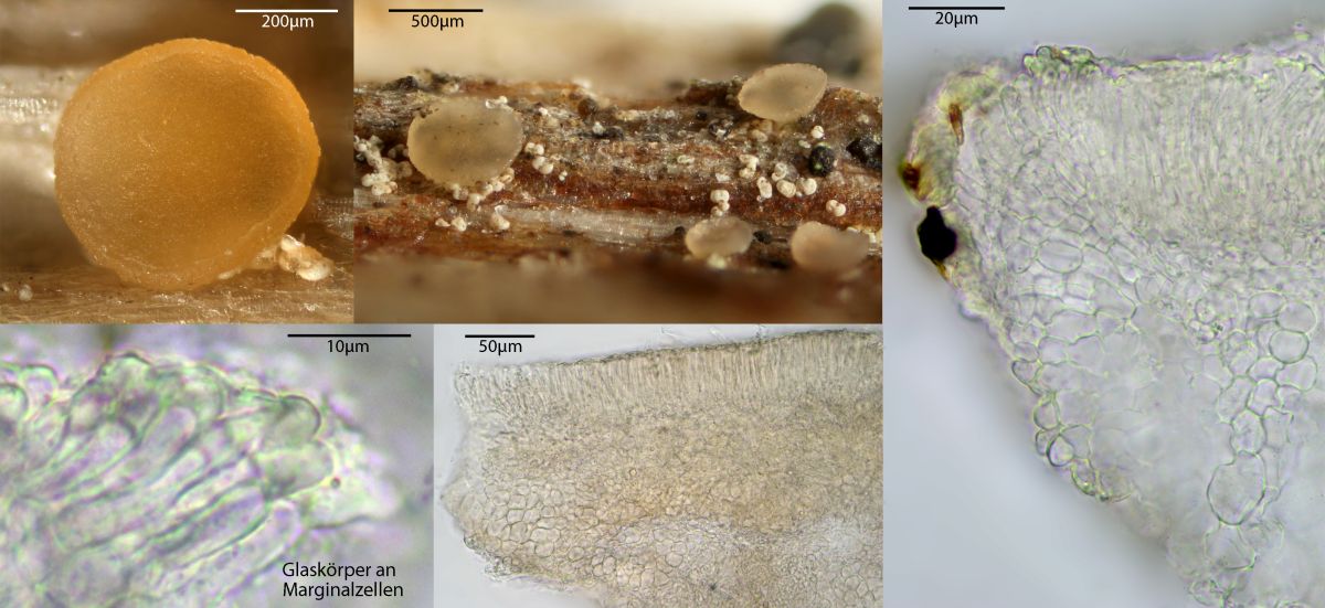 Orbilia euonymi, eine der vier aus Deutschland bekannten vielsporigen Orbilien. Die Art ist sehr klein, oft noch kleiner als die oben zu sehende O. aristata. O. euonymi ist, wie alle vielsporigen Orbilien, ein Bewohner von Trockenstandorten. Wer also welche finden will, der muss an solchem Substrat suchen. O. euonymi hat 32-sporige Asci und ist die mit Abstand häufigste vielsporige Art bei uns, besiedelt alle möglichen Substrate, z.B. Weide wie hier, Ahorn, Holunder oder sogar Nadelhölzer. In ariden Regionen der Welt gibt es eine irre Vielfalt an vielsporigen Arten, wie Zottos Monografie eindrucksvoll präsentiert.