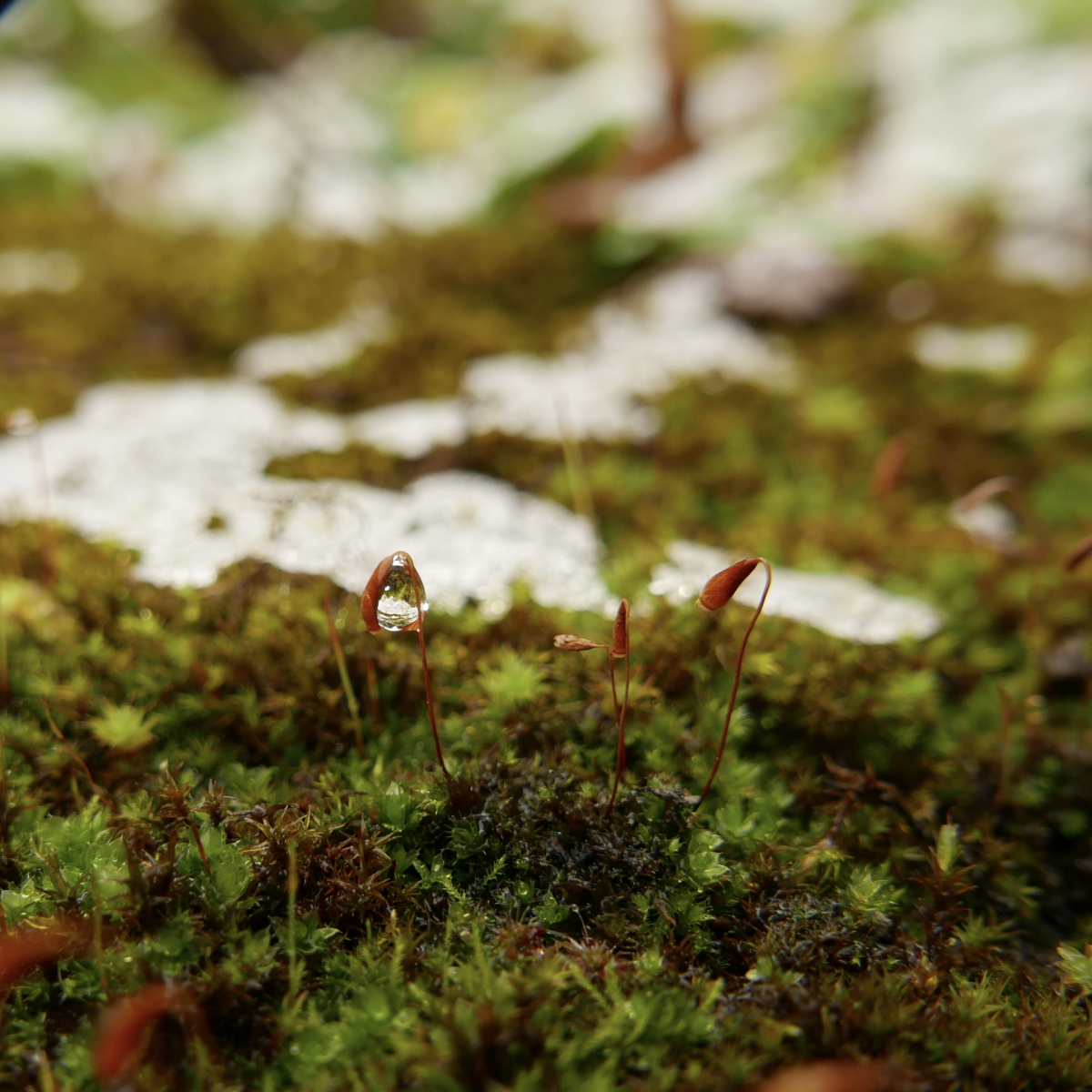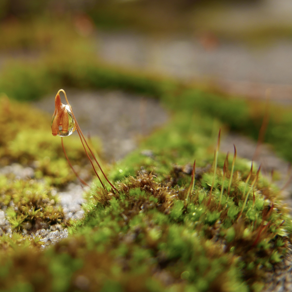 Moosigelchen mit den „Blüten“. Birnmoos, evtl. Haarblättriges Birnmoos, Bryum capillare. Ansonsten Bryum sp.