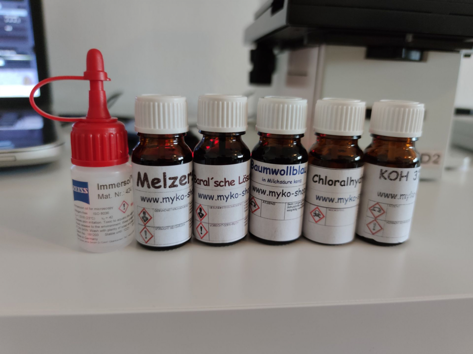 Ich gebe noch einige Chemikalien, Immersionsöl, Objektträger und Deckgläschen dazu. Ebenfalls enthalten im Paket ist ein Objektmikrometer zum Kalibrieren des Okularmikrometers.