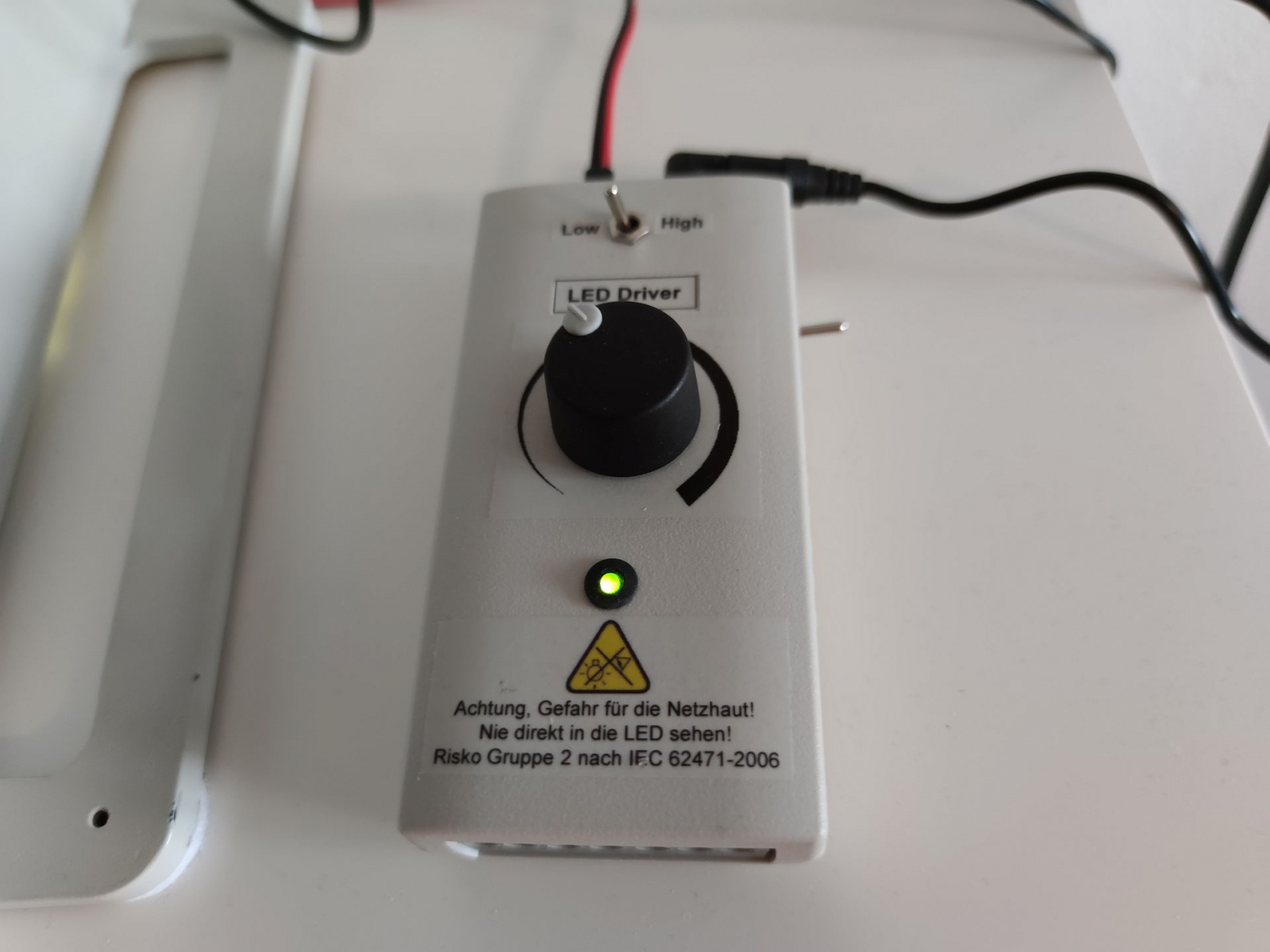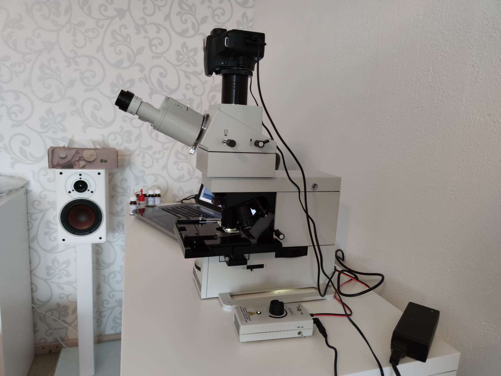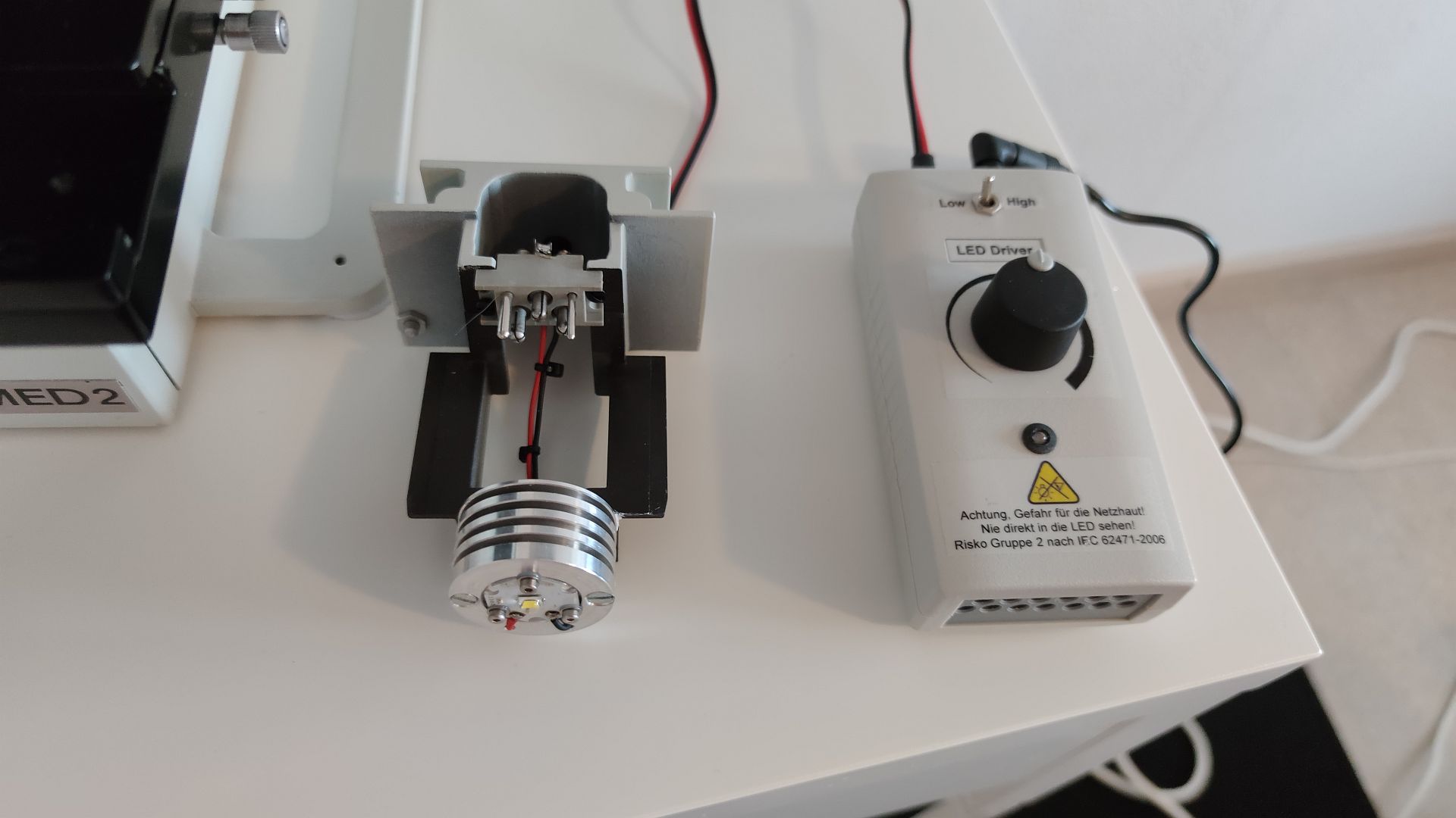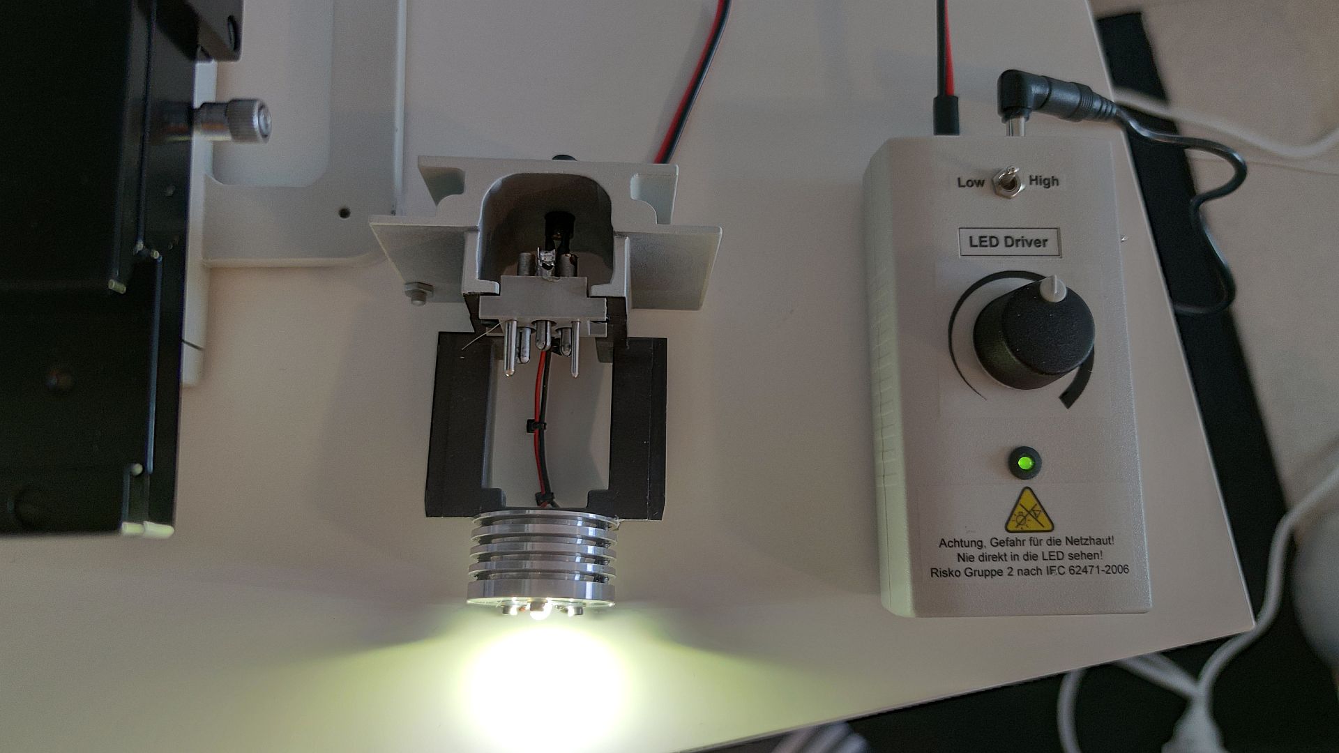 Die Beleuchtung wurde von Halogen auf LED umgebaut. Verbaut ist eine hochwertige LED mit ca. 4800K Lichtfarbe. Der Umbau wurde vorgenommen von Dr. Stephan Hiller. Herr Dr. Hiller arbeitet bei Zeiss in der Mikroskopabteilung und baut in seiner Freizeit für alle möglichen Mikroskope LED-Beleuchtungen. Die LED wurde anstelle der Halogenlampe eingebaut. Die komplette Technik der Halogenbeleuchtung wurde aus dem Mikroskop entfernt. Gesteuert wird die LED über eine separate Steuereinheit. Diese bietet durch eine Umschalthebel von Low auf High genügend Licht um auch Untersuchungen im Phasenkontrast zu ermöglichen.