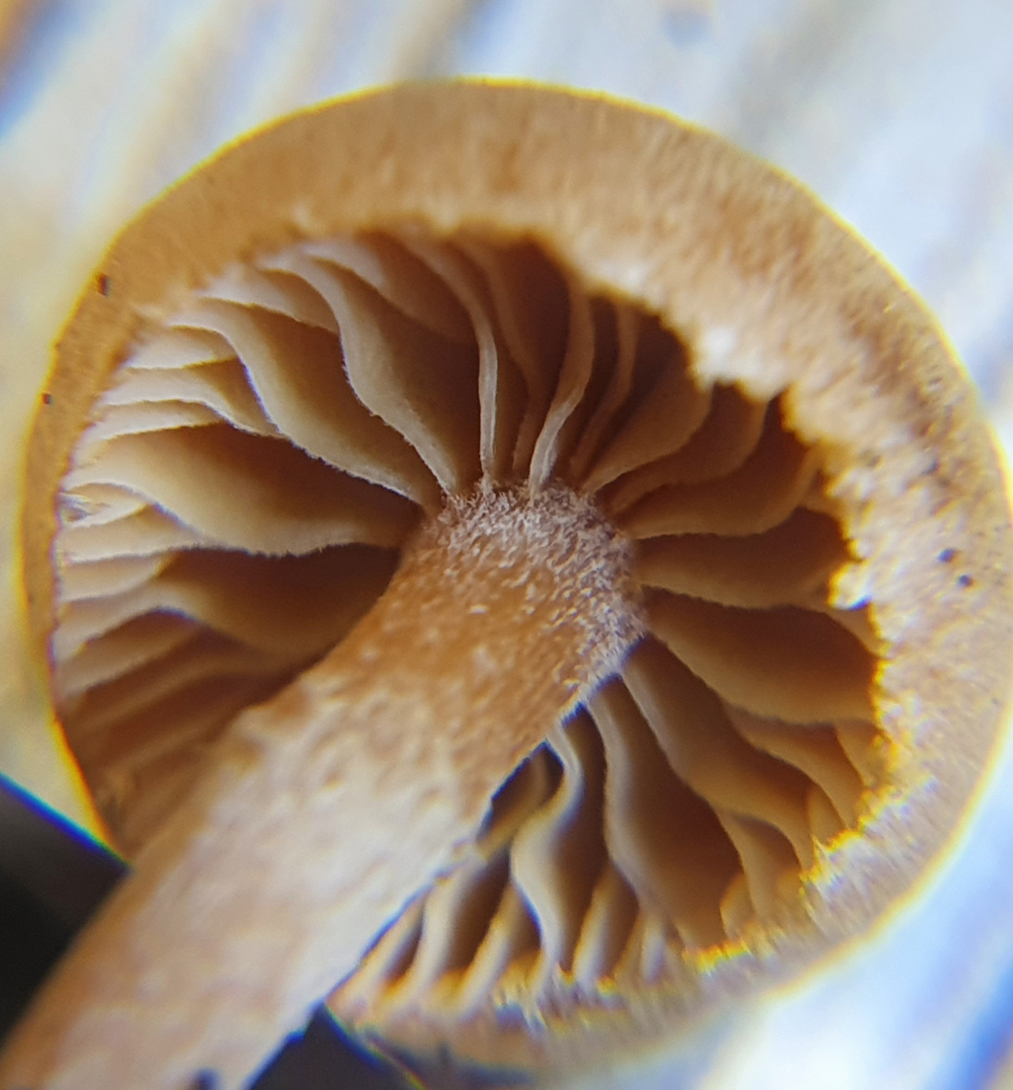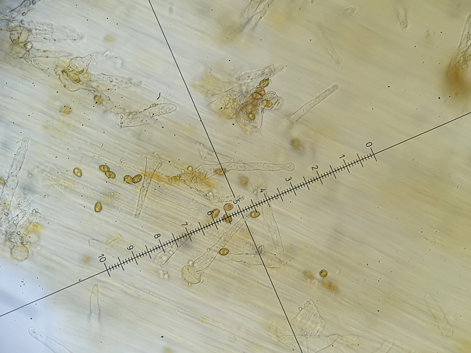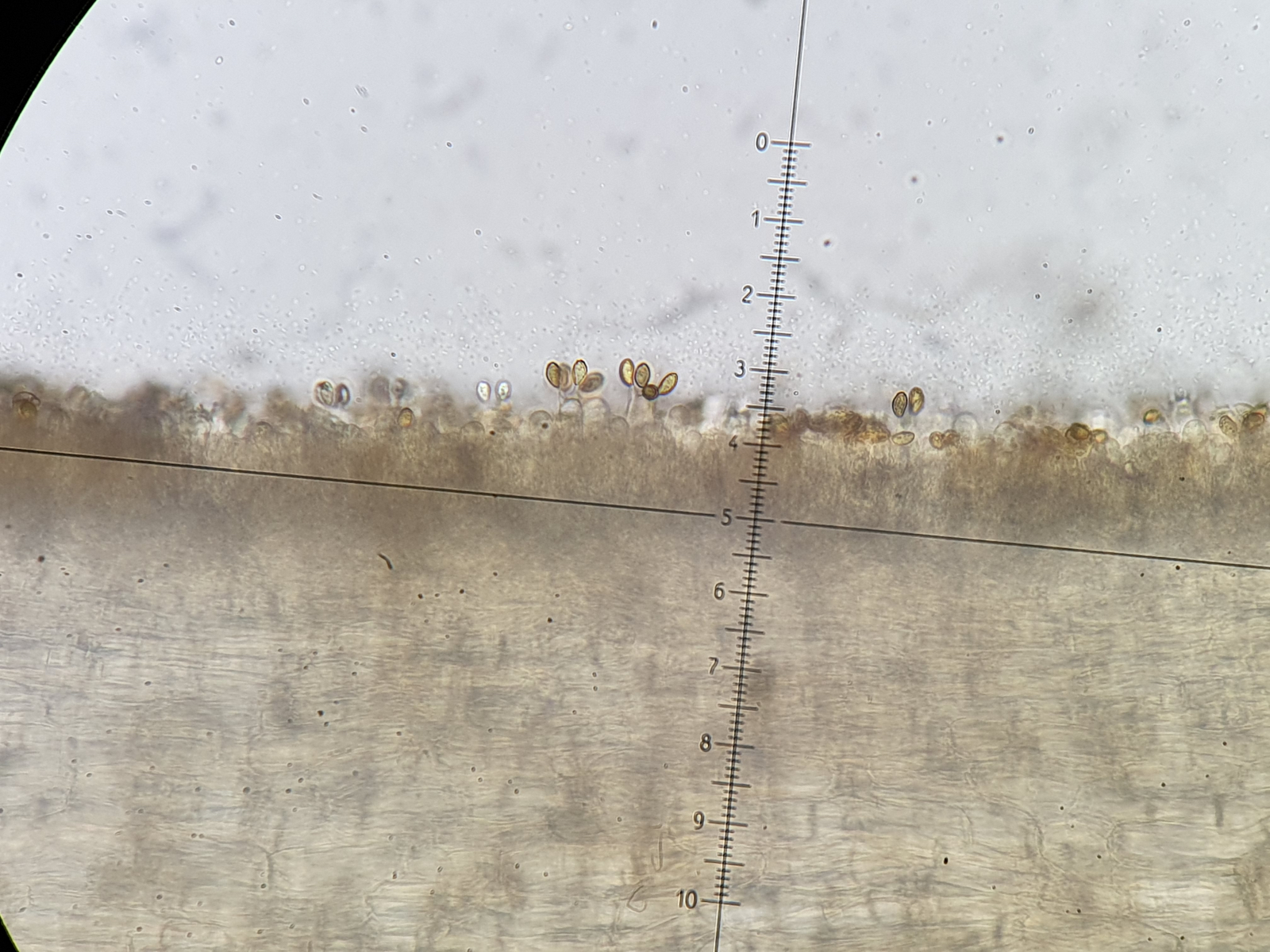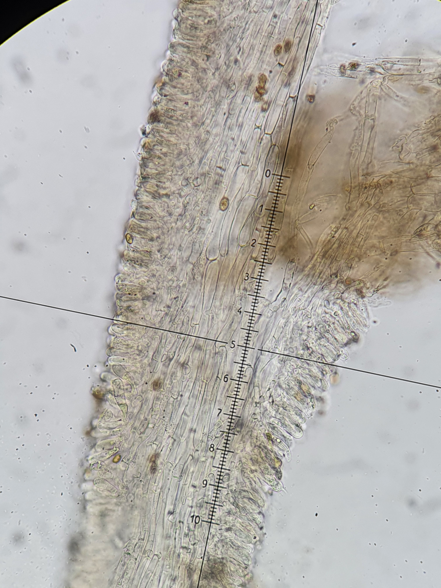 Hier war ich zuerst bei haselbraunen Hutfarben und dem gezeigten Velum bei C. fusisporus gelandet. Die Sporen erschienen mir auch schön schlank. Nach der Sporenmessung war fusisporus allerdings raus: 8,5 x 4,52 (Q=1,88). Ob fistularis passt, schien mir noch am nächsten. Wobei diesen schön und deutlich genatterten Stiel finde ich auf Inetbildern nicht so deutlich bei fistularis. Auch das eher konische des Hutes zeigt sich hier eher nicht ... Trama regulär und nicht inkrustiert (was fusisporus zusätzlich ausschließt).