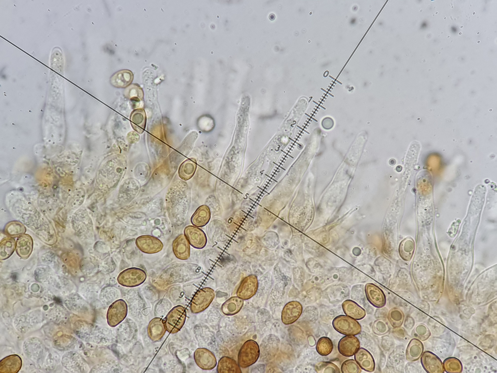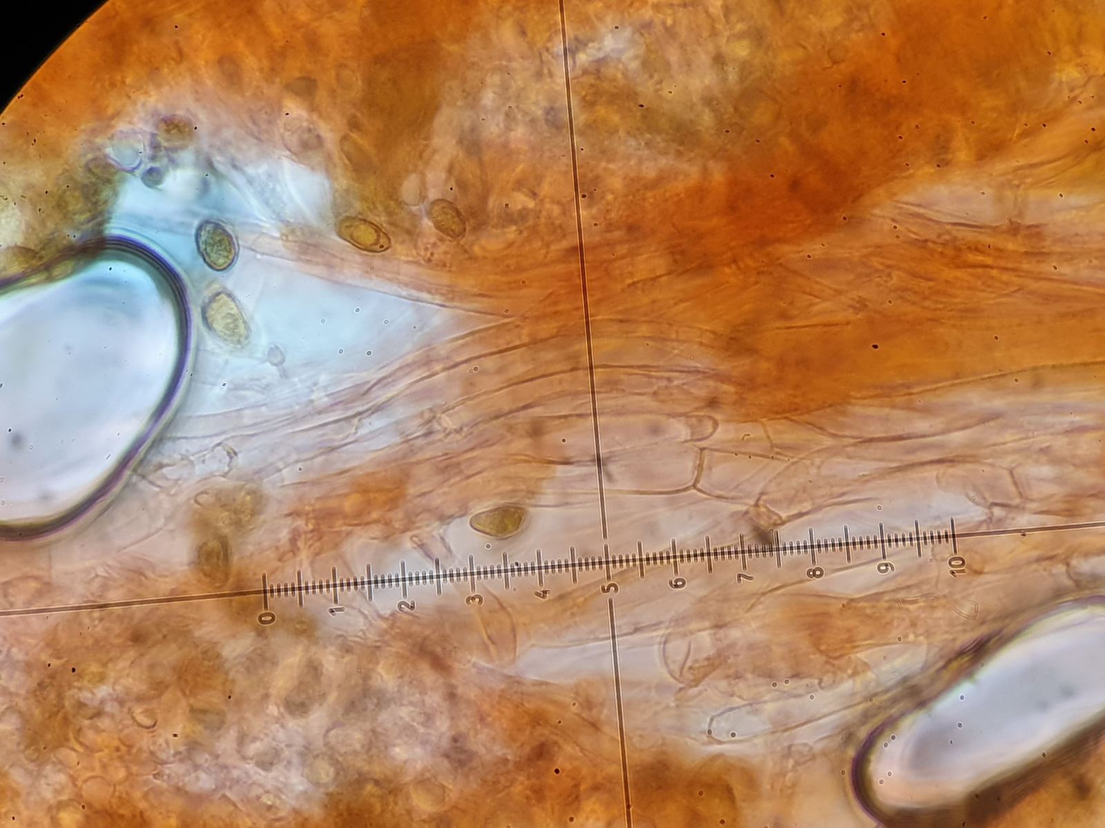 Hier war ich zuerst bei haselbraunen Hutfarben und dem gezeigten Velum bei C. fusisporus gelandet. Die Sporen erschienen mir auch schön schlank. Nach der Sporenmessung war fusisporus allerdings raus: 8,5 x 4,52 (Q=1,88). Ob fistularis passt, schien mir noch am nächsten. Wobei diesen schön und deutlich genatterten Stiel finde ich auf Inetbildern nicht so deutlich bei fistularis. Auch das eher konische des Hutes zeigt sich hier eher nicht ... Trama regulär und nicht inkrustiert (was fusisporus zusätzlich ausschließt).