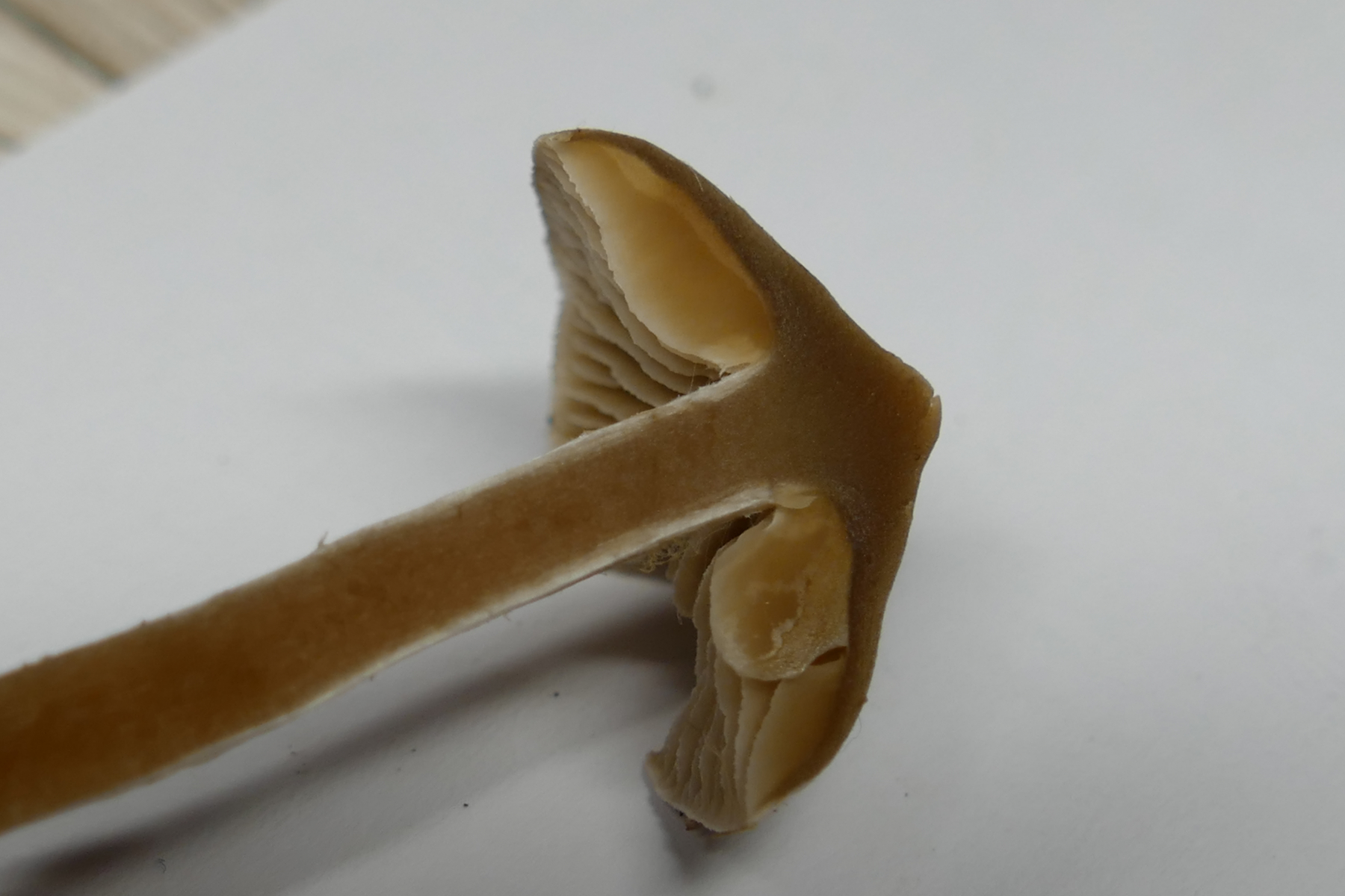 Was auch besser zu Tubaria passt sind die Lamellen. Da hatte ich mich schon gestört an "fast frei" sowohl bei vestita als auch bei velata. Das sieht man auf Karls Bildern ja sehr gut. Auf meinen Bildern erkennt man, dass die Lamellen breit angewachsen sind. Auch die weiße Bewimperung der Schneiden passt.