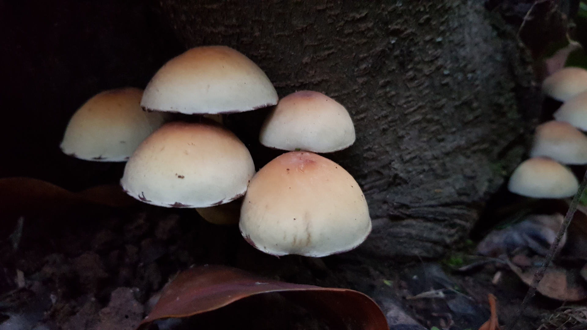 Bild 7 und 8: Schwefelköpfe? Es hat beim Fotografieren schon gedämmert. Der Stamm ist ein Kirschlorbeer