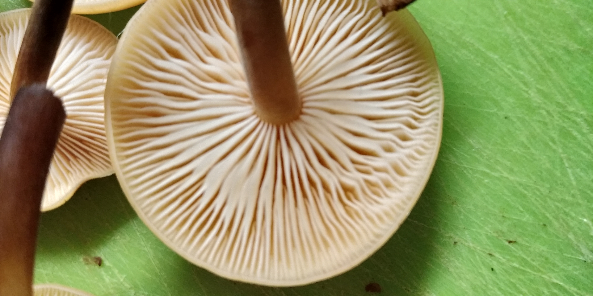 Was man aber schon mal festhalten kann: Auf dem obersten Bild in der Collage sind zwischen den Samtfüßchen auch einzelne Dunkelsporer zu sehen. Die sind aber nicht bestimmbar, zumal man teils nur oberseits von braunem Sporenstaub bepuderte Hüte sieht (bei zwei aber auch die Lamellen, die nicht zu Samtfüßchen passen).