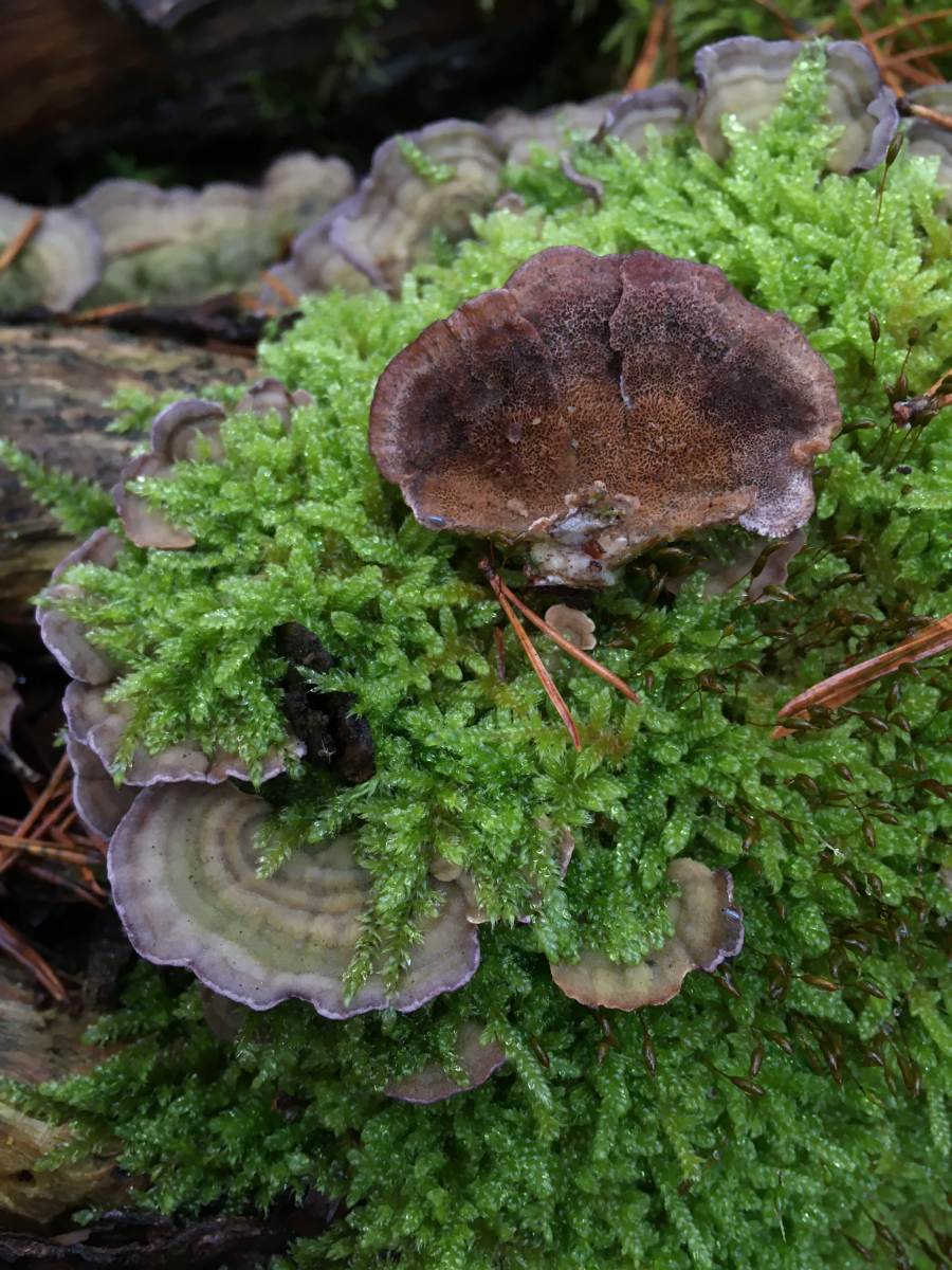a) hier dachte ich zuerst an eine spitzige Thelephora (wäre nicht anthocephala sondern caryophyllea, Merci Pablo) aber nach dem Lupfen dann doch ein gebänderter Dauerporling (Coltricia perennis)