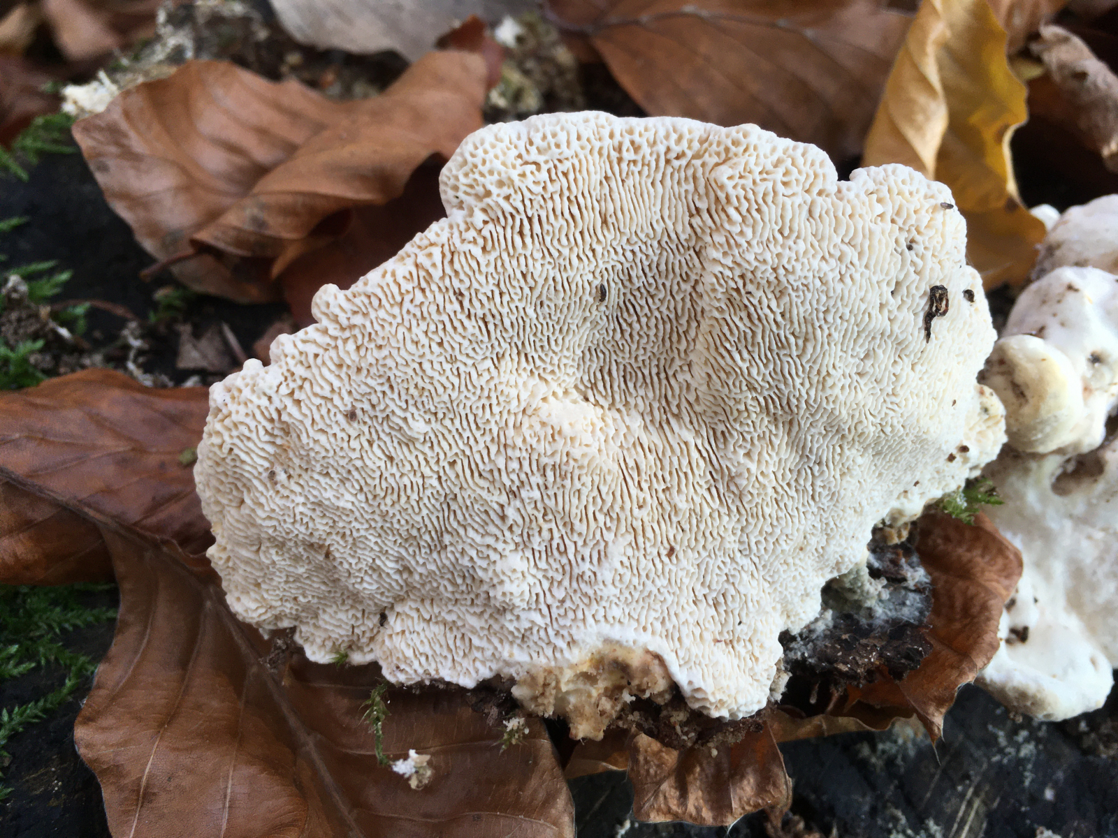 b) ein weisser Porling an Laubholz wegen der labyrrrh. ach ihr wisst schon- die buckelige Tramete (Trametes gibbosa cf)?