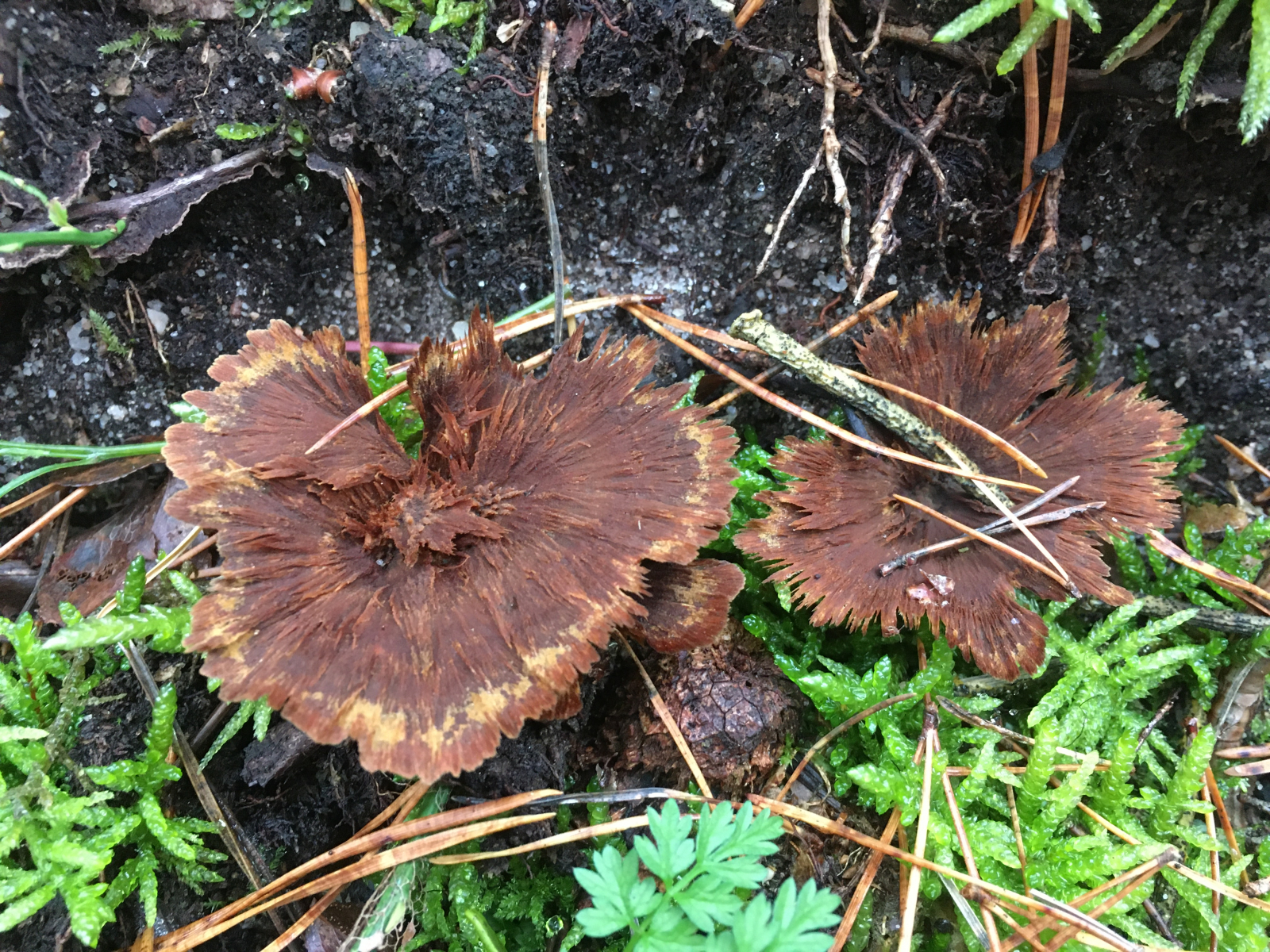 a) hier dachte ich zuerst an eine spitzige Thelephora (wäre nicht anthocephala sondern caryophyllea, Merci Pablo) aber nach dem Lupfen dann doch ein gebänderter Dauerporling (Coltricia perennis)