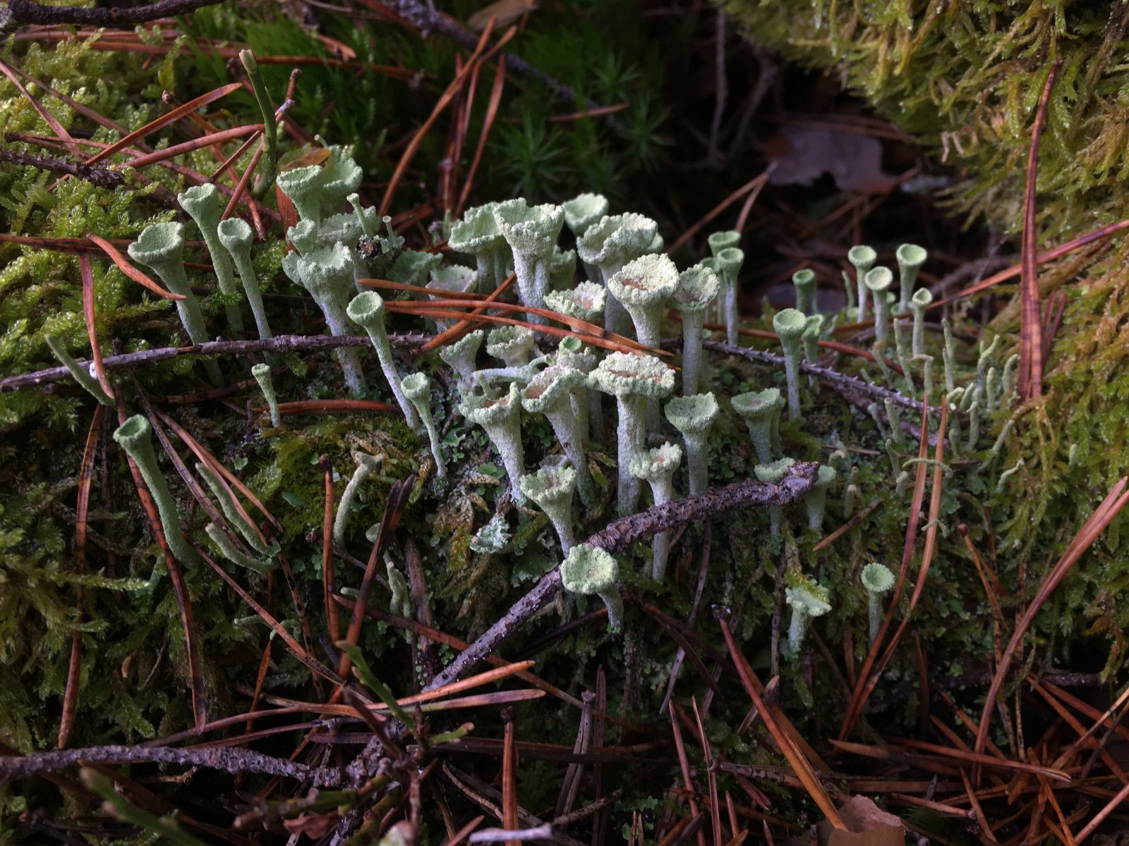d) und über den habe ich mich sehr gefreut: brennend scharfer Ritterling (Tri. virgatum) auf einem sonnenexponierten staubtrockenen Steilhang. Ich hätte hier nie mit Pilzen gerechnet und war eigentlich nur genervt dass ich da rüber musste um an den Flusslauf zu kommen. Leider habe ich direkt dort kein Umgebungsfoto gemacht, erst als ich oben war wollte ich die schönen Flechten dokumentieren: