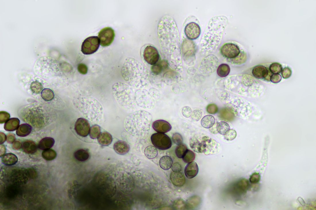 Aber die Sporenzahl in den Asci ist spannend: Meist 4-sporig, bzw. mit 4 gut ausgebildeten Sporen, vermutlich wurden da weitere zurückgebildet, aber es kommen auch solche mit 2 bis 6 reifen Sporen vor. Mit 8 erkennbaren Sporen war aber kein einziger Ascus zu sehen. Gut möglich aber, dass die alle 8-sporig sind und nur eine unterschiedliche Zahl zurückgebildet wird. Bei manchen offenbar geschädigten Asci hat man im Inneren eine Vielzahl kleiner sporenartiger Elemente, auch deutlich mehr als 8 (viertes Teilbild von links). Entsprechend der unterschiedlichen Sporenzahl sind die Sporen sehr variabel in der Größe. Alle Strukturen IKI-.