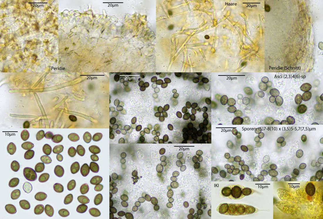 Bei anderen Funden gibt es folgende Abweichungen: Die Asci können offenbar auch konstant 4-sporig sein, auch gibt es Kollektionen bei denen nicht alle Sporen zwei Keimporen zu haben scheinen. In wie weit das alles das Gleiche ist wird nur die Genetik künftig zeigen können. Für den Fall einer Sequenzierung habe ich in jedem Fall alles aufgehoben, was ich von dem Pilz hatte (> 20 Exemplare).