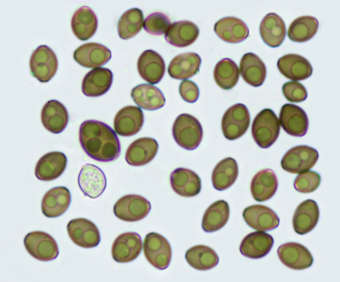 Sporen beidseitig mit Keimporus, (5)7-8(10) x (3,5)5-5,7(7,5) µm, wobei die in Klammern angegebenen Größen durchaus regelmäßig vorkommen, aber sicher auf die unterschiedliche Anzahl in den Asci zurückzuführen sind.: