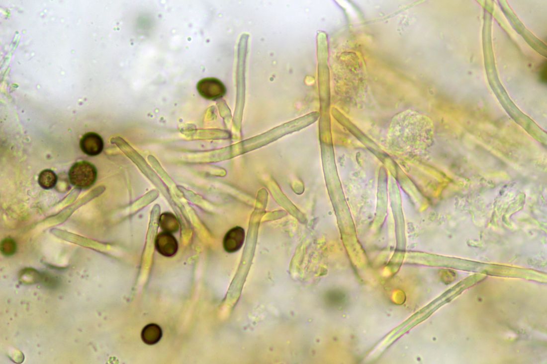 Die Innereien sind dann ziemlich spannend, kurze meist nur bis 75 µm (selten 100 µm) lange, helle, dickwandige Haare verteilen sich an den Fruchtkörpern: