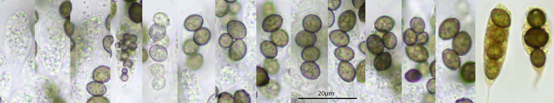 Sporen beidseitig mit Keimporus, (5)7-8(10) x (3,5)5-5,7(7,5) µm, wobei die in Klammern angegebenen Größen durchaus regelmäßig vorkommen, aber sicher auf die unterschiedliche Anzahl in den Asci zurückzuführen sind.: