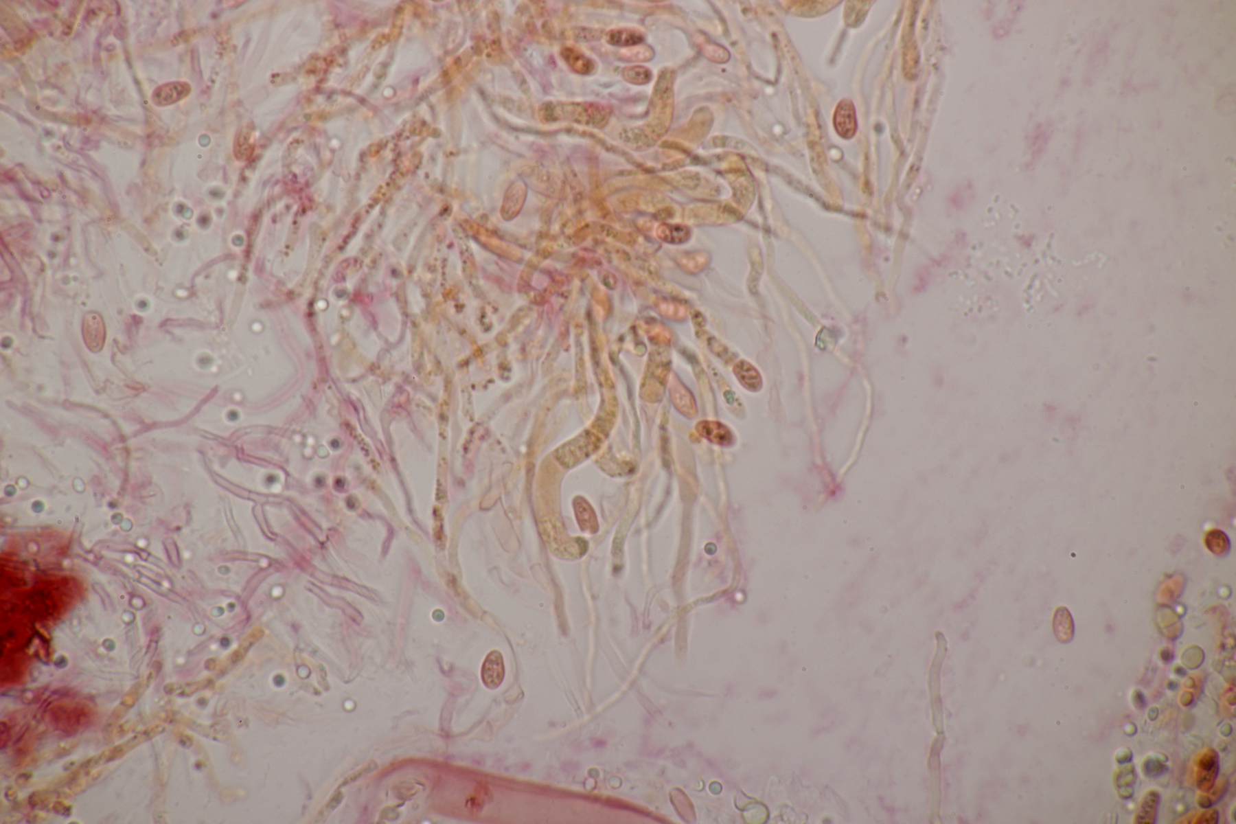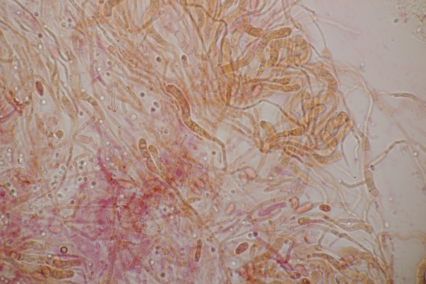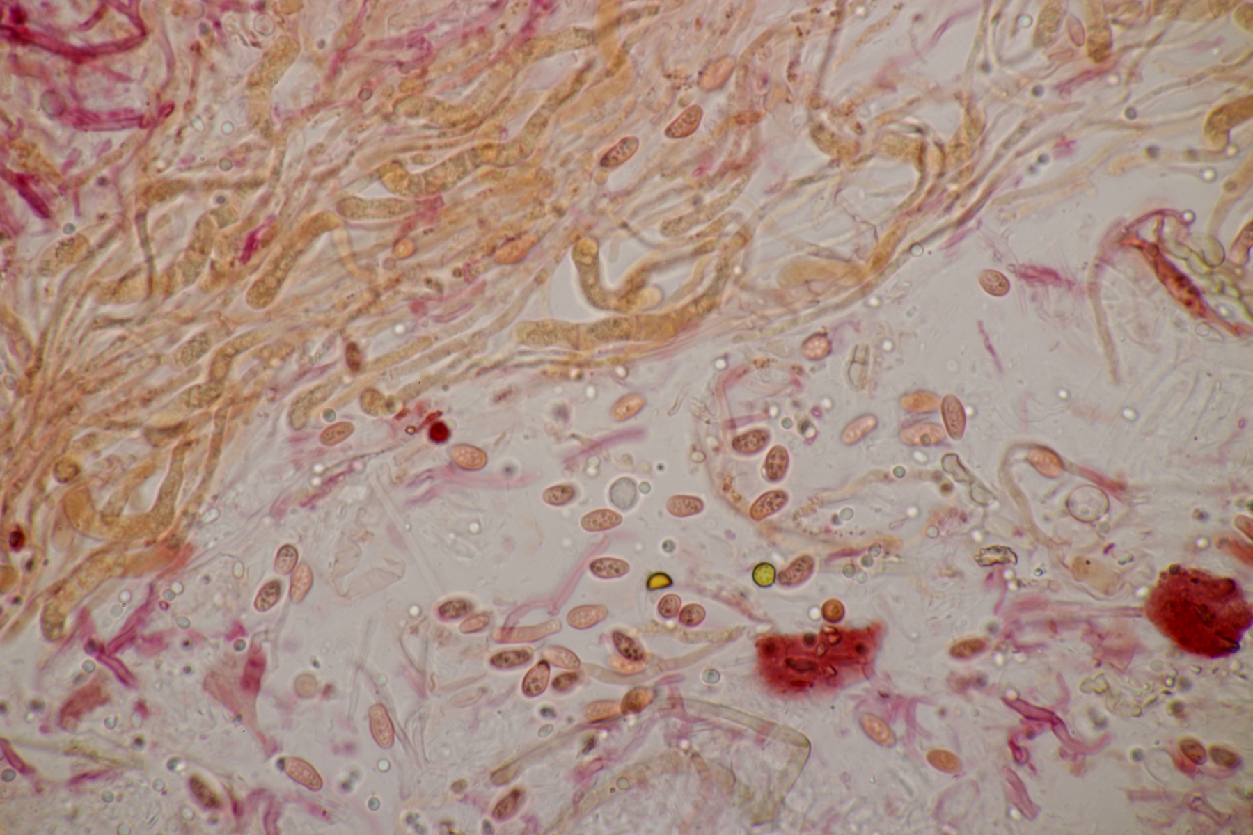 Sporenmaße sind (7.1+-0.4) µm x (3.8+-0.2) µm, Q=1.9+-0.2 bzw. (6.4-8.2) µm x (3.2-4.2) µm, Q=1.7-2.3. Schnallen sind vorhanden. Basidien sind 4-sporig. Ich hab versucht mit dem Schlüsseln von Phragmoproject zu arbeiten (die übrigens ganz grundsätzlich sehr zu empfehlen sind), aber habe da bislang noch keinen durchschlagenden Erfolg. Mit dem Generalschlüssel würde ich am ehesten bei Achroomyces s.l. landen, aber da lande ich dann keinen guten Treffer.