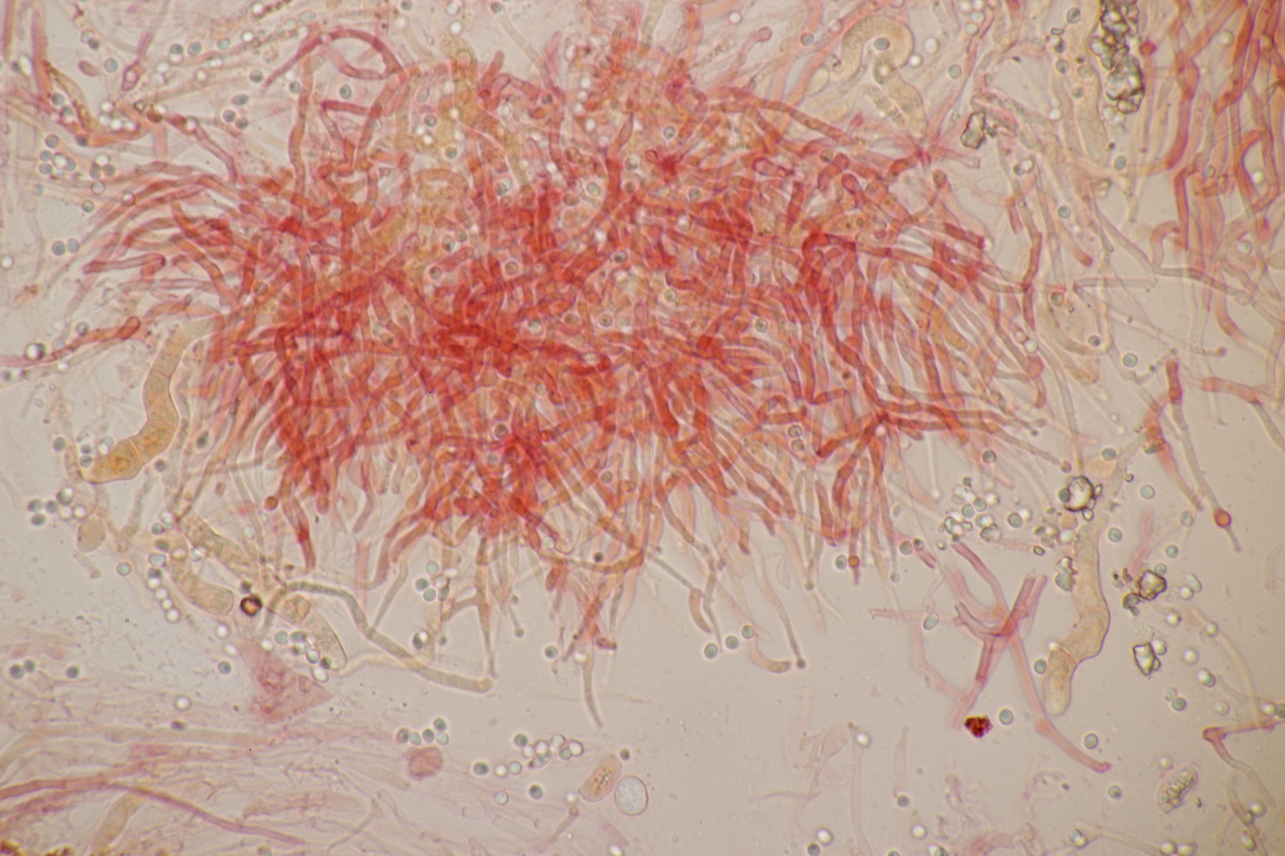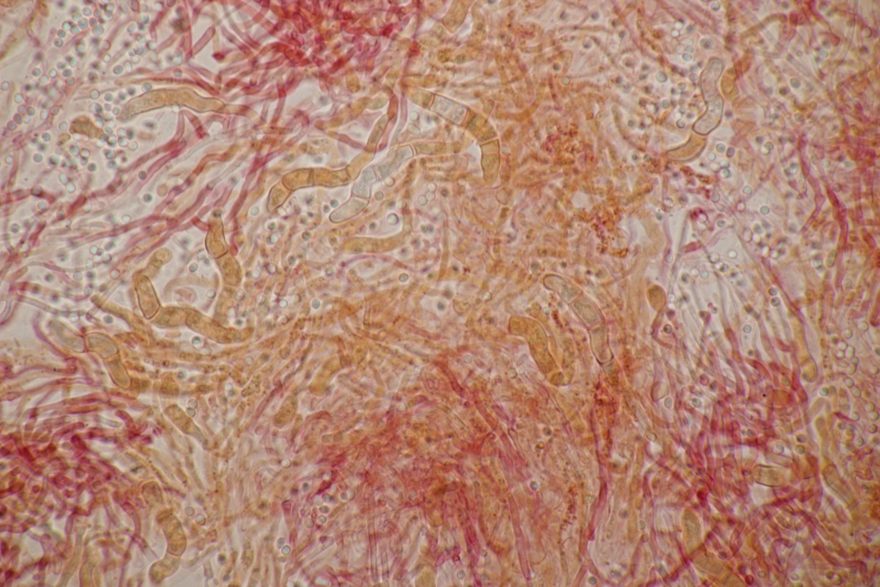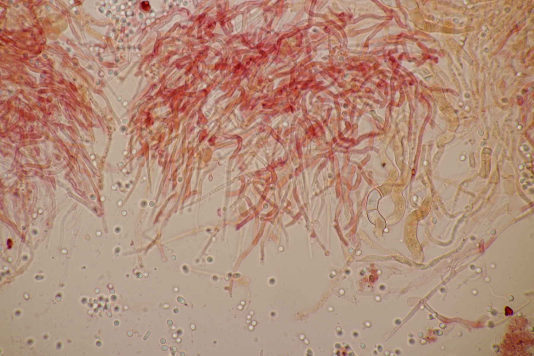 Sporenmaße sind (7.1+-0.4) µm x (3.8+-0.2) µm, Q=1.9+-0.2 bzw. (6.4-8.2) µm x (3.2-4.2) µm, Q=1.7-2.3. Schnallen sind vorhanden. Basidien sind 4-sporig. Ich hab versucht mit dem Schlüsseln von Phragmoproject zu arbeiten (die übrigens ganz grundsätzlich sehr zu empfehlen sind), aber habe da bislang noch keinen durchschlagenden Erfolg. Mit dem Generalschlüssel würde ich am ehesten bei Achroomyces s.l. landen, aber da lande ich dann keinen guten Treffer.