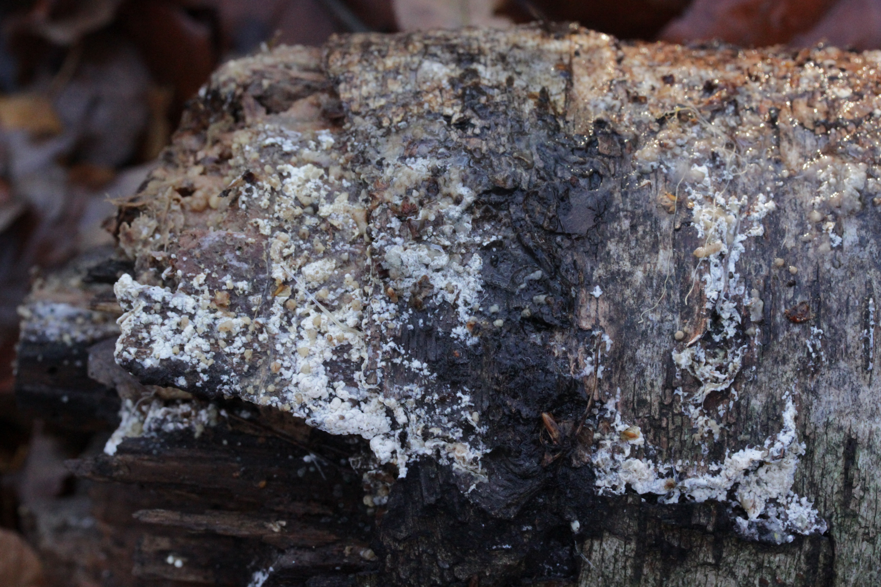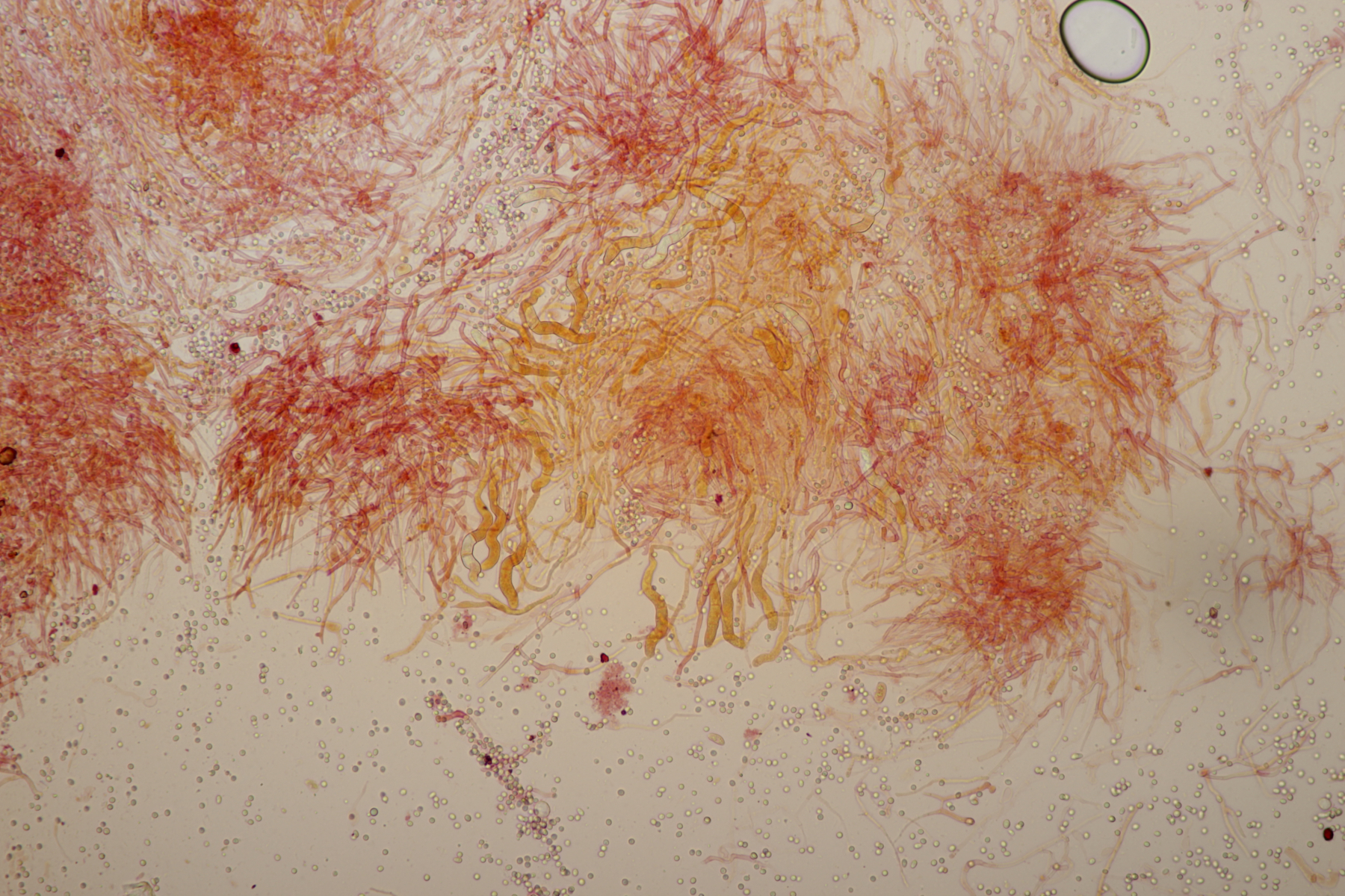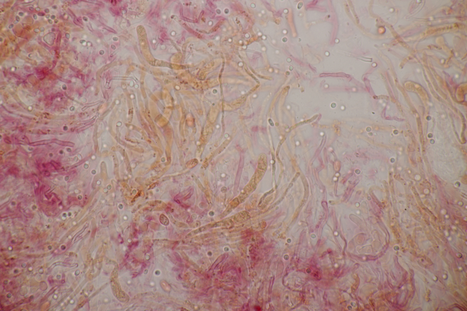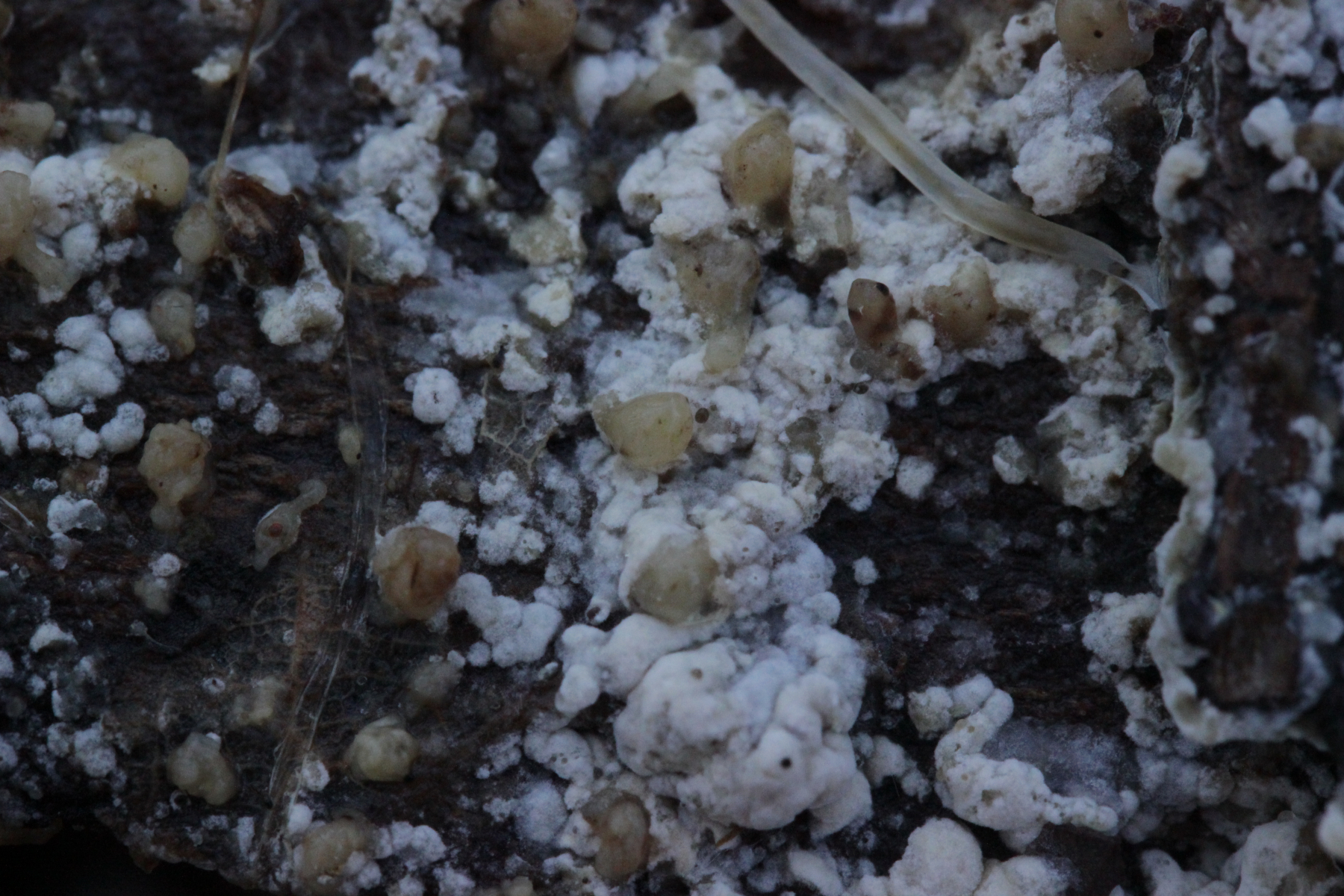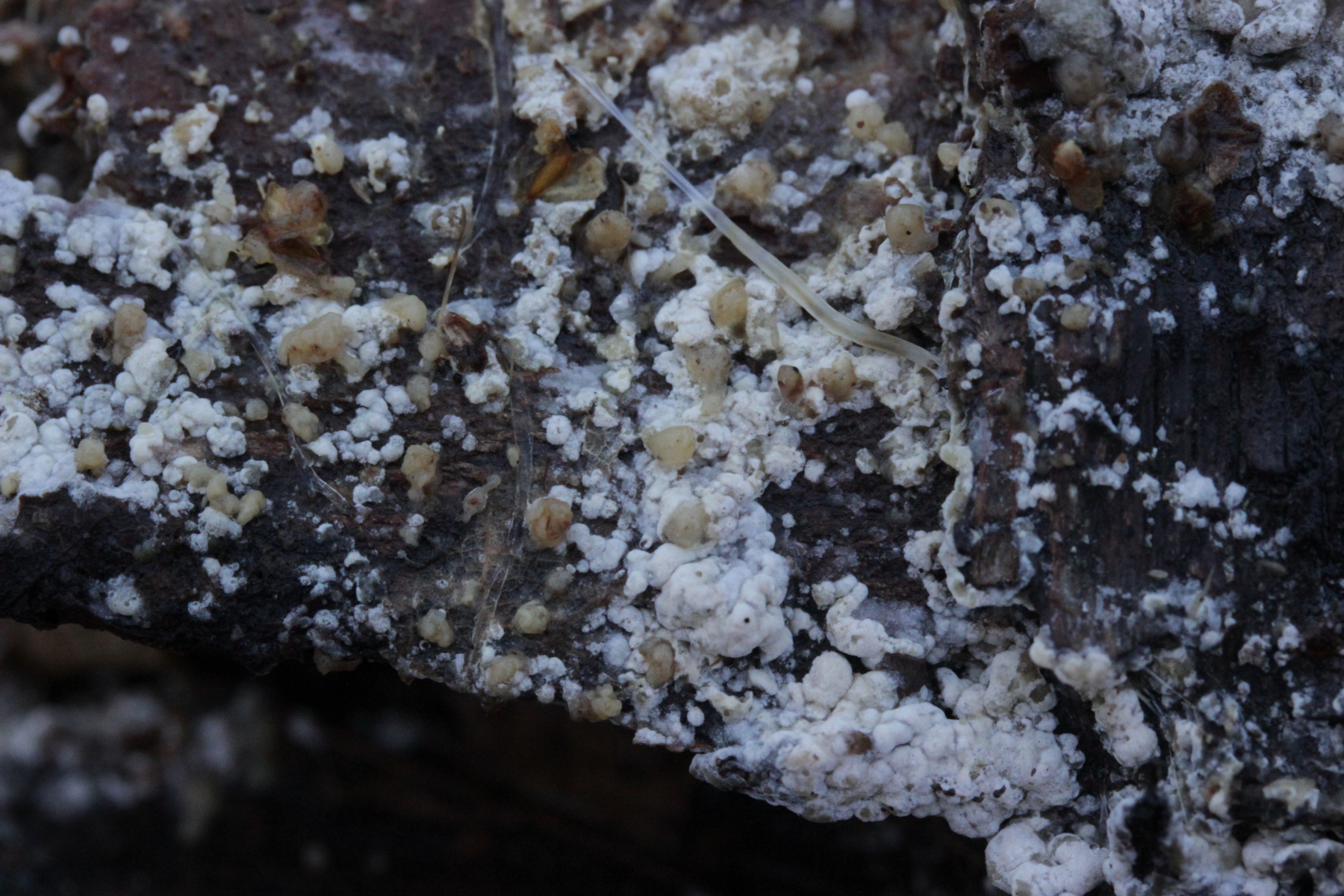 am letzten Samstag war ich in der Nähe von Hinsbeck im NSG Krickenbecker Seen unterwegs. Dabei habe ich unter anderem diesen Pilz hier gefunden, bei dem ich nicht so richtig zum Ziel komme und Euch um Rat fragen wollte. Makroskopisch sah das auf den ersten Blick nach einem der zahlreichen weißen Rindenpilze auf der Unterseite eines am Boden liegenden Birkenstammes aus. Beim zweiten Blick fielen mir dann aber kleine gelbe Knubbel darauf auf. Nun gibt es ja einige Heterobasidiomyceten, die auf anderen Pilze parasitieren und dabei sehr unscheinbare Fruchtkörper bilden. Also hatte ich ein Stück eingepackt und zu Hause unters Mikrokop gelegt. Dort die Überraschung: Von einem normalen Rindenpilz war weit und breit nichts zu sehen. Stattdessen gab es einerseits eine Anamorphe mit Unmengen an winzigen, runden Konidien. Dazwischen dann aber tatsächlich ein Heterobasidiomycet mit Auricularioiden Basidien. Interessanterweise war es nicht so, daß die gelben Knubbel dem Heterobasidiomyceten und die weißen Stellen der Anamorphe entsprachen. Es war eher so, daß die gelben Knubbel wohl hauptsächlich Konidienmasse waren, während der Parasit dann überwiegend in den weißen Partien in der Anamorphe saß. Ob Anamorphe und Teleomorphe zusammengehören oder die Teleomorphe die Anamorphe parasitiert?