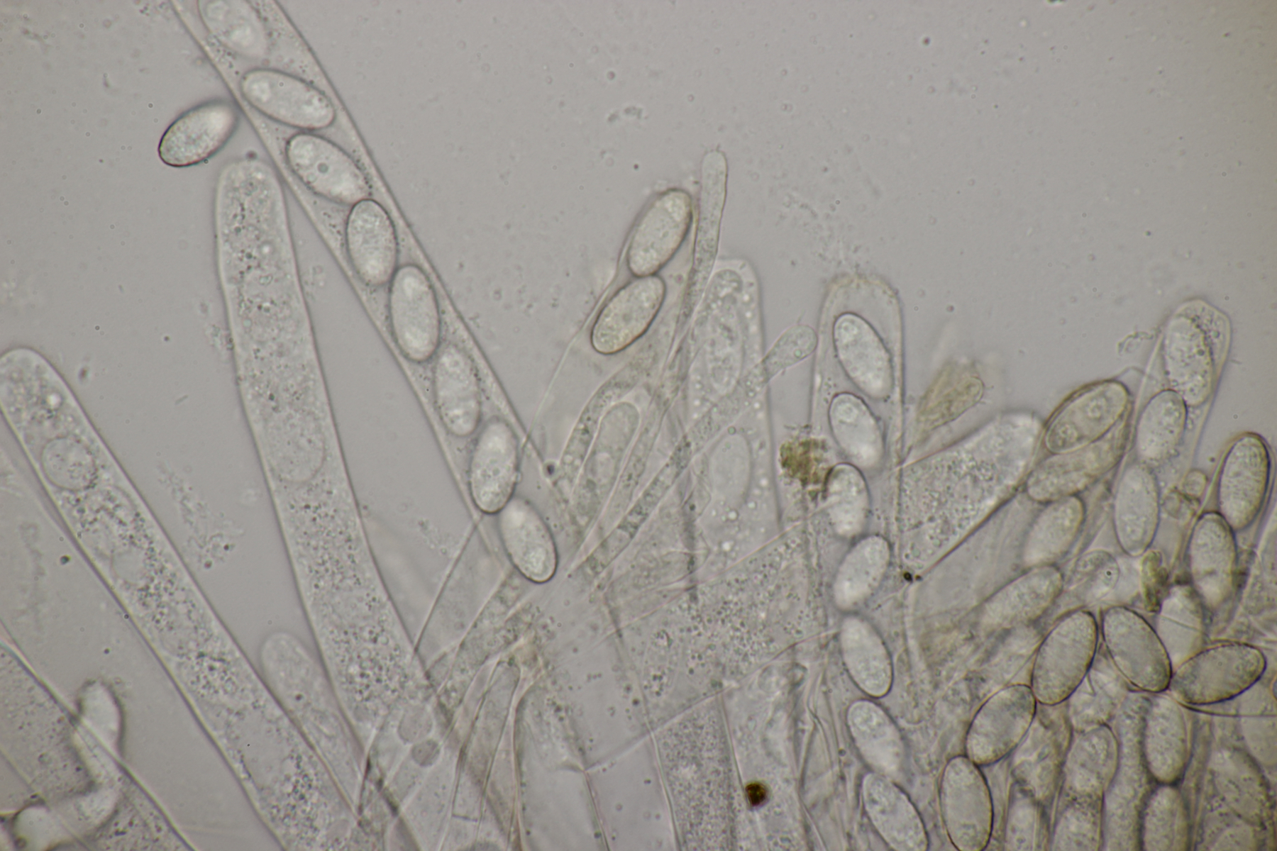2. Keulchen an altem Pappelblatt. Die Sporen messen (7.7+-0.3) µm x (3.2+-0.2) µm, Q=2.4+-0.1 bzw. (7.0-7.9) µm x (2.9-3.6) µm, Q=2.2-2.6, Basidien sind 4-sporig, Schnallen sind abwesend, der Stiel ist glatt, aber mit kleinen Kristallkrümeln bedeckt. Wenn ich es richtig sehe, gibt es keine Sklerotien. Damit lande ich am ehesten bei Typhula/Pistillaria pusilla. Was meint ihr? EDIT: Klaus Siepe schrieb mir, daß T. setipes/pusilla/villosa ein Formenkreis ist, der nicht weiter aufgedröselt worden ist bzw. sogar alles die selbe Art ist.