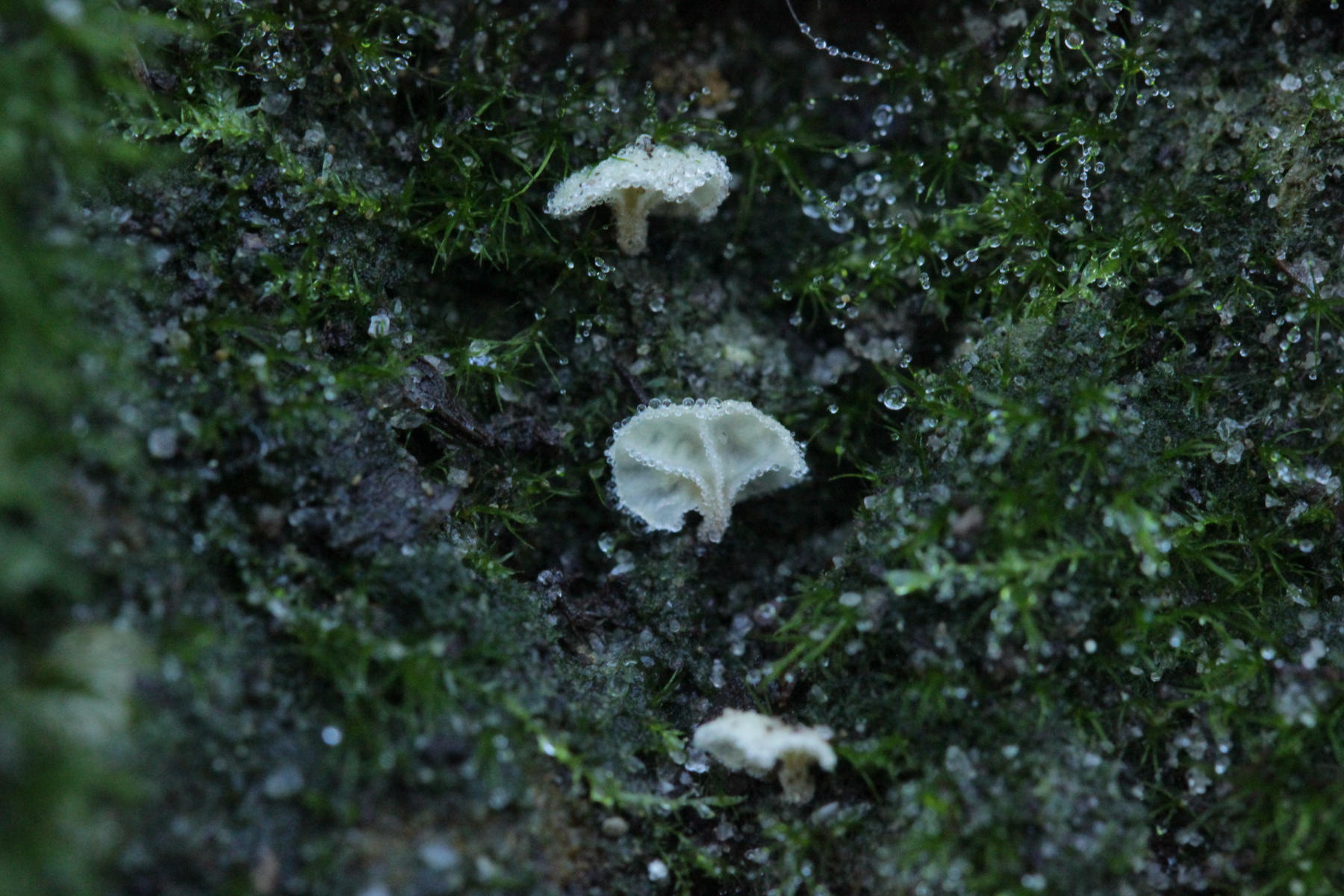 Wenn diese braunen, warzigen Sporen tatsächlich zu diesem fruchtkörper gehören, wäre das dann nicht irgendwas aus dem Umfeld von Chromocyphella muscicola?