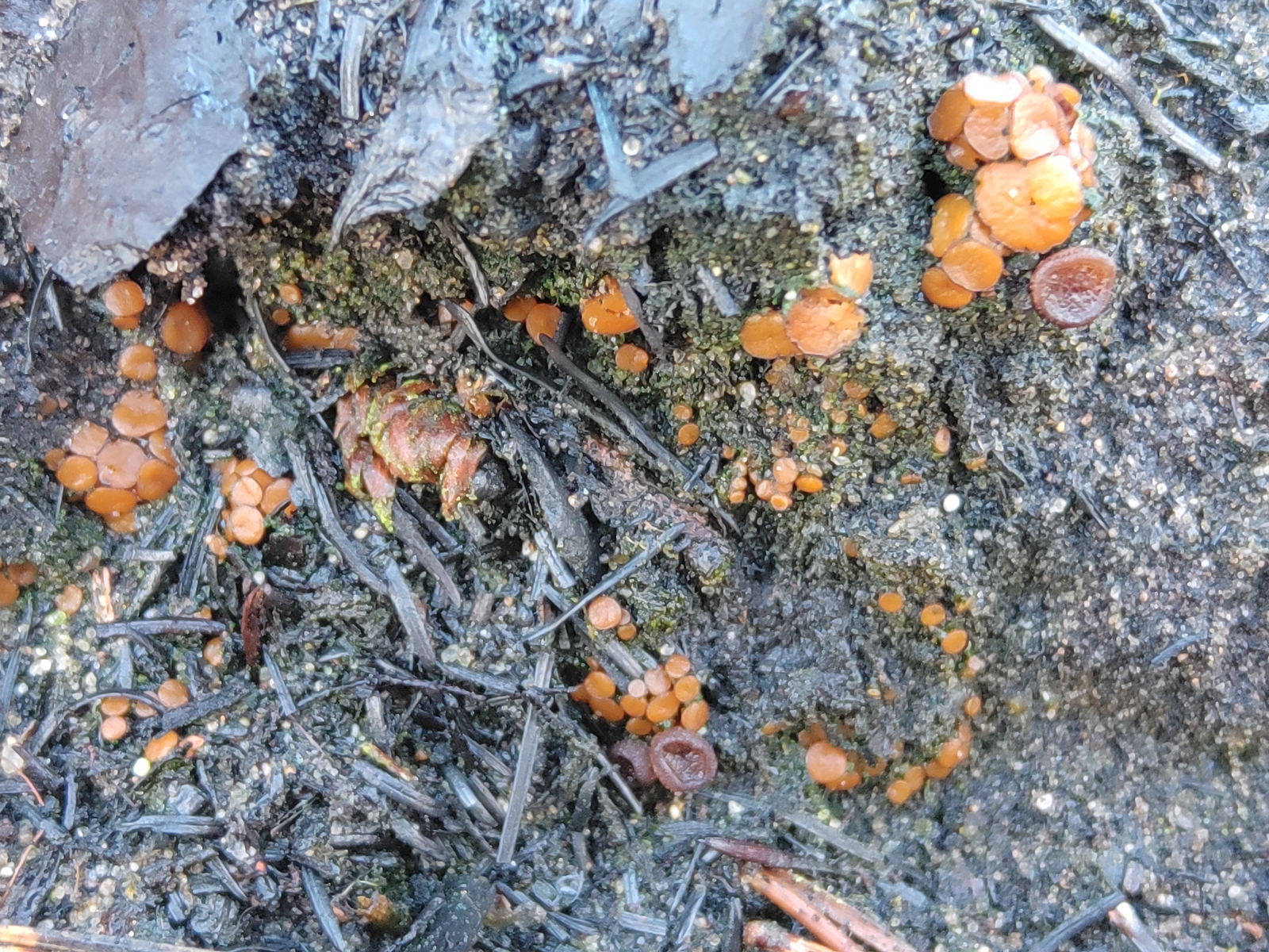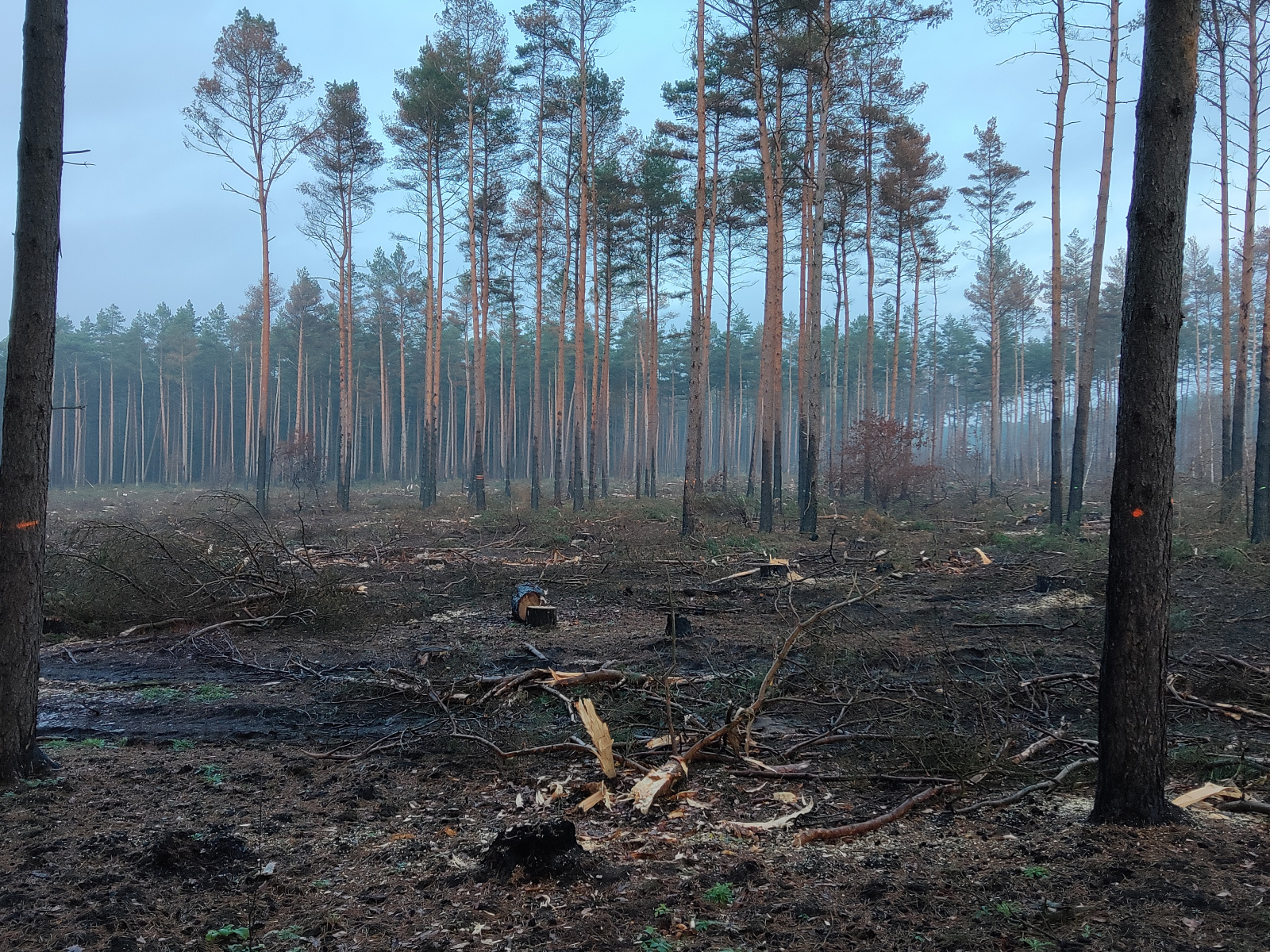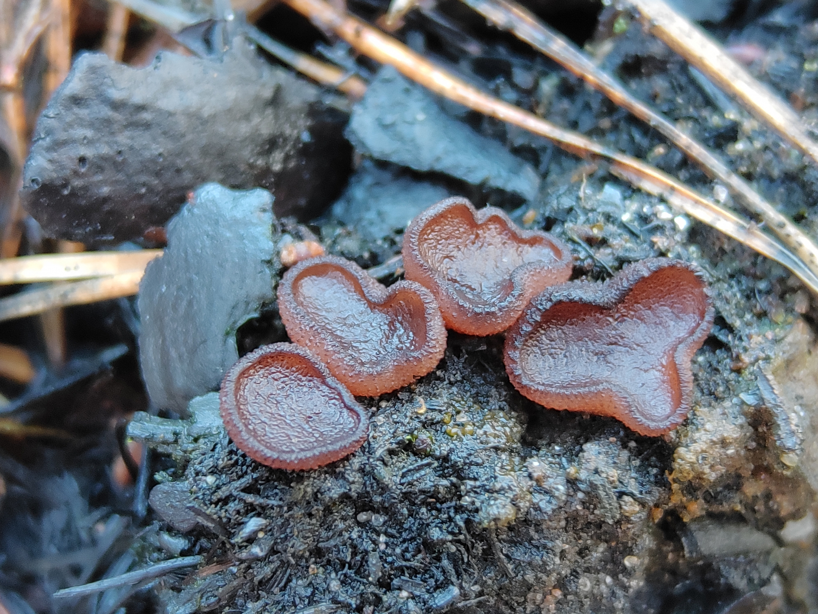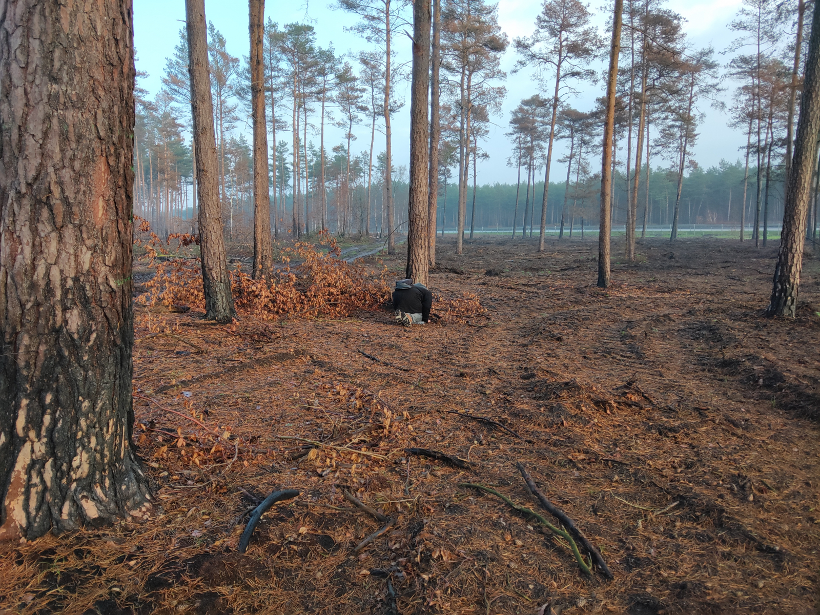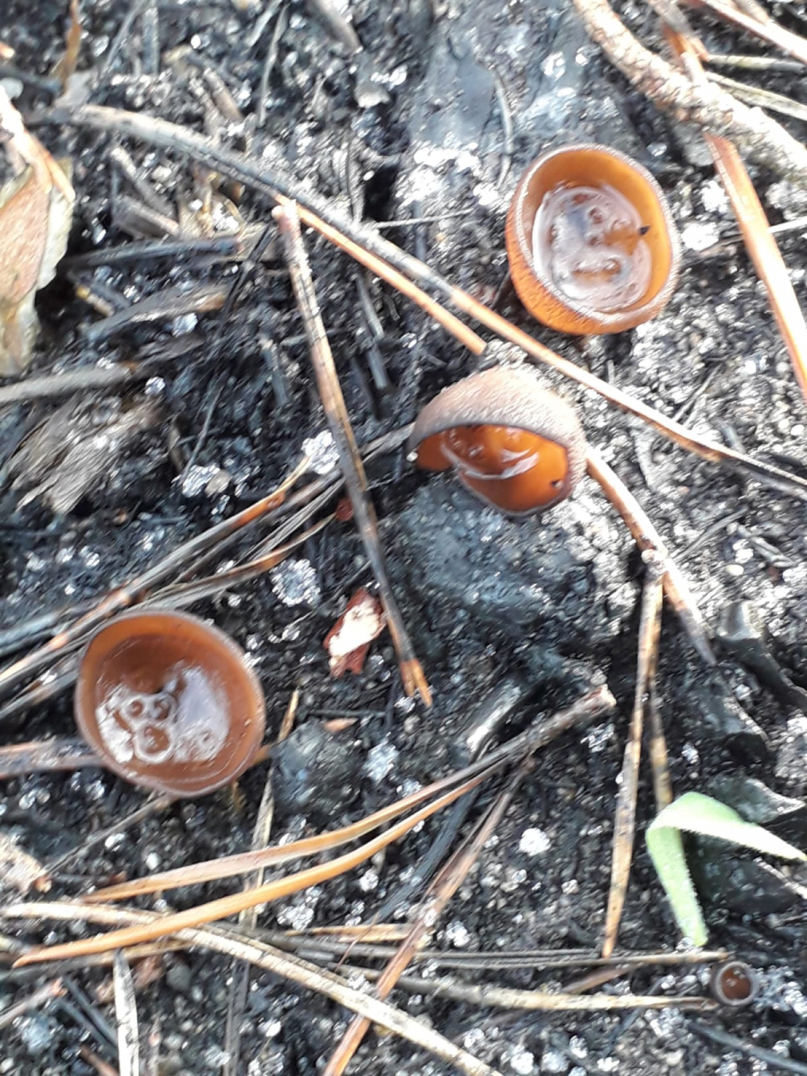 ich möchte euch gerne von einer Exkursion berichten, die ich am Sonntag zusammen mit Eike unternommen habe. Im August gab es in der Südheide direkt an der A7 einen durch einen Reifenplatzer eines LKW verursachten Böschungsbrand, der sich auf den benachbarten Kiefernwald ausbreitete (Bericht). Für die Rettungskräfte war es ein echter Kraftakt war, dennoch brannten etwa 28 Hektar Wald ab. Für uns nun natürlich ein Grund, dem Gebiet so langsam mal einen Besuch abzustatten. Obwohl ich bisher auf Brandstellen (findet man leider ja nicht sehr oft) keinen Erfolg hatte und daher eher skeptisch war, konnten wir dann doch einige tolle Funde machen. Für mich (und ich glaube auch für Eike) waren es alles persönliche Erstfunde. Nachdem wir uns beide besonders für Ascomyceten interessieren haben wir uns natürlich gefreut, dass wir vor allem diese fanden. Im Folgenden möchte ich gerne 5 Arten zeigen, eine sechste hatte Eike noch eingesammelt, daher gibt es dazu von mir keine Bilder.