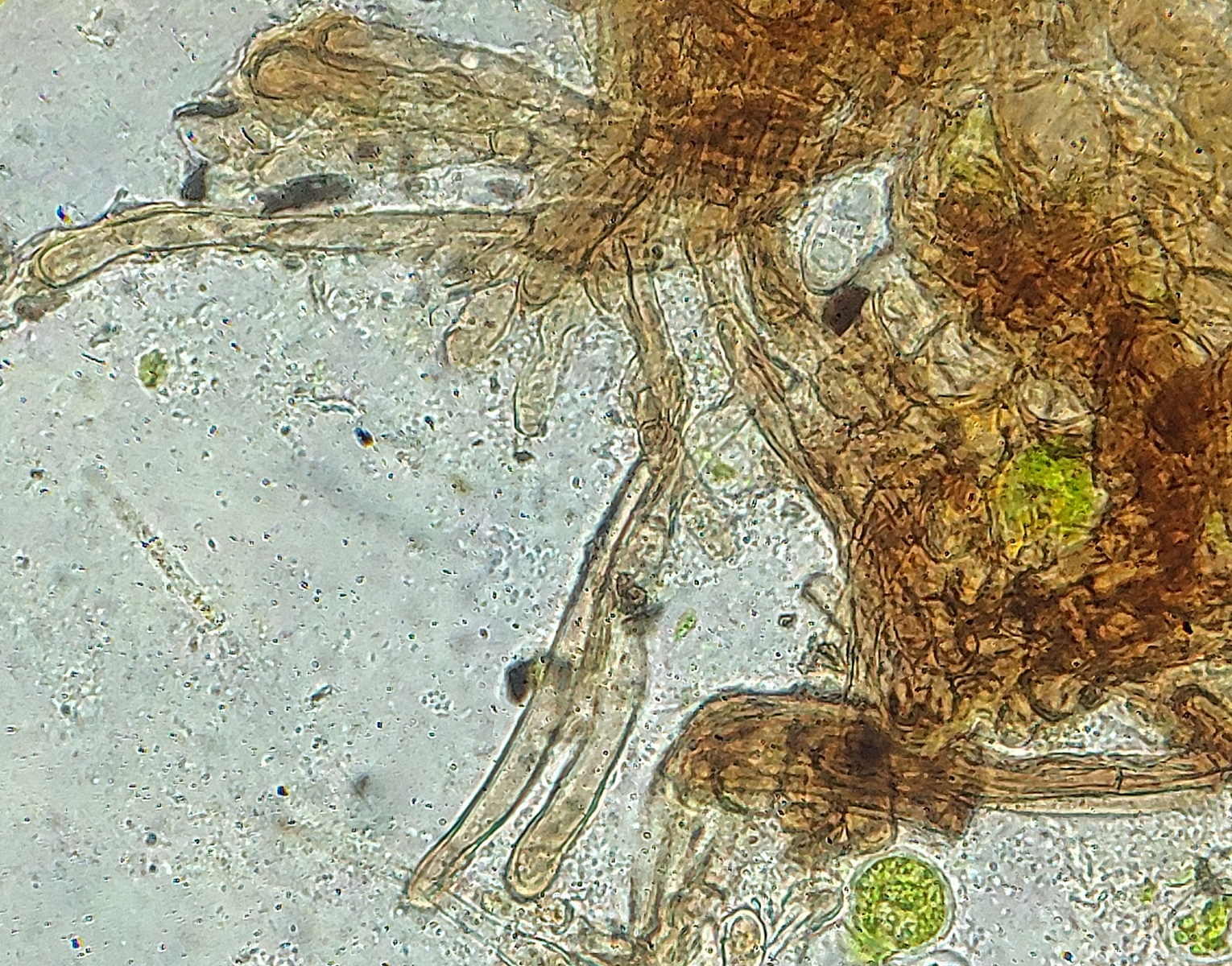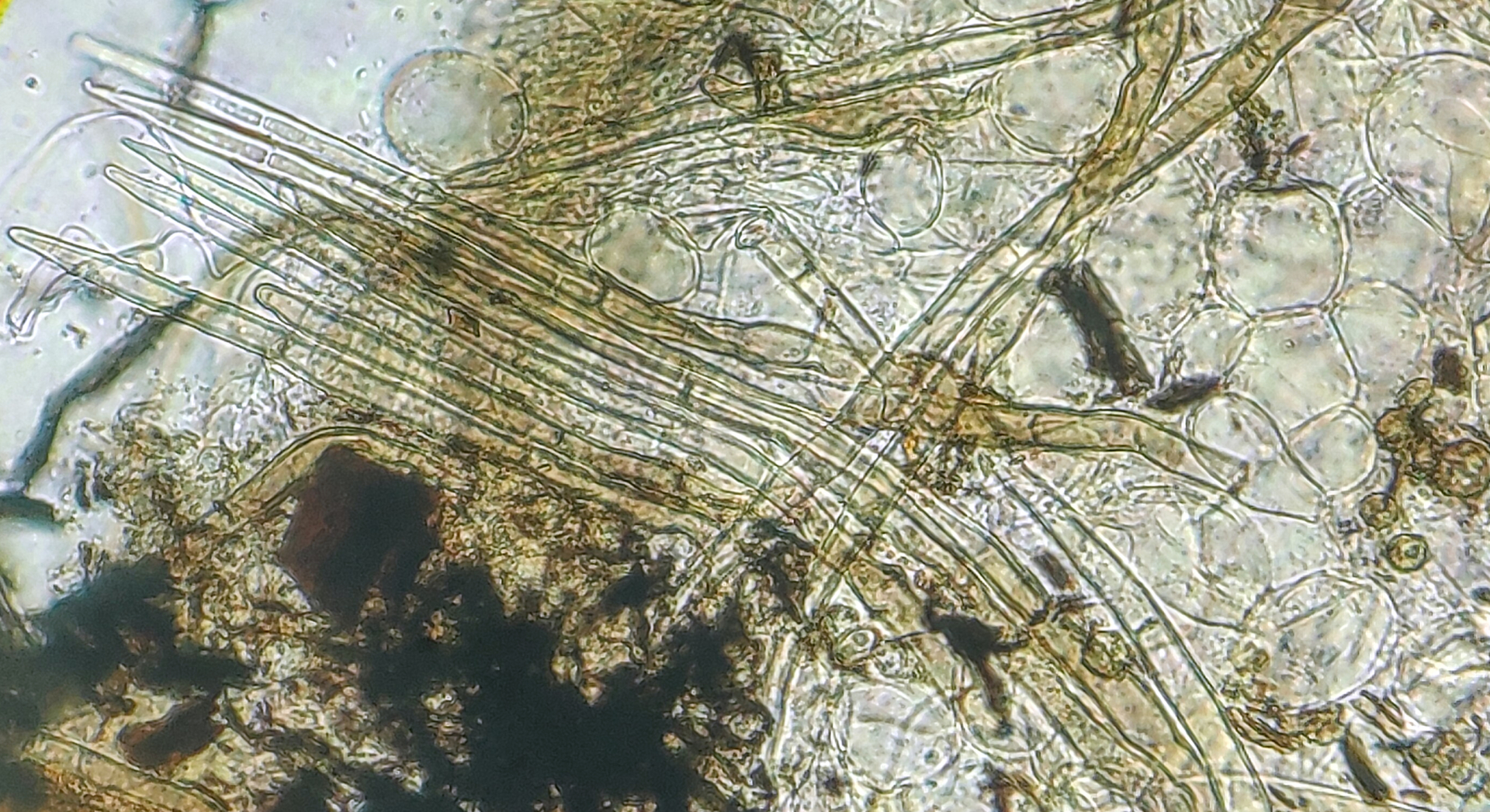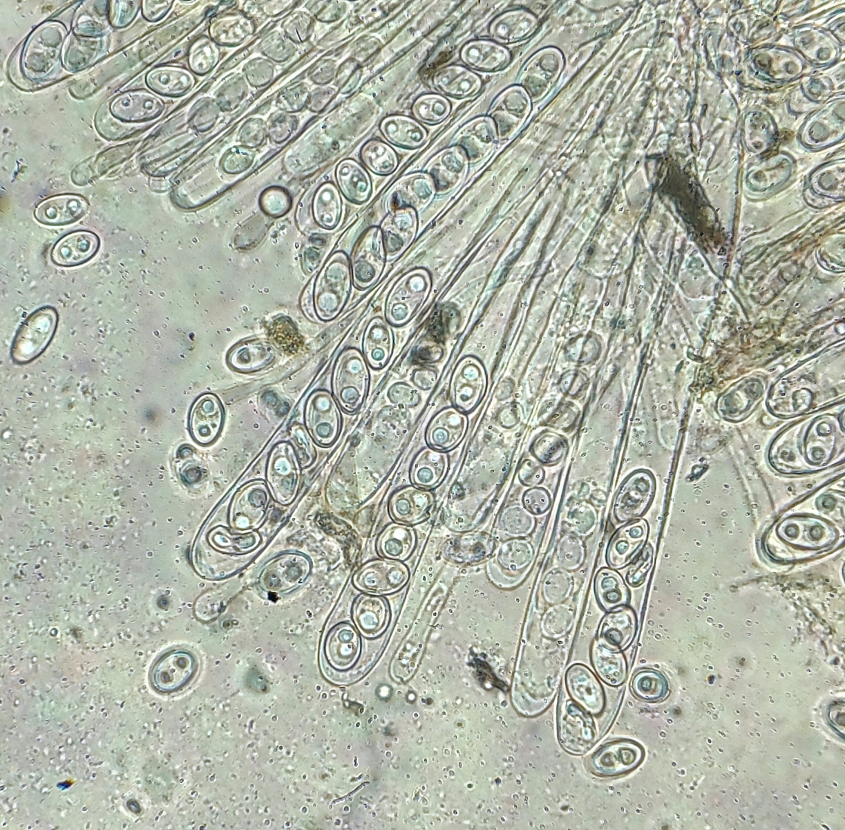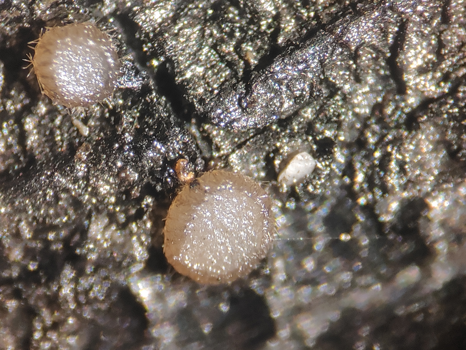 Als nächstes schöner Fund auf einem verkohlten Eichenbalken, der wohl auch neu für Niedersachsen ist: Trichophaea abundans! Mit Haarlängen von weniger als 250 µm, sowie den Sporenmaßen gut von anderen Arten der Gattung und Nachbargattungen abgrenzbar. Zudem mag die Art wohl Brandstellen.