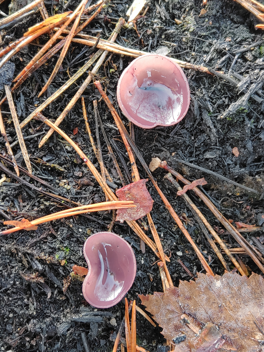 Eine wunderschön gefärbte Peziza ließ sich als Nächstes finden. Mit der lila Farbe der Apothecien und sehr kleinen Sporen mit warzigem Ornament kommt man mit dem Hohmeyer-Schlüssel direkt zu Peziza violacea: