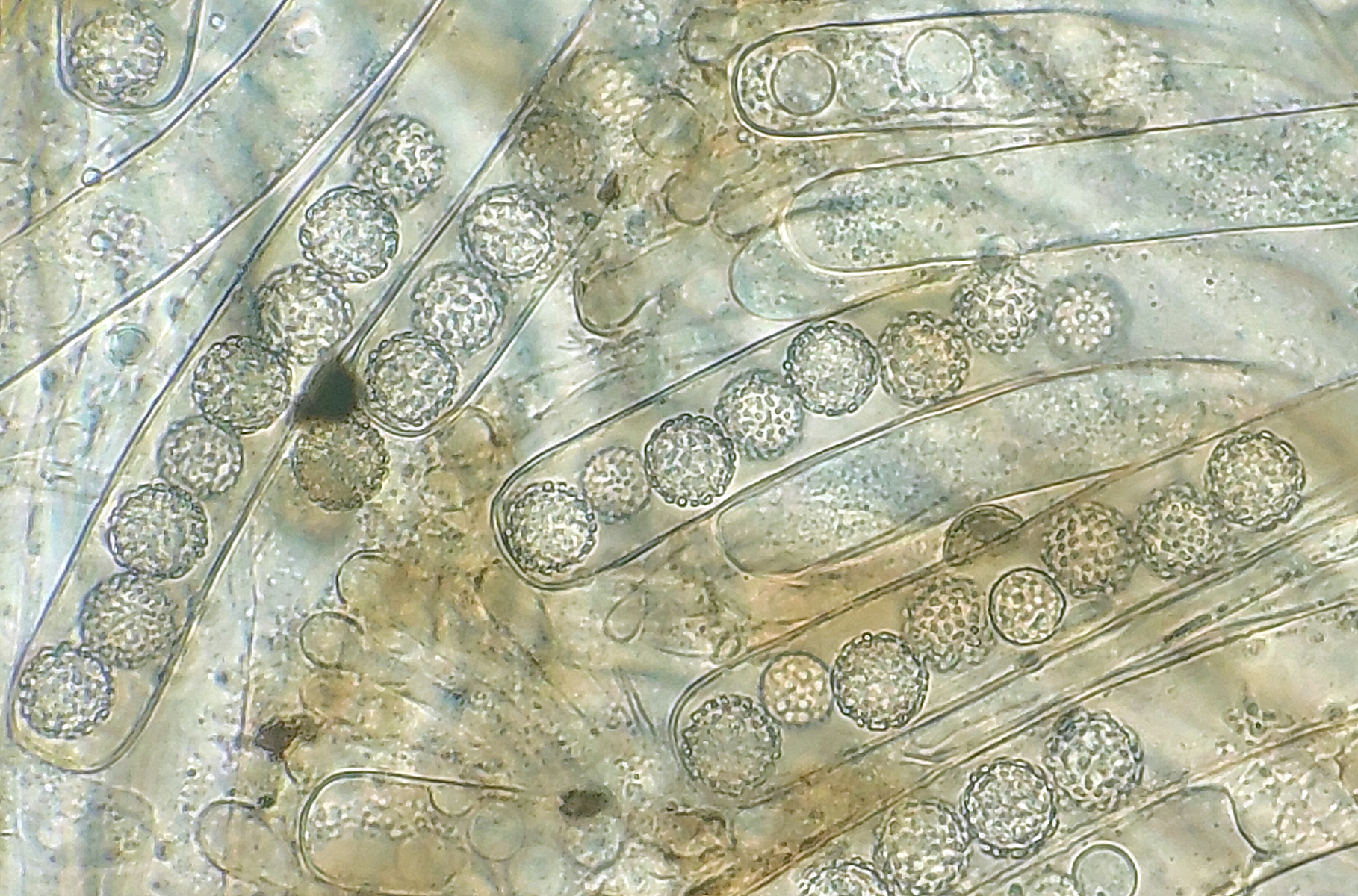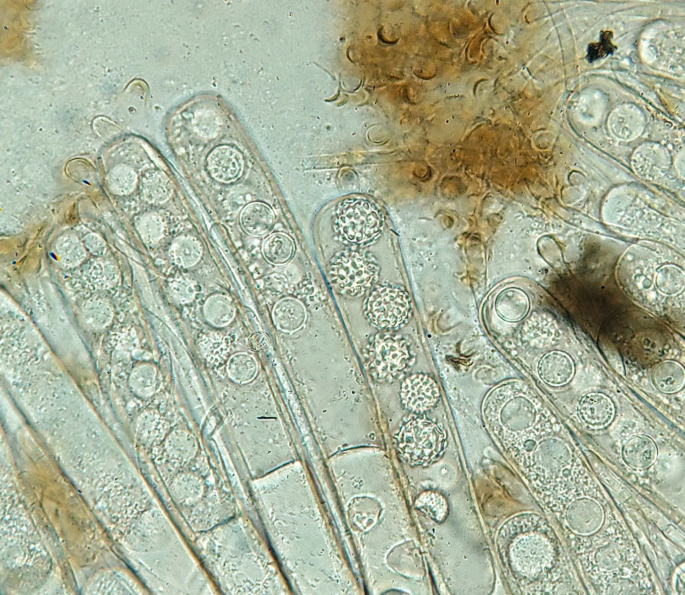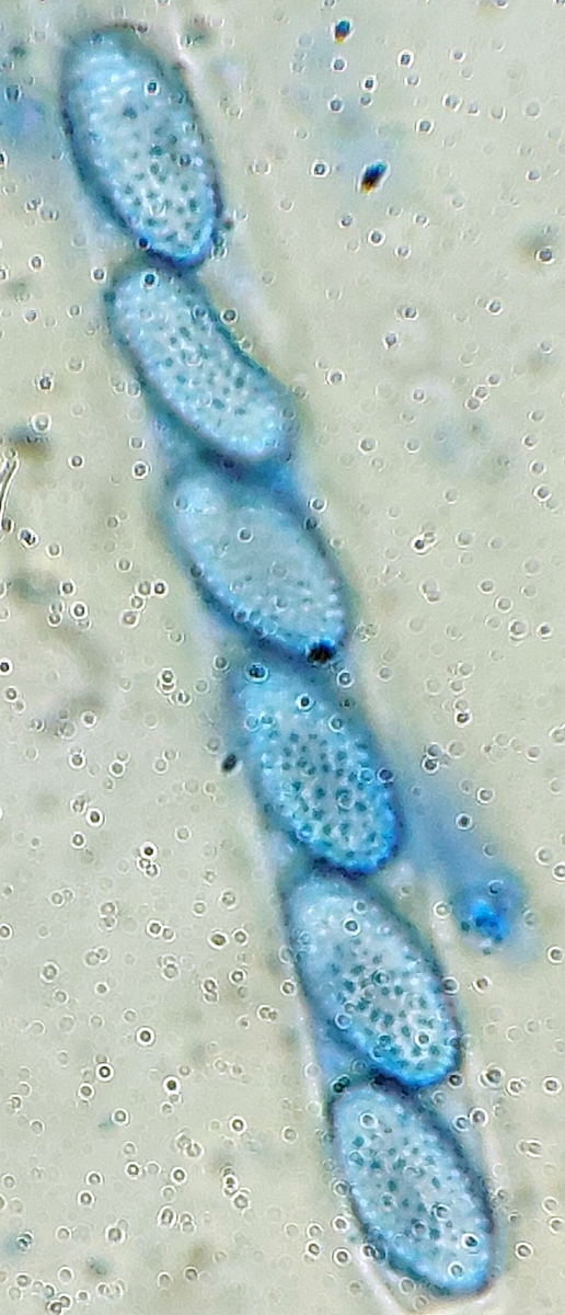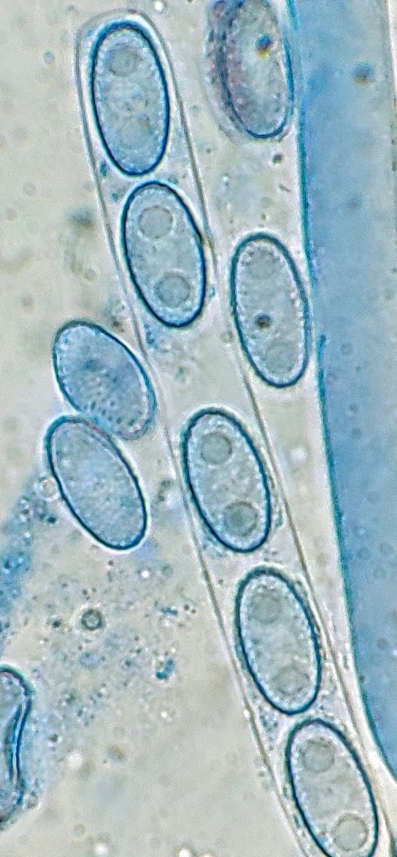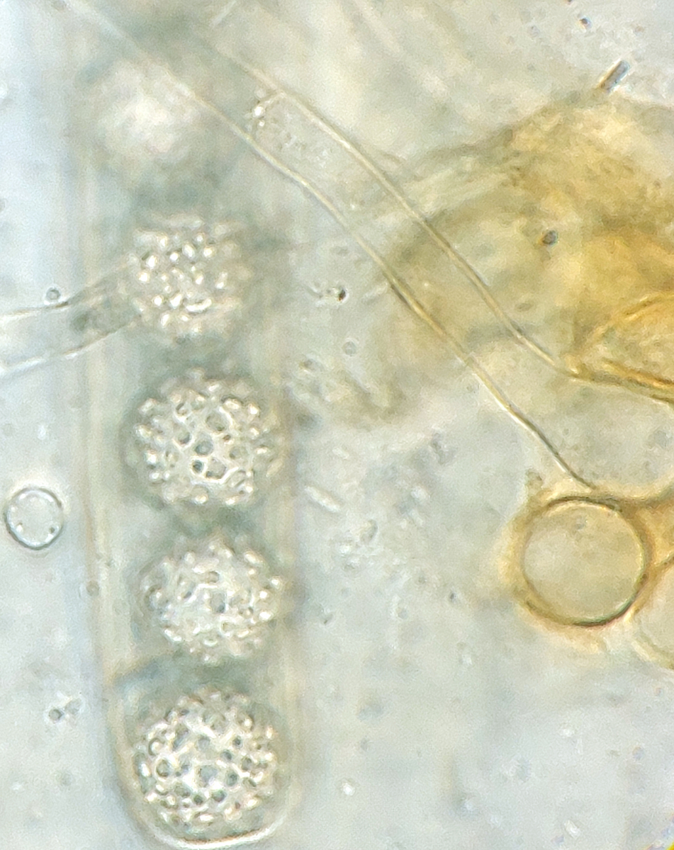 Der letzte Ascomycet, den ich euch zeigen möchte ist meines Wissens nach ebenfalls neu für Niedersachsen nachgewiesen. Makroskopisch fanden wir die Art sehr vielgestaltig, von sehr kleinen Apothecien bis hin zu mehreren cm Durchmesser, von rot bis fast schwarz gefärbt und besonders interessant fanden wir ein Exemplar, das richtig gestielt daher kam. Bei dem wusste ich makroskopisch erst mal gar nicht, was mich erwartet, dann erwies es sich dann doch als die Art mit den wunderschönen runden Sporen mit abgestutztem, teils gratigem Ornament: Plicaria trachycarpa!