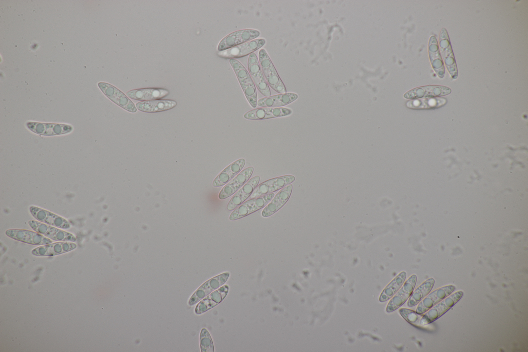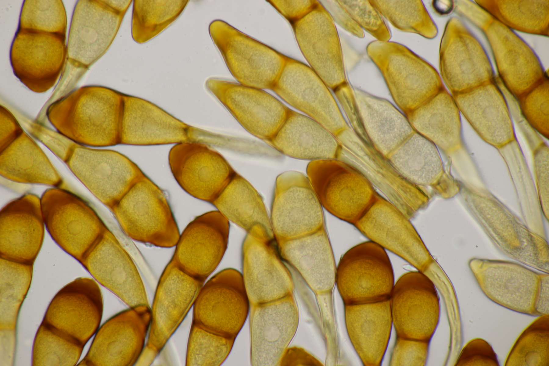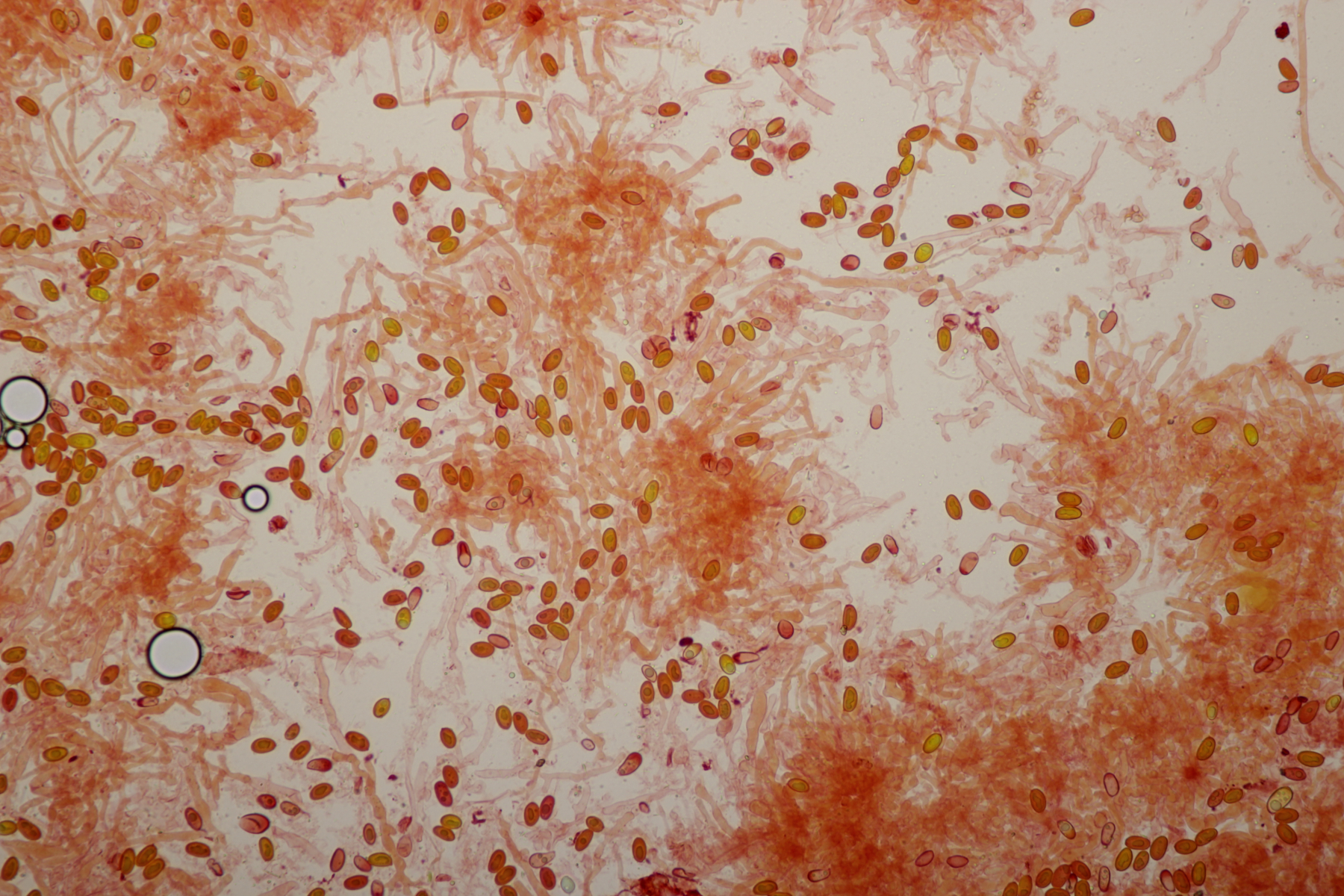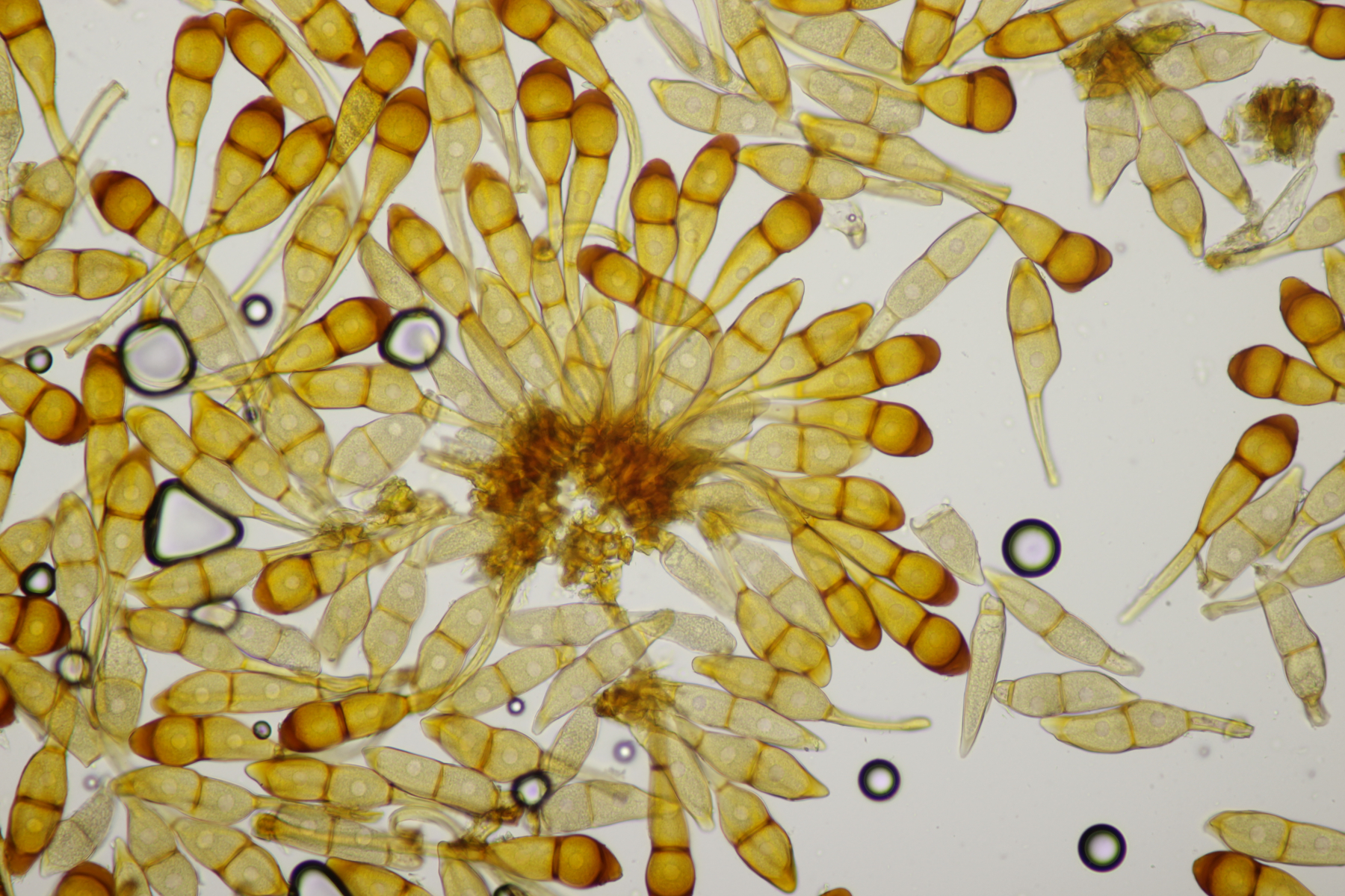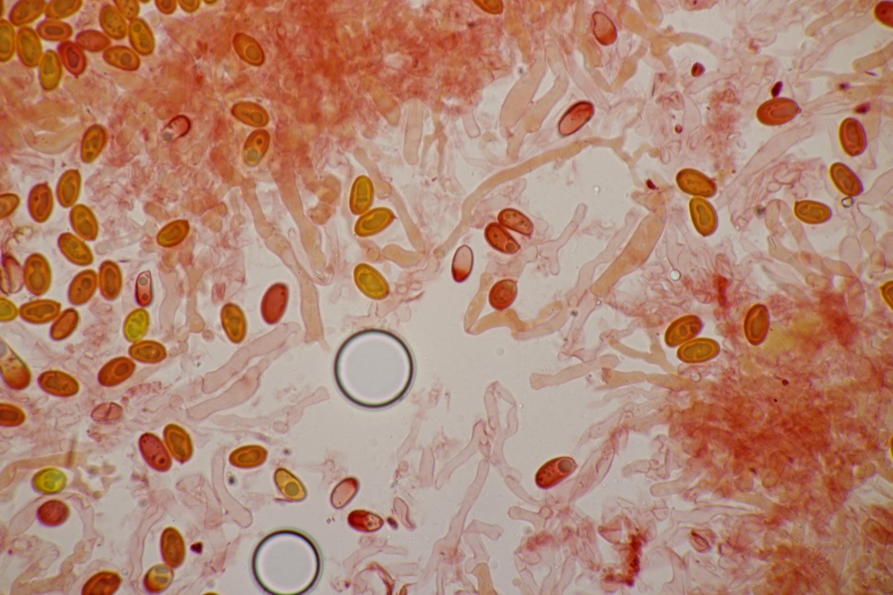 1. Ein Schleimpilz. Sporen messen (8.7+-0.3) µm bzw. (8.2-9.2) µm und ein (Pseudo)capillitium konnte ich leider nicht finden. Auffällig ist, daß das Innere von weißem Material (wie die Außenhaut) in kleine Kammern unterteilt wird. Hat fast etwas von einem Granatapfel. Das Substrat war ein Nadelholzstumpf. Im Feld habe ich erstmal an Enteridium lycoperdon gedacht, aber das paßt vom Sporenornament her nicht. Gibt es Ideen von den Schleimpilzexperten? lamproderma