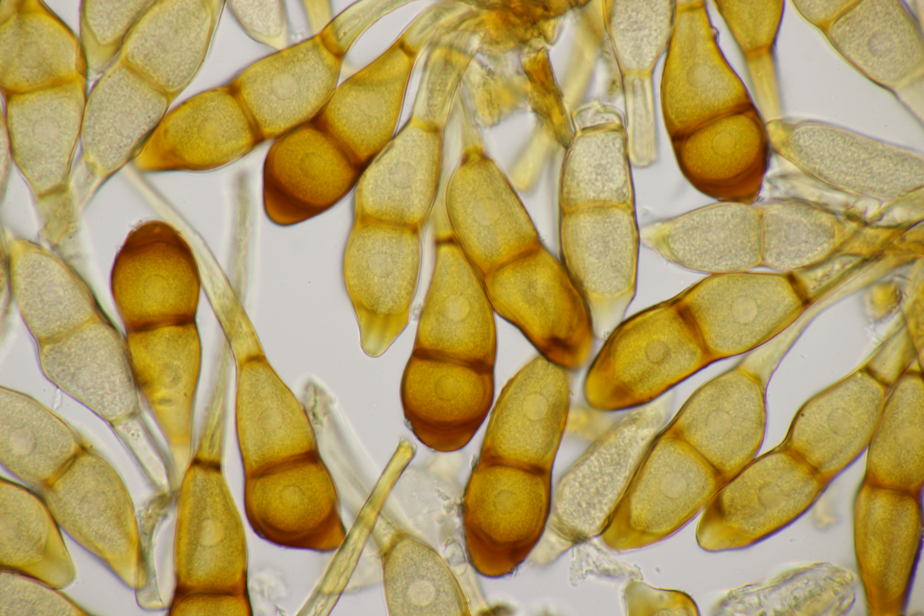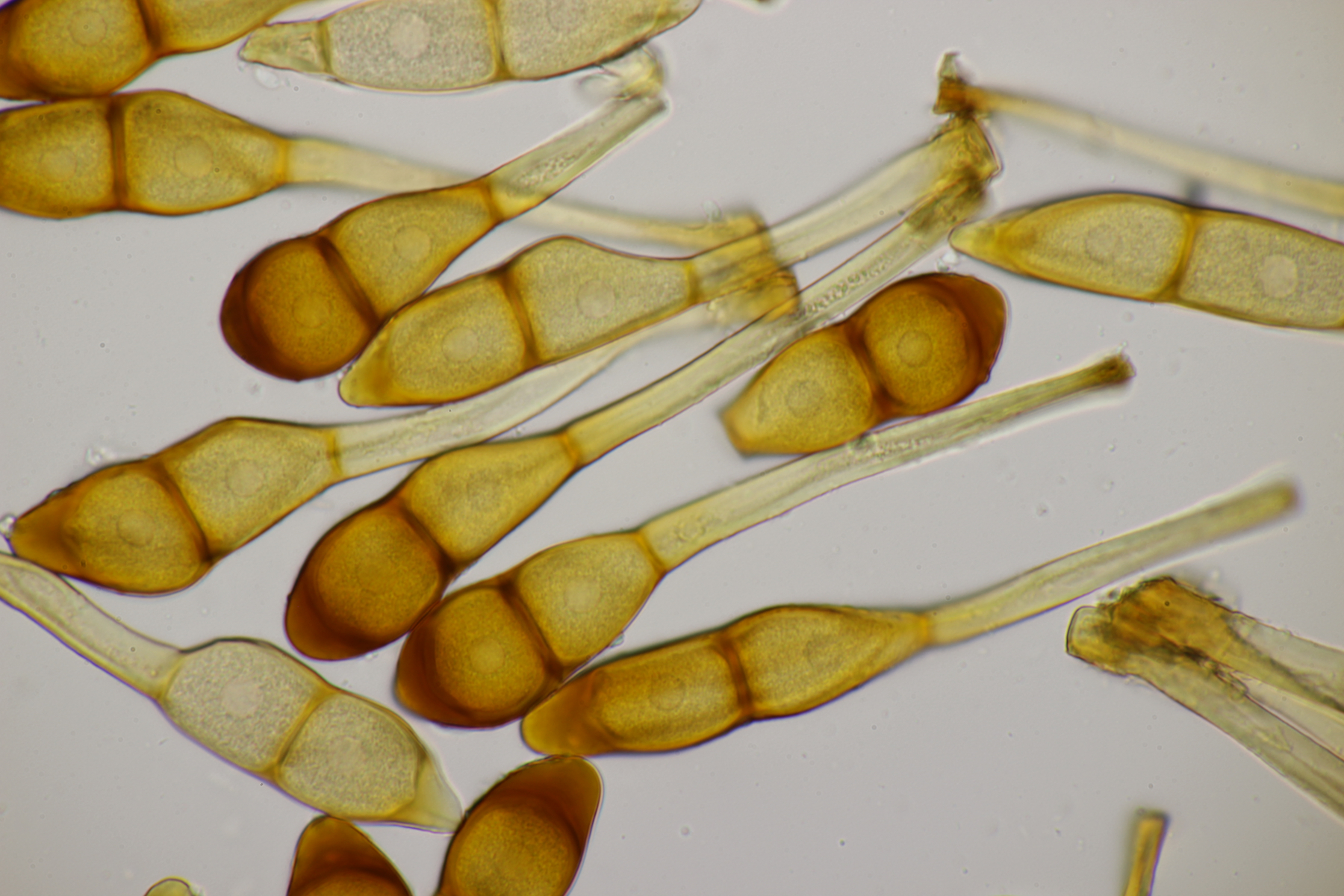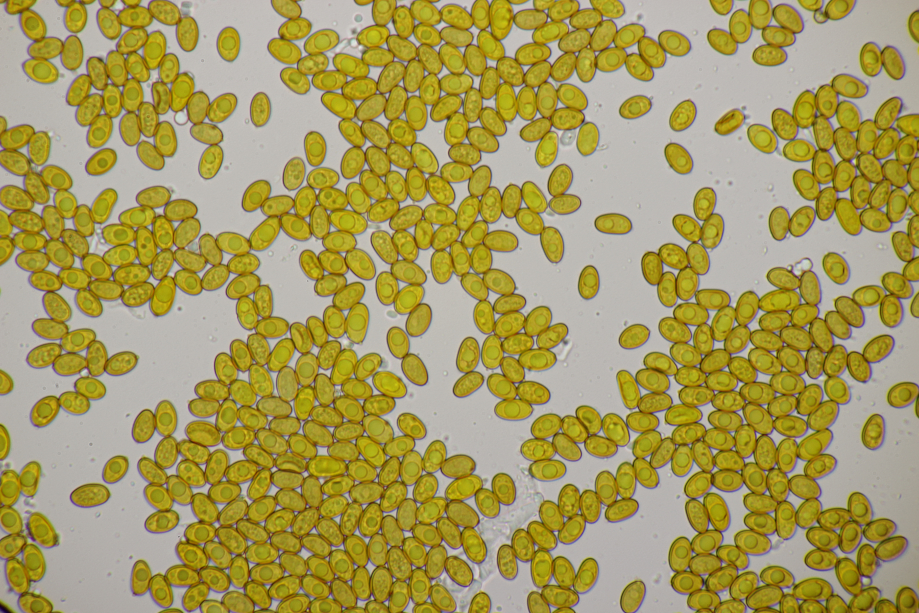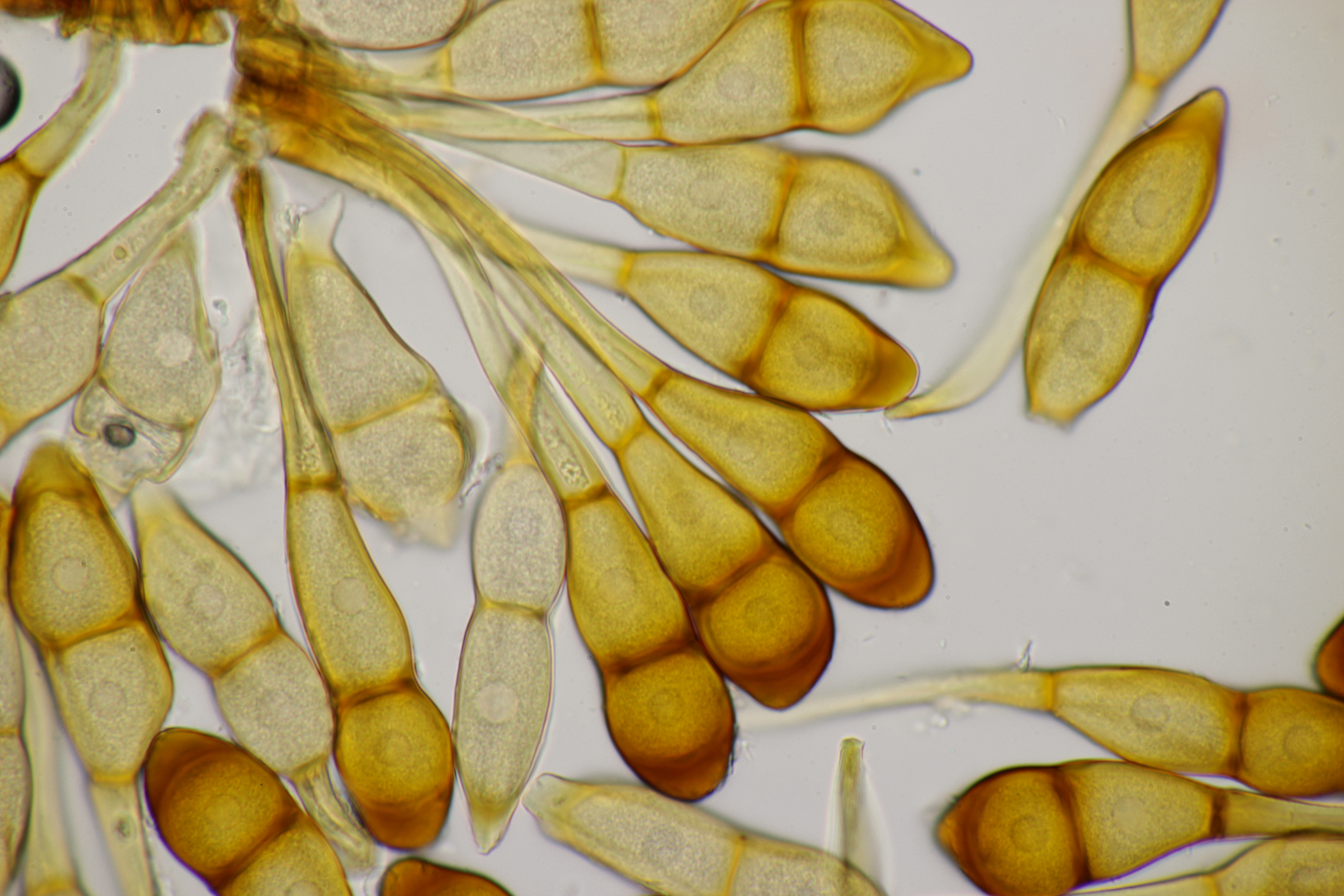 1. Ein Schleimpilz. Sporen messen (8.7+-0.3) µm bzw. (8.2-9.2) µm und ein (Pseudo)capillitium konnte ich leider nicht finden. Auffällig ist, daß das Innere von weißem Material (wie die Außenhaut) in kleine Kammern unterteilt wird. Hat fast etwas von einem Granatapfel. Das Substrat war ein Nadelholzstumpf. Im Feld habe ich erstmal an Enteridium lycoperdon gedacht, aber das paßt vom Sporenornament her nicht. Gibt es Ideen von den Schleimpilzexperten? lamproderma