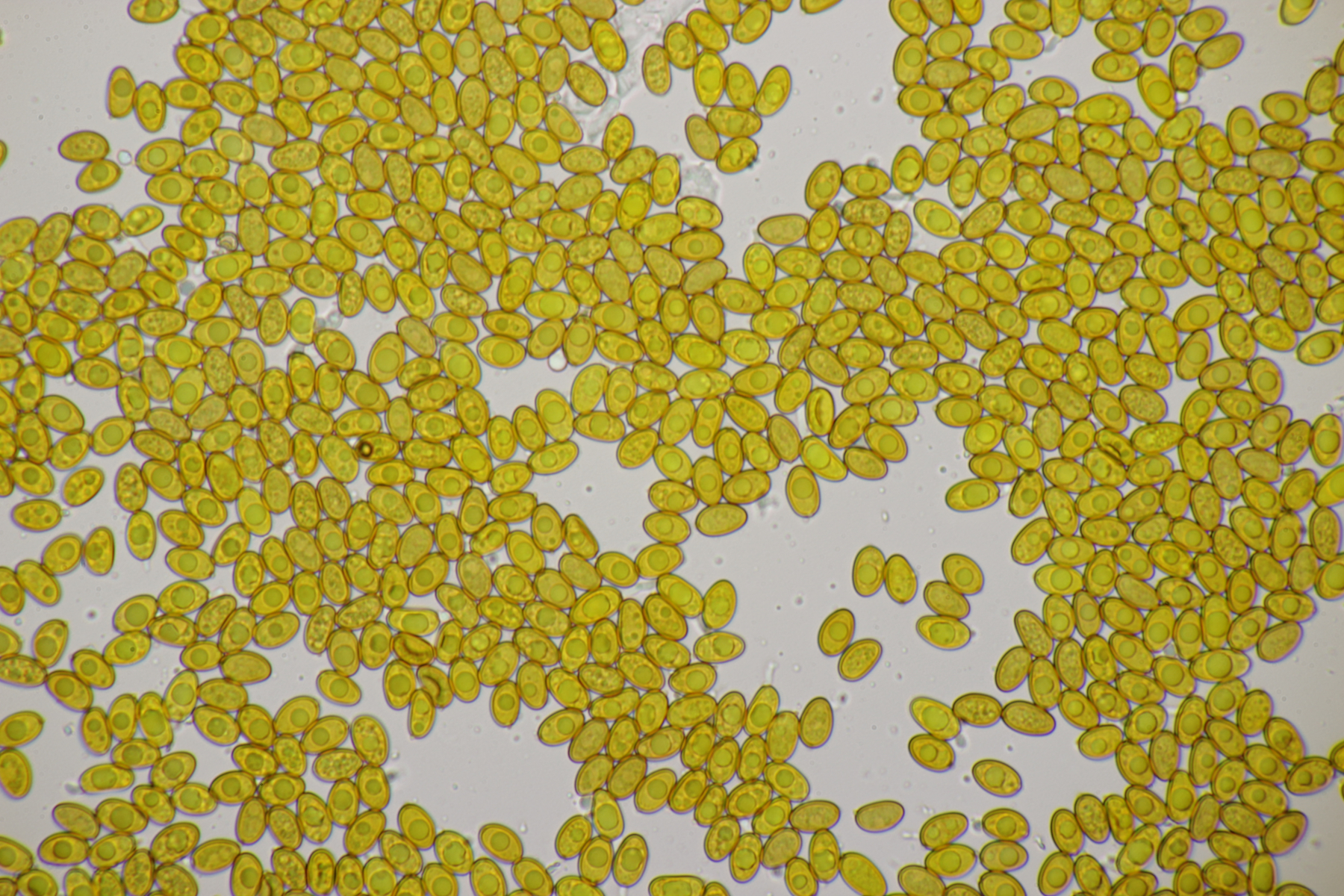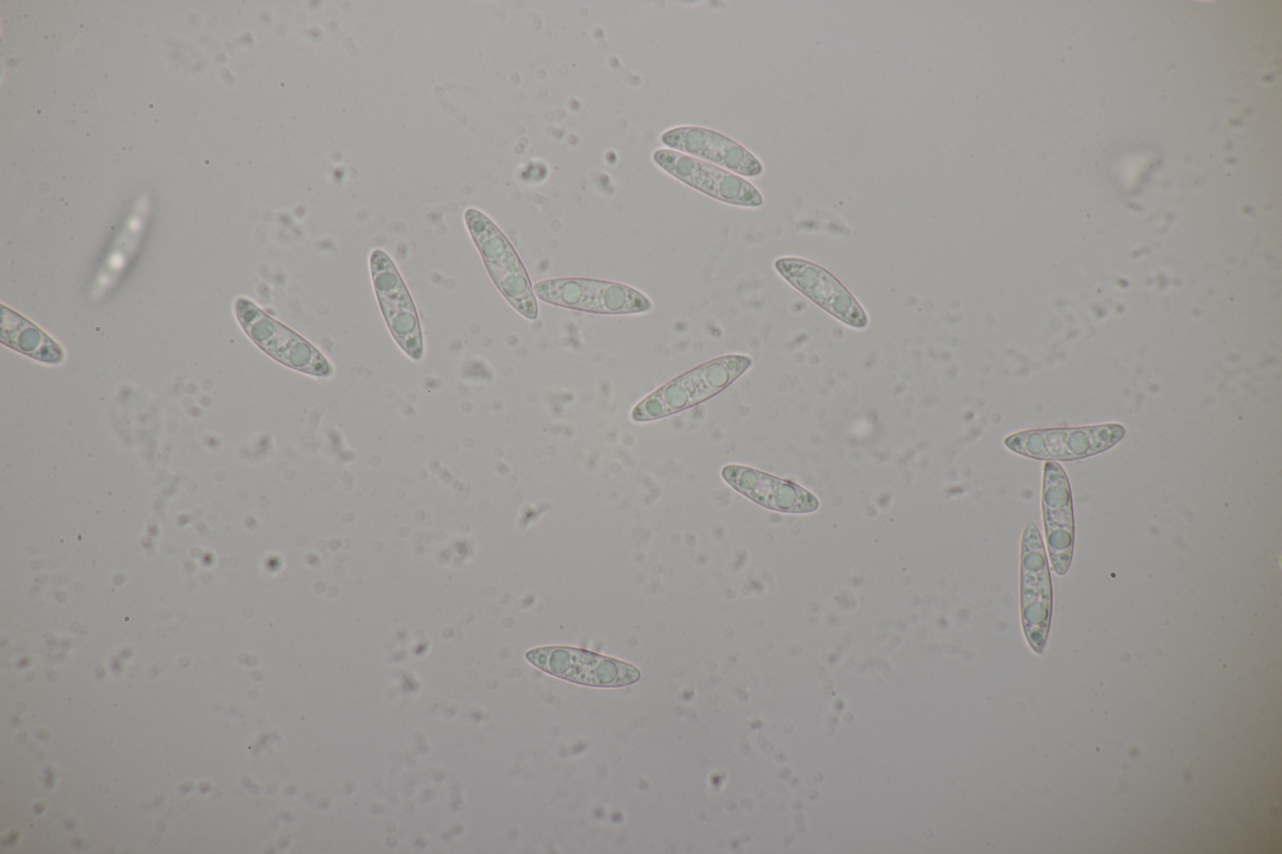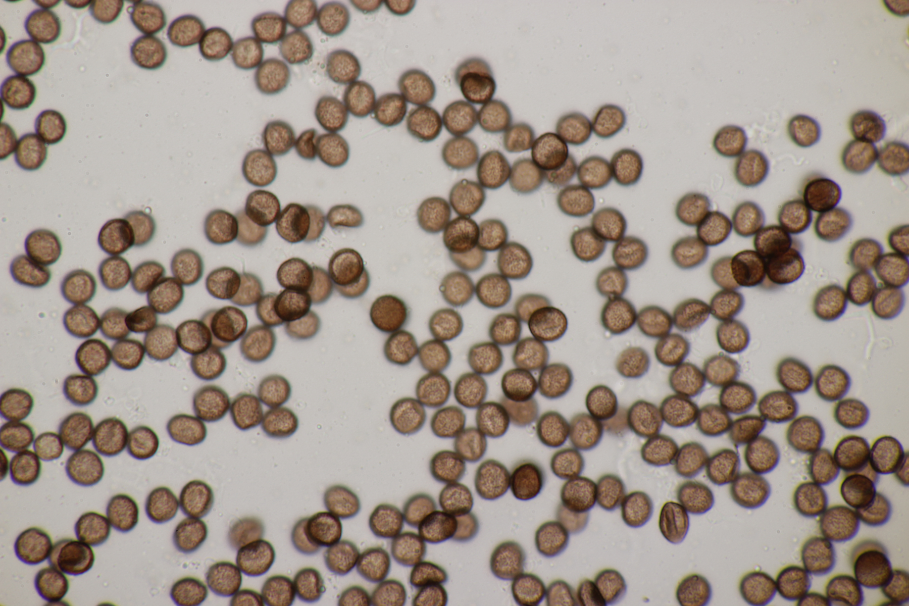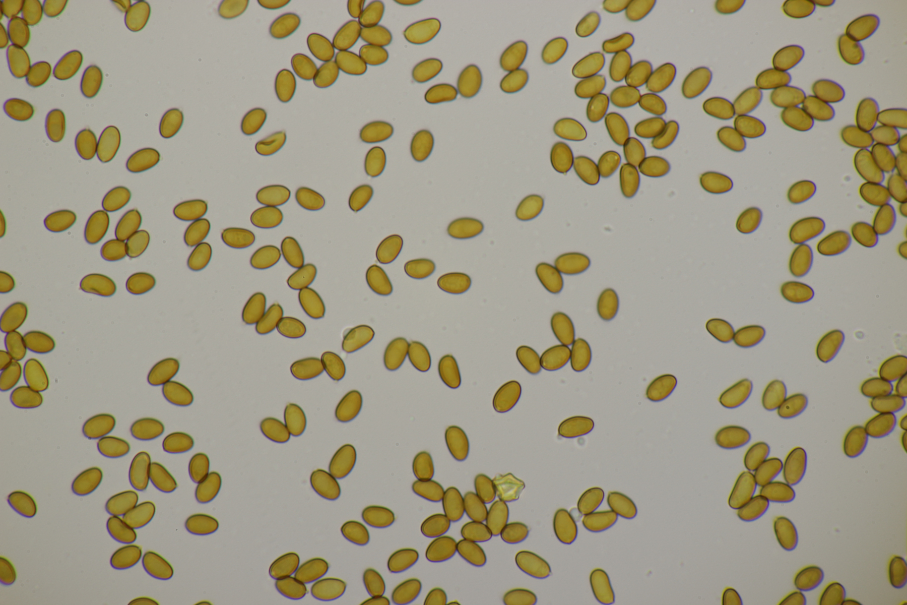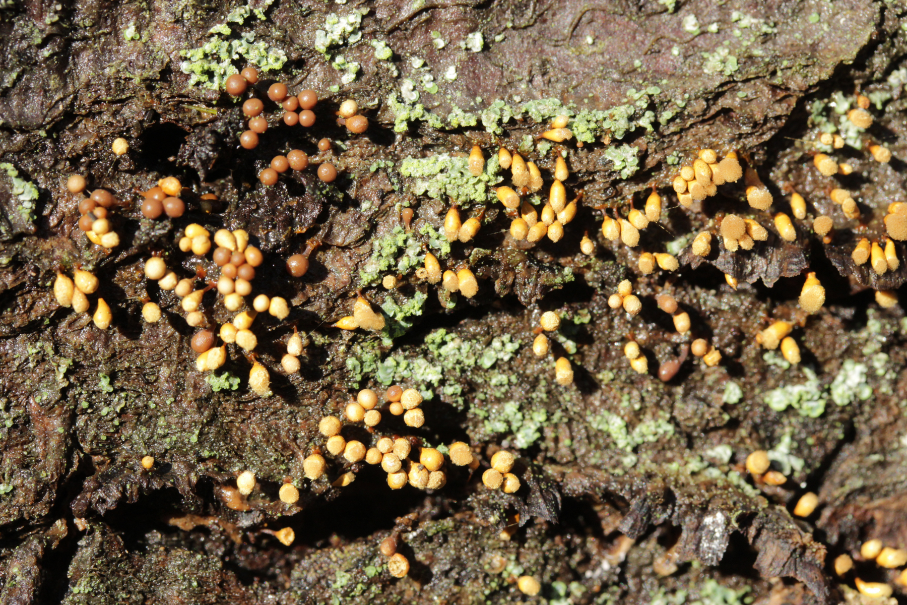 1. Ein Schleimpilz. Sporen messen (8.7+-0.3) µm bzw. (8.2-9.2) µm und ein (Pseudo)capillitium konnte ich leider nicht finden. Auffällig ist, daß das Innere von weißem Material (wie die Außenhaut) in kleine Kammern unterteilt wird. Hat fast etwas von einem Granatapfel. Das Substrat war ein Nadelholzstumpf. Im Feld habe ich erstmal an Enteridium lycoperdon gedacht, aber das paßt vom Sporenornament her nicht. Gibt es Ideen von den Schleimpilzexperten? lamproderma