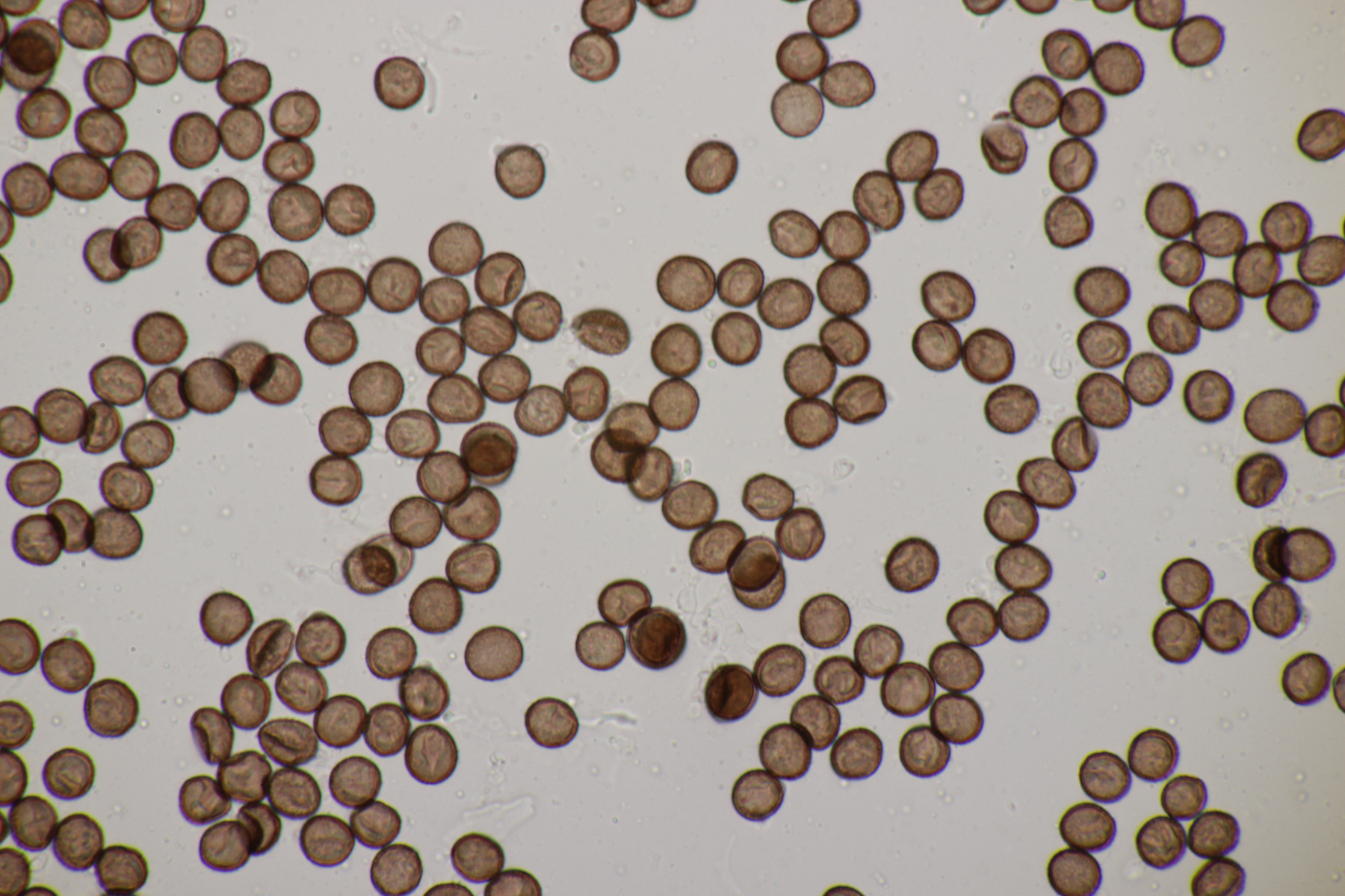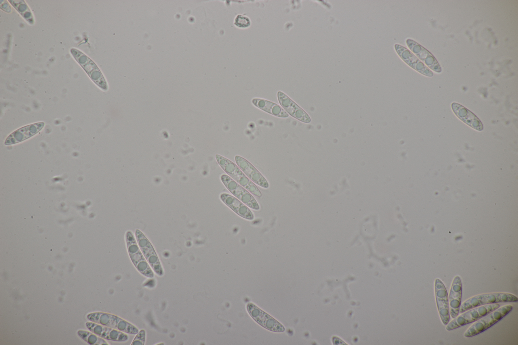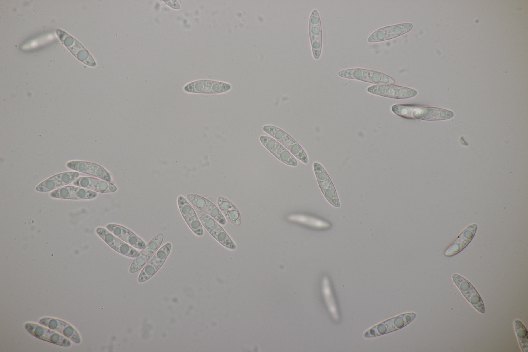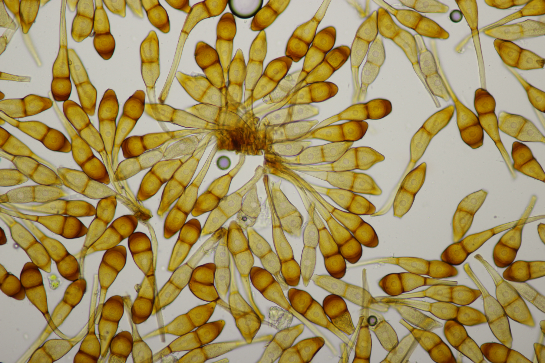 1. Ein Schleimpilz. Sporen messen (8.7+-0.3) µm bzw. (8.2-9.2) µm und ein (Pseudo)capillitium konnte ich leider nicht finden. Auffällig ist, daß das Innere von weißem Material (wie die Außenhaut) in kleine Kammern unterteilt wird. Hat fast etwas von einem Granatapfel. Das Substrat war ein Nadelholzstumpf. Im Feld habe ich erstmal an Enteridium lycoperdon gedacht, aber das paßt vom Sporenornament her nicht. Gibt es Ideen von den Schleimpilzexperten? lamproderma