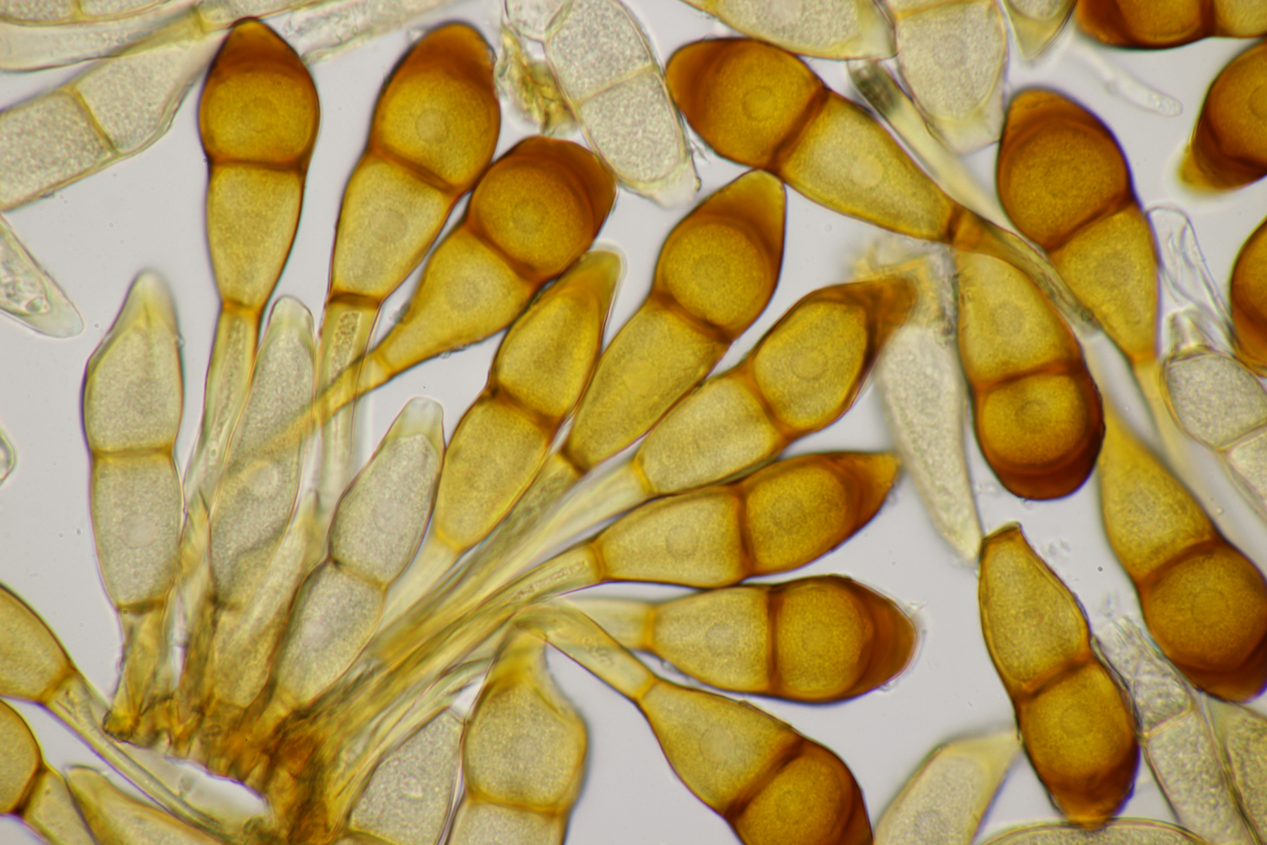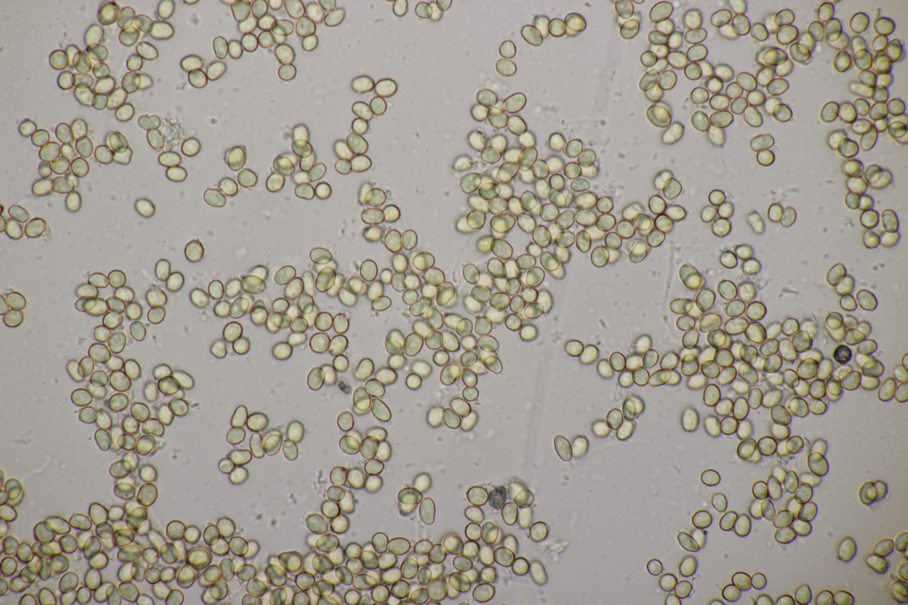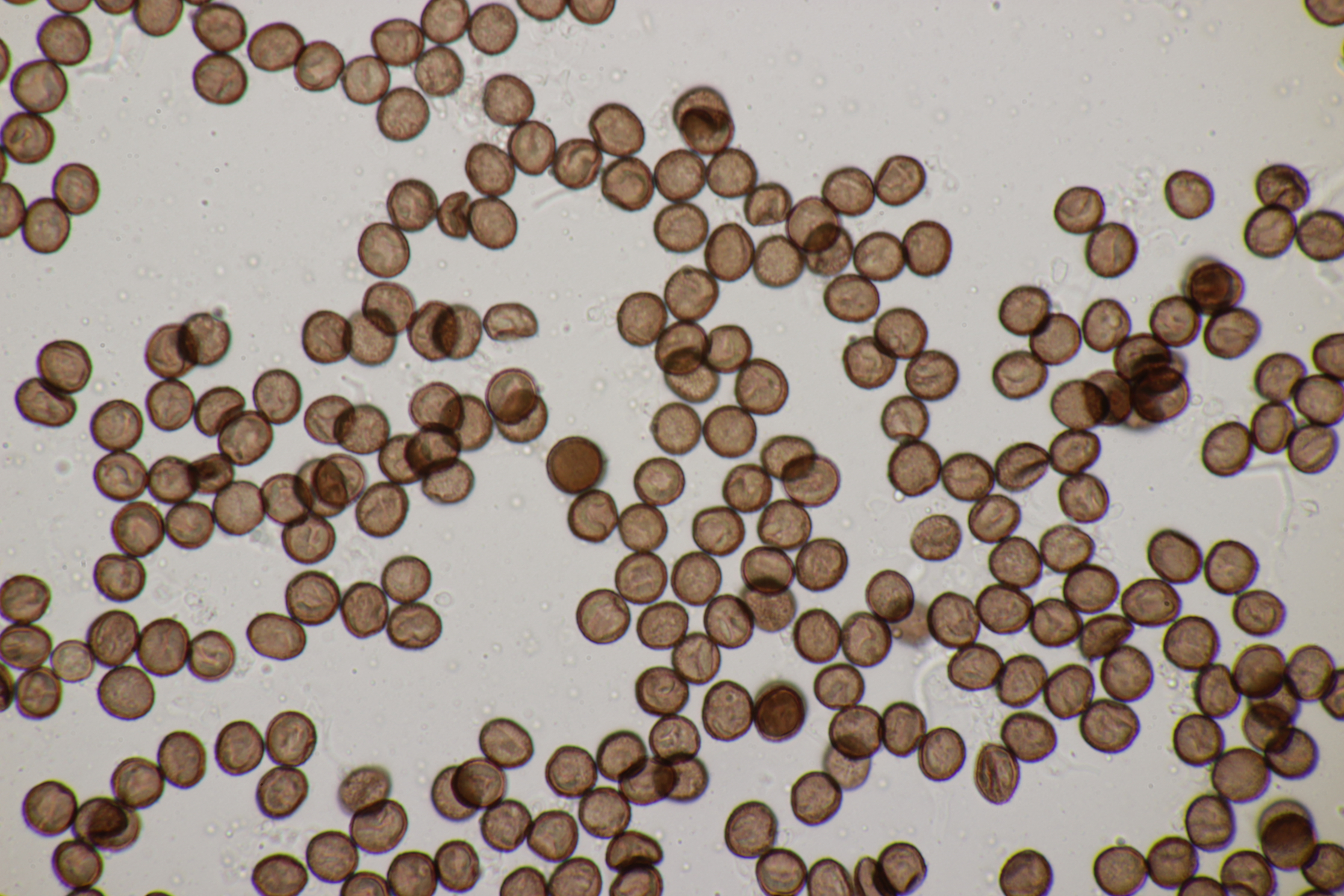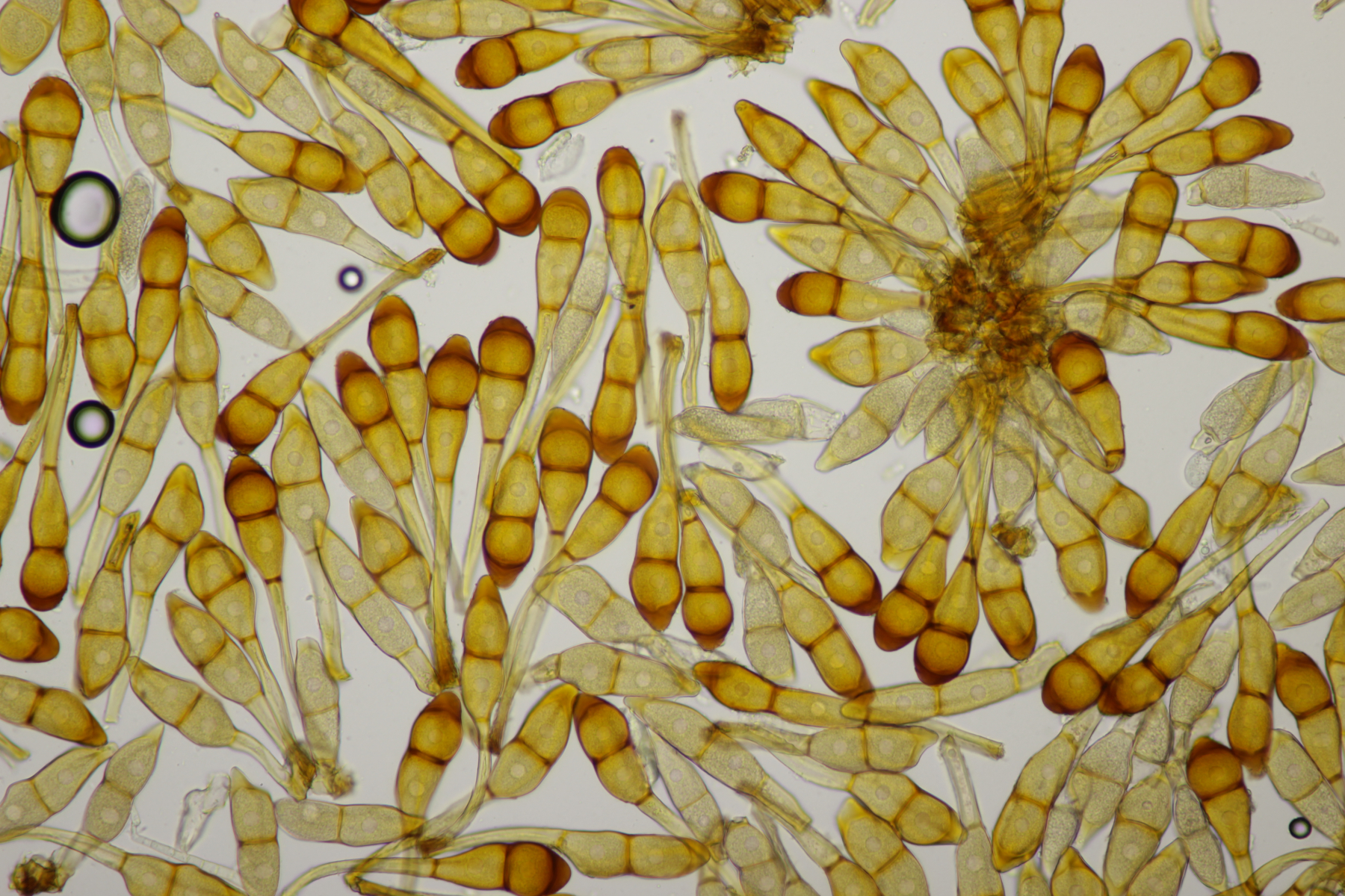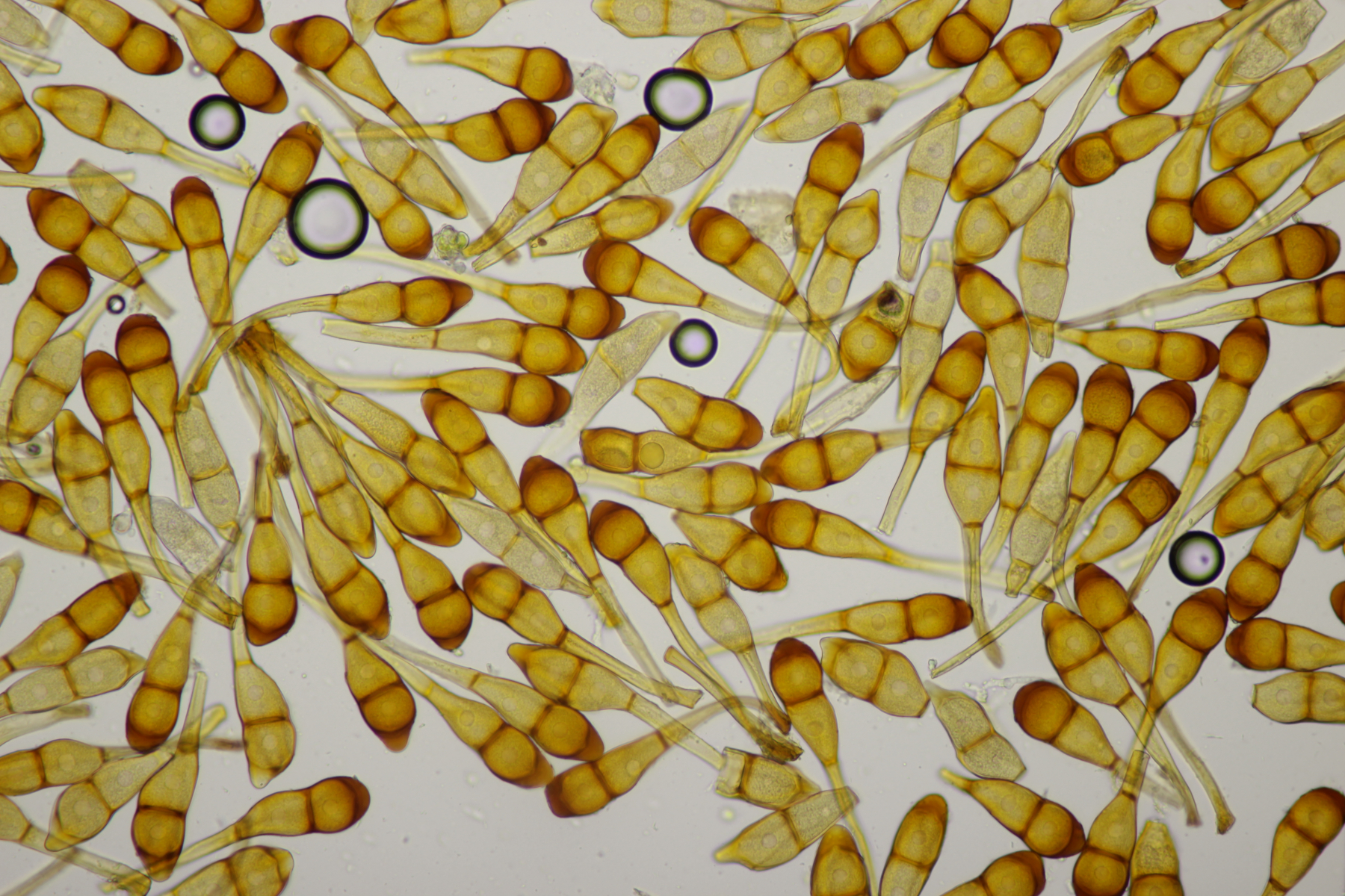 1. Ein Schleimpilz. Sporen messen (8.7+-0.3) µm bzw. (8.2-9.2) µm und ein (Pseudo)capillitium konnte ich leider nicht finden. Auffällig ist, daß das Innere von weißem Material (wie die Außenhaut) in kleine Kammern unterteilt wird. Hat fast etwas von einem Granatapfel. Das Substrat war ein Nadelholzstumpf. Im Feld habe ich erstmal an Enteridium lycoperdon gedacht, aber das paßt vom Sporenornament her nicht. Gibt es Ideen von den Schleimpilzexperten? lamproderma