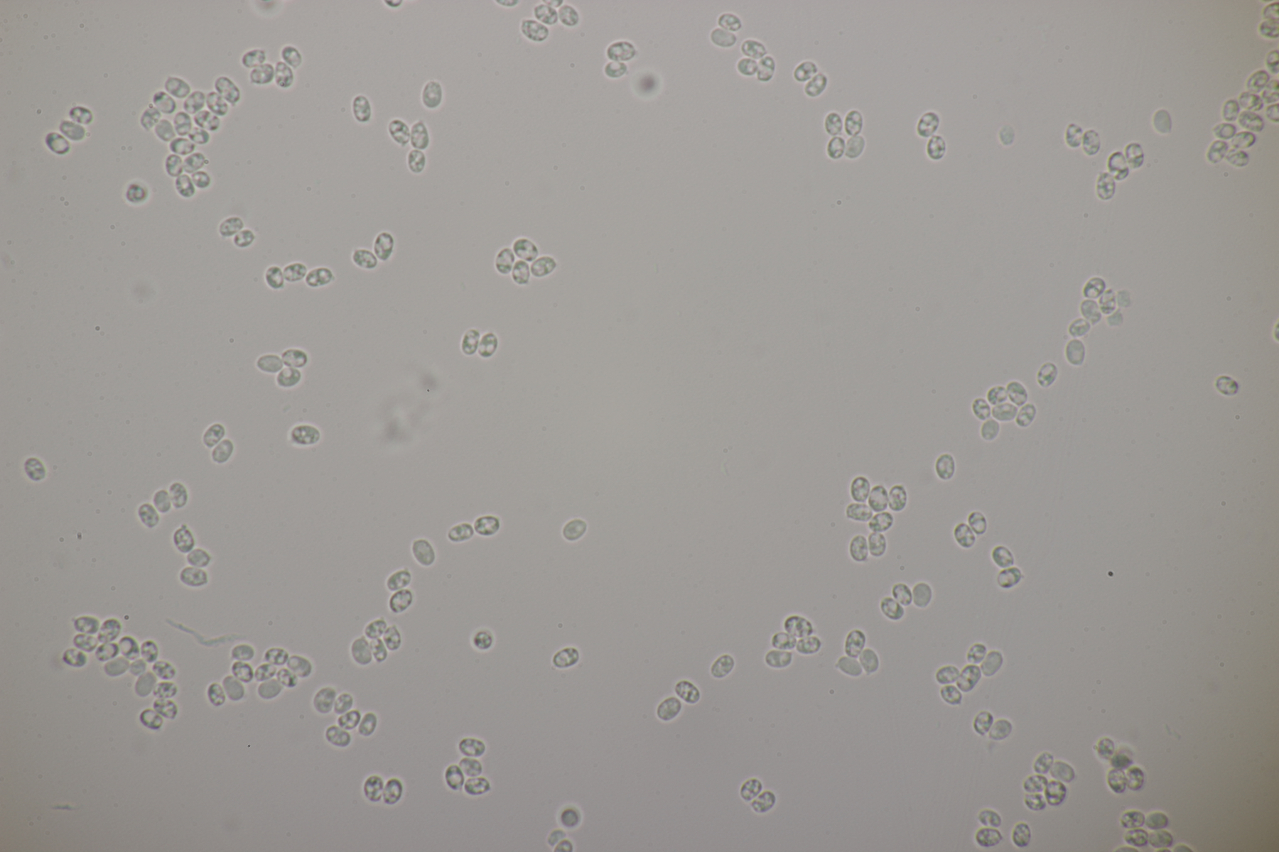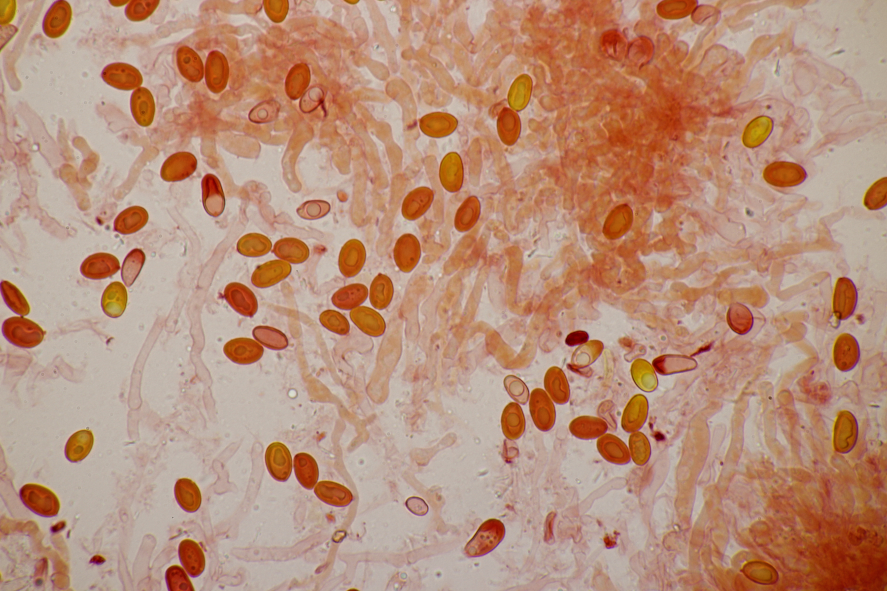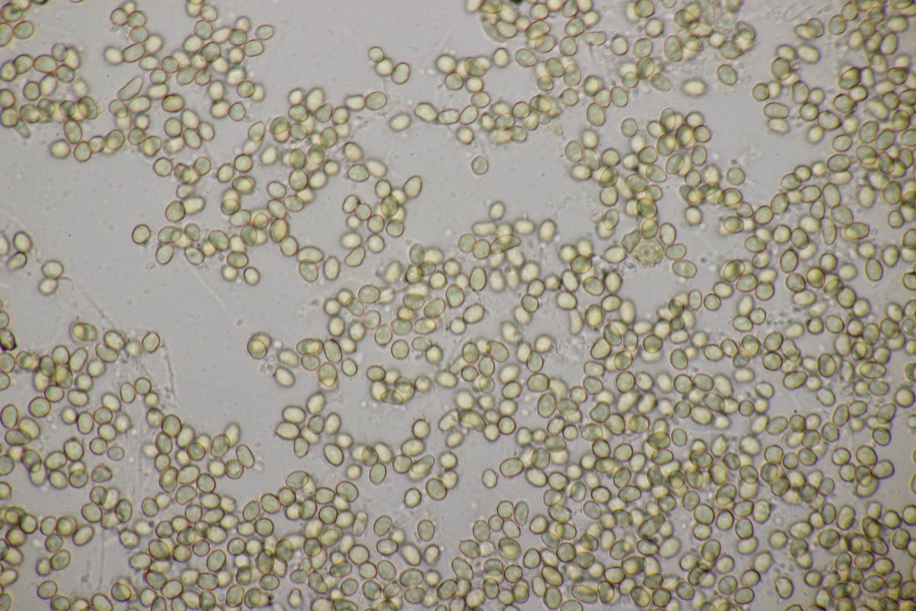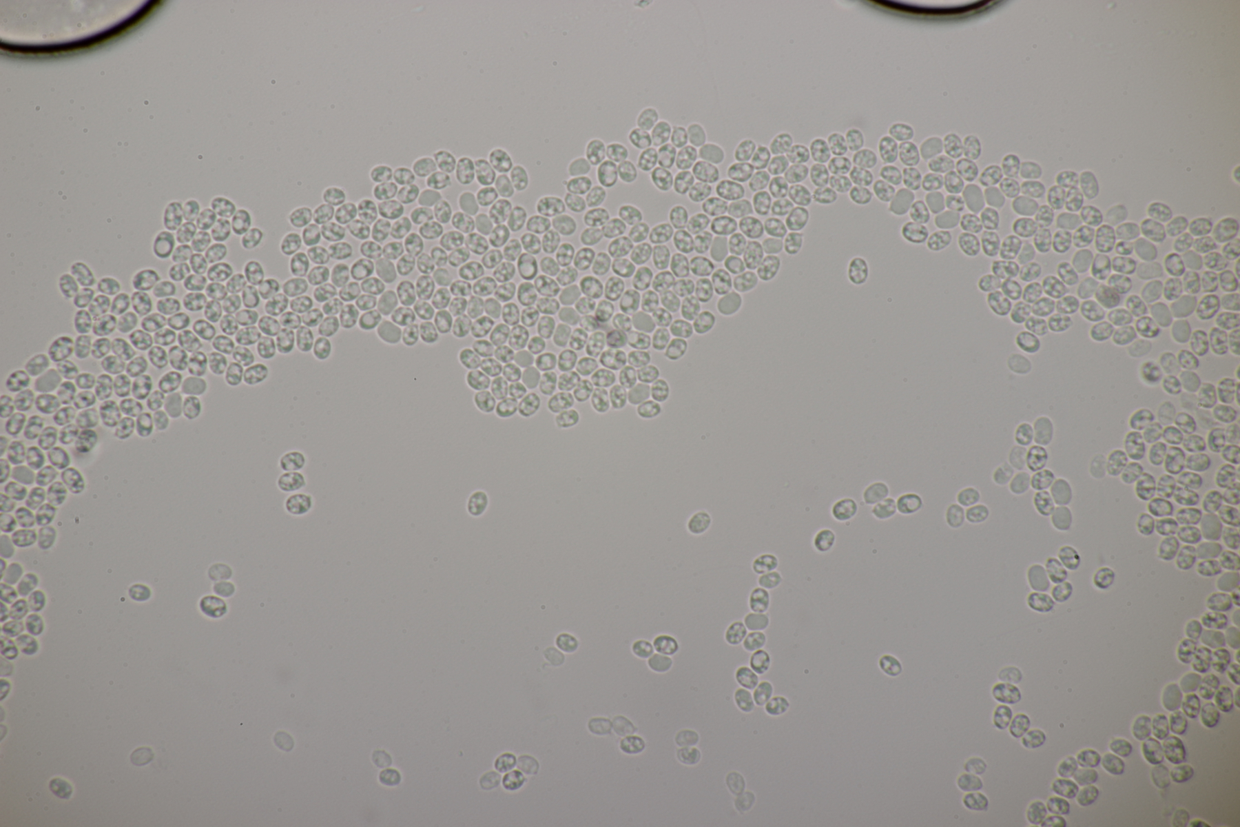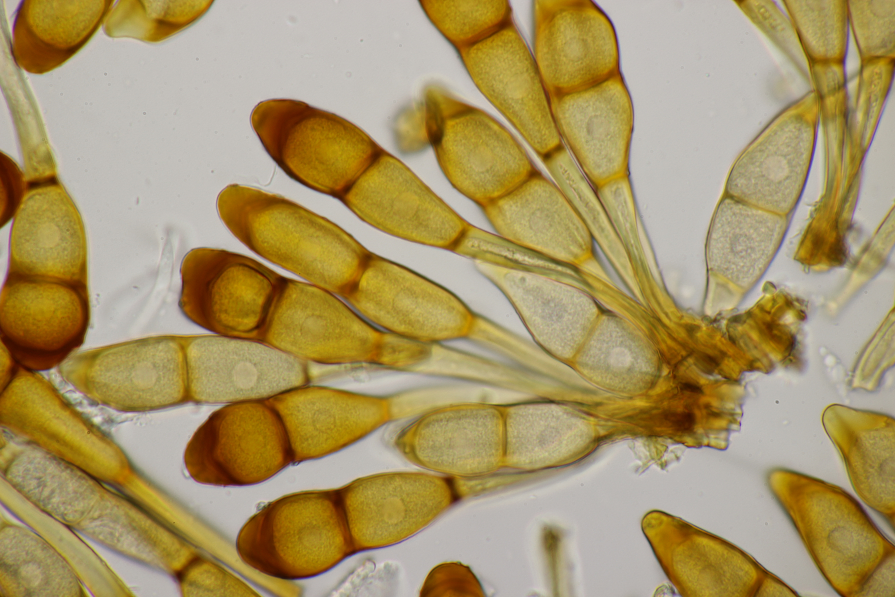 1. Ein Schleimpilz. Sporen messen (8.7+-0.3) µm bzw. (8.2-9.2) µm und ein (Pseudo)capillitium konnte ich leider nicht finden. Auffällig ist, daß das Innere von weißem Material (wie die Außenhaut) in kleine Kammern unterteilt wird. Hat fast etwas von einem Granatapfel. Das Substrat war ein Nadelholzstumpf. Im Feld habe ich erstmal an Enteridium lycoperdon gedacht, aber das paßt vom Sporenornament her nicht. Gibt es Ideen von den Schleimpilzexperten? lamproderma