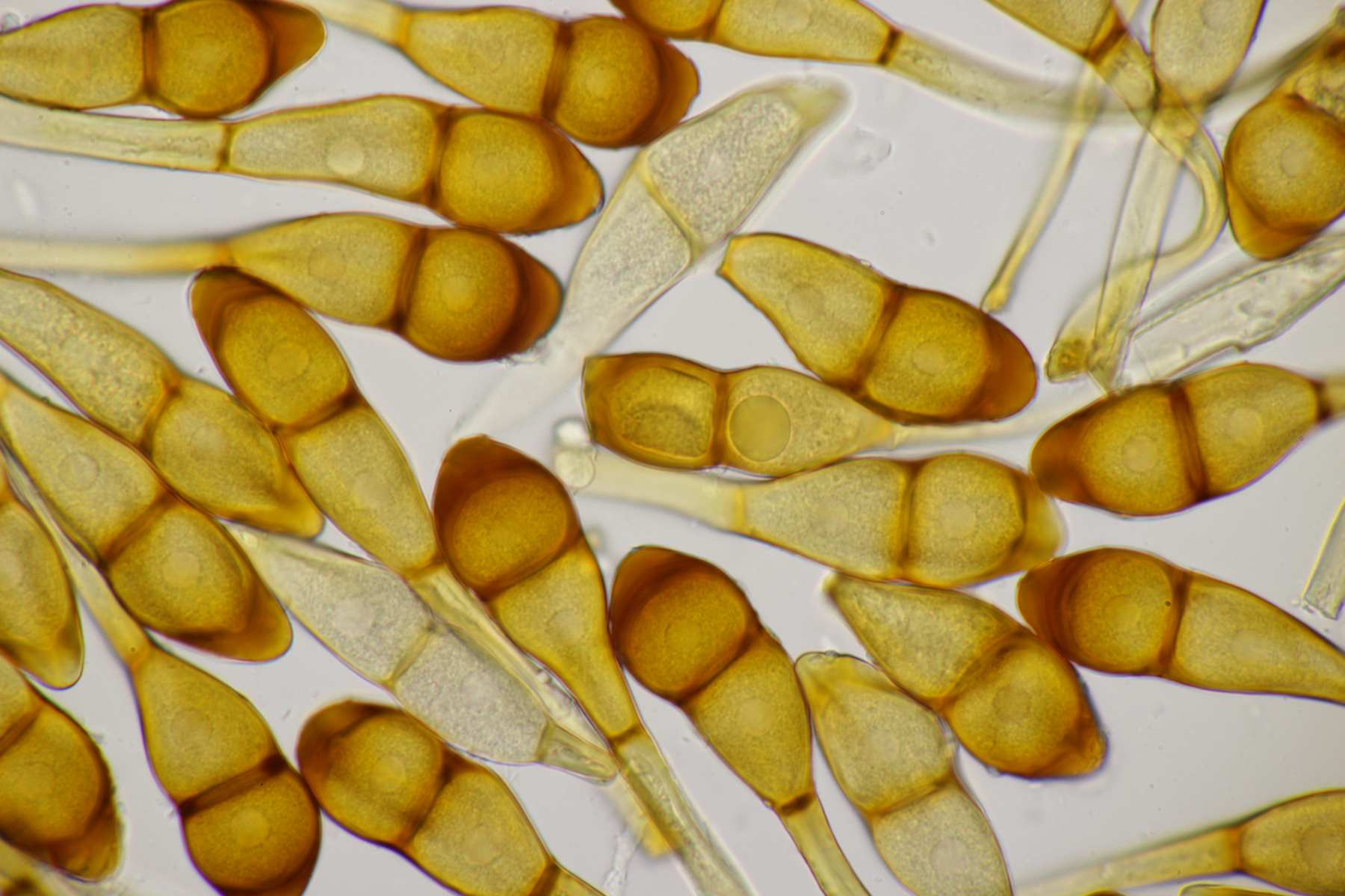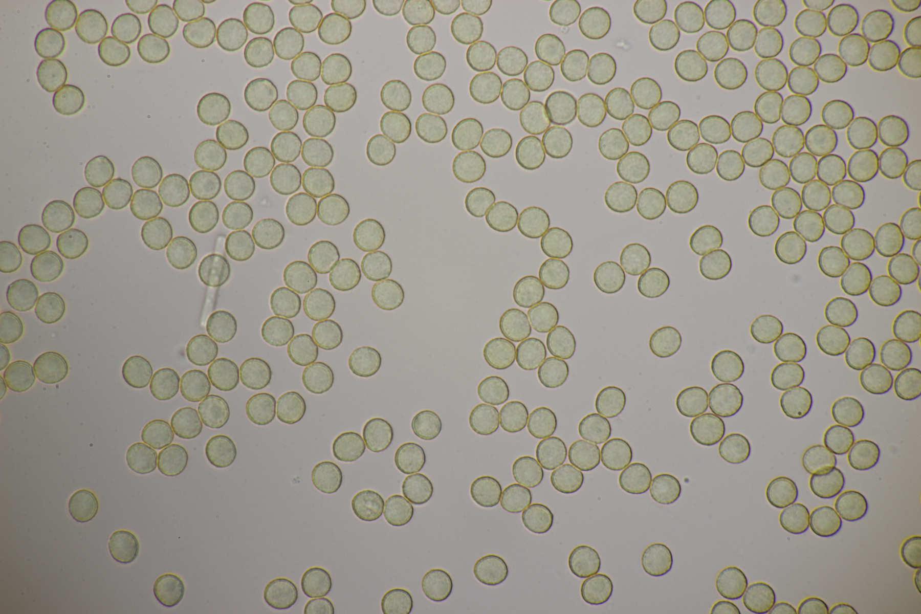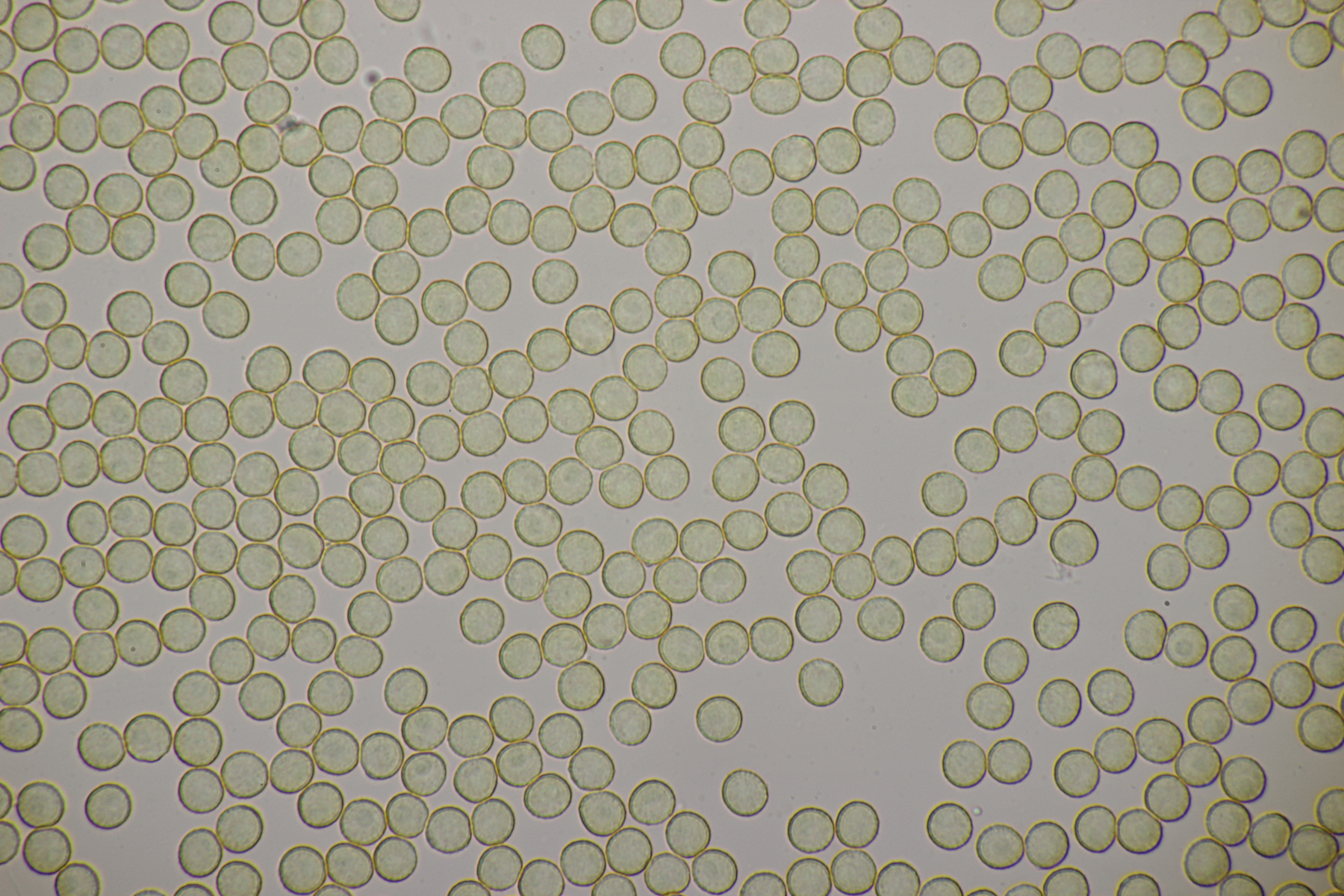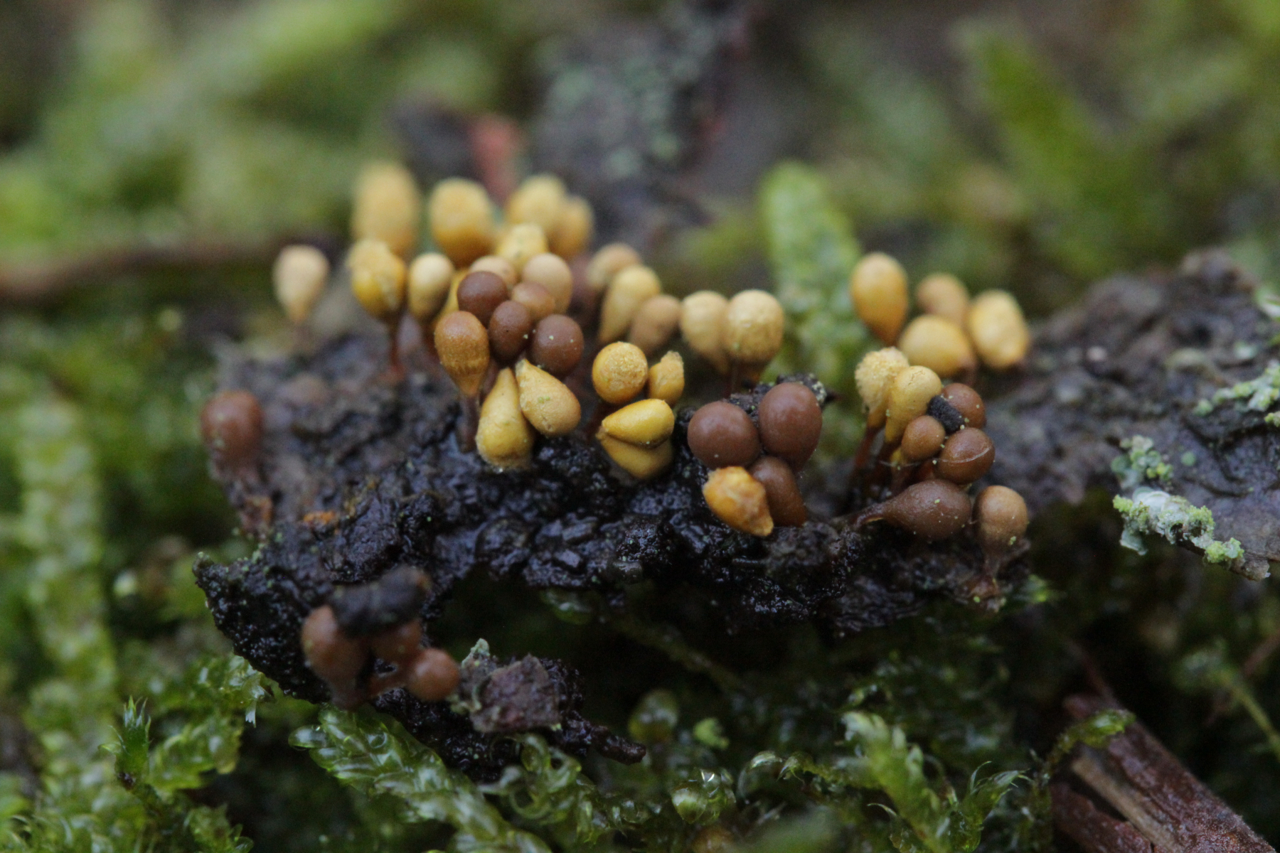 1. Ein Schleimpilz. Sporen messen (8.7+-0.3) µm bzw. (8.2-9.2) µm und ein (Pseudo)capillitium konnte ich leider nicht finden. Auffällig ist, daß das Innere von weißem Material (wie die Außenhaut) in kleine Kammern unterteilt wird. Hat fast etwas von einem Granatapfel. Das Substrat war ein Nadelholzstumpf. Im Feld habe ich erstmal an Enteridium lycoperdon gedacht, aber das paßt vom Sporenornament her nicht. Gibt es Ideen von den Schleimpilzexperten? lamproderma
