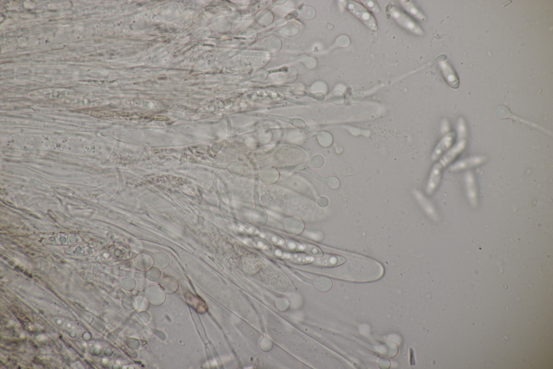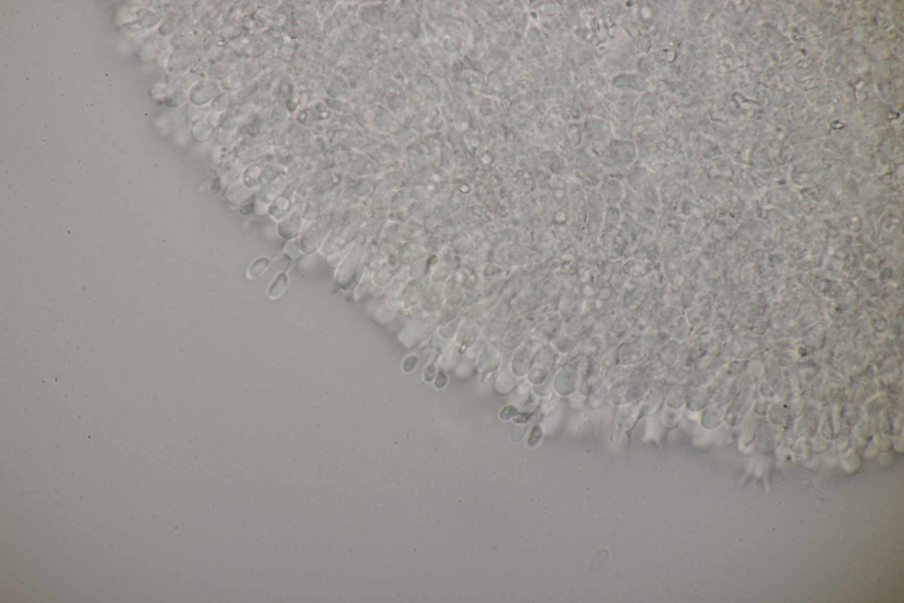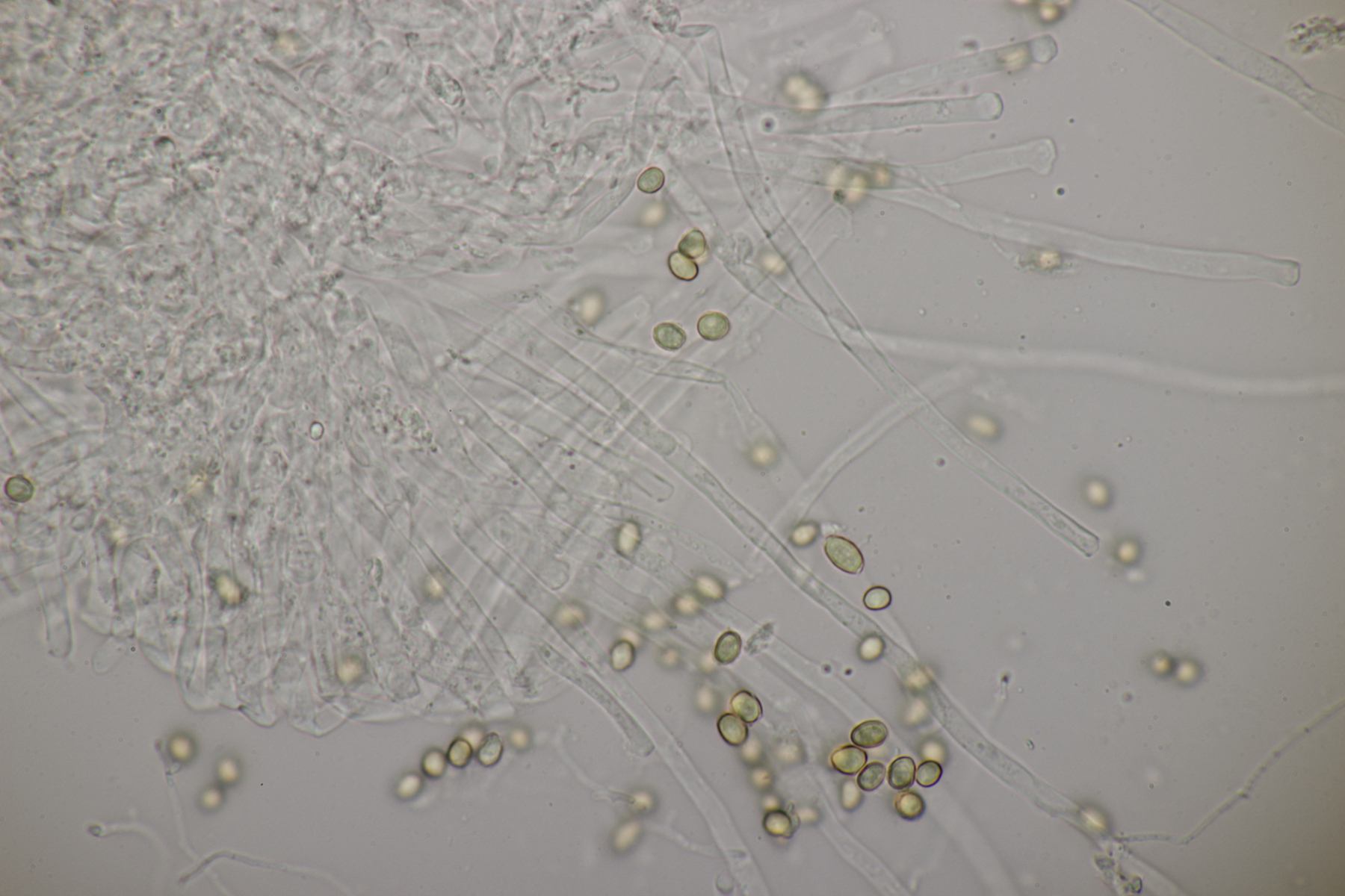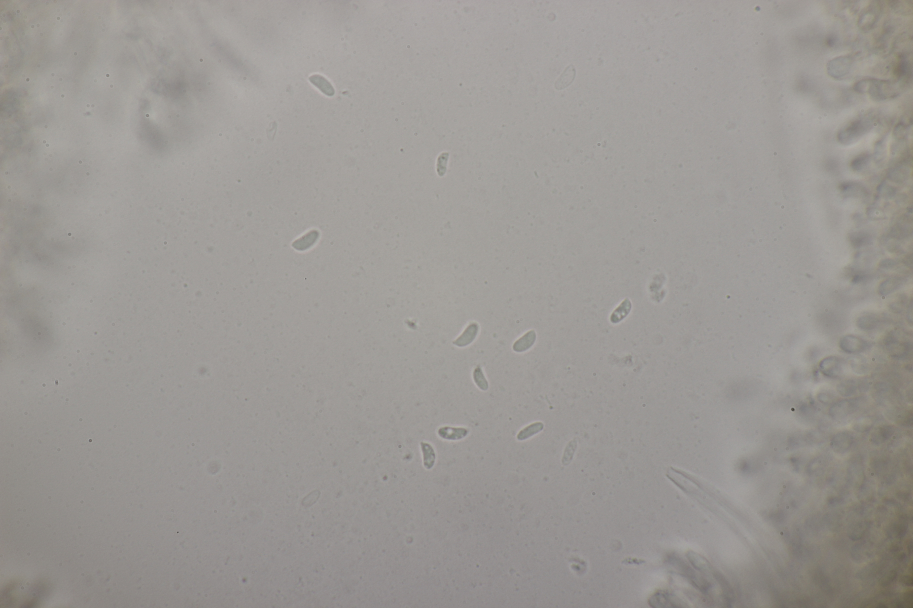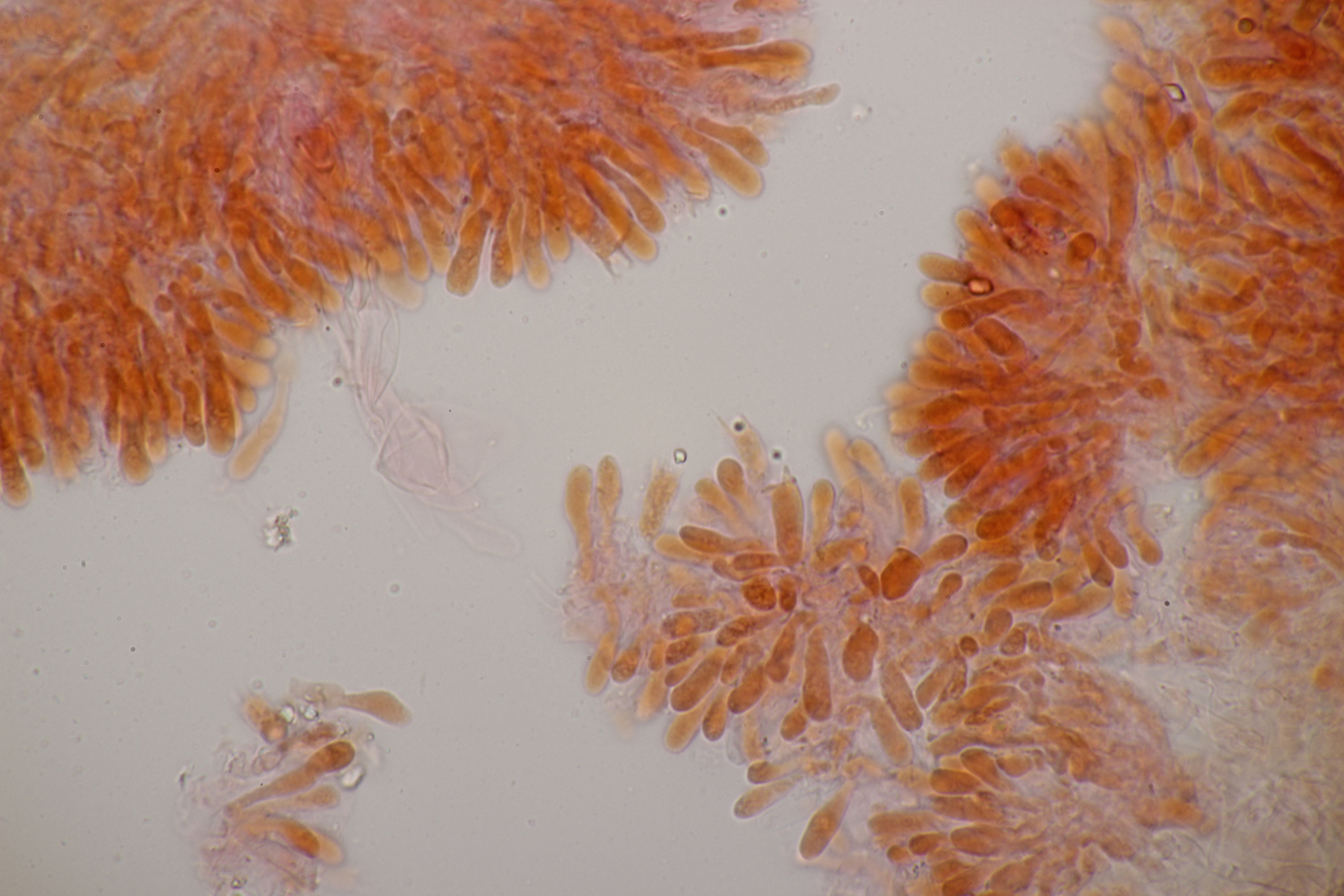 2. Am gleichen Stubben dann ein stacheliger Geselle, den ich gerne Mucronella calva nennen möchte. Sporengröße (4.2+-0.2) µm x (2.9+-0.2) µm, Q=1.4+-0.1, (3.7-4.5) µm x (2.5-3.3) µm, Q=1.3-1.7