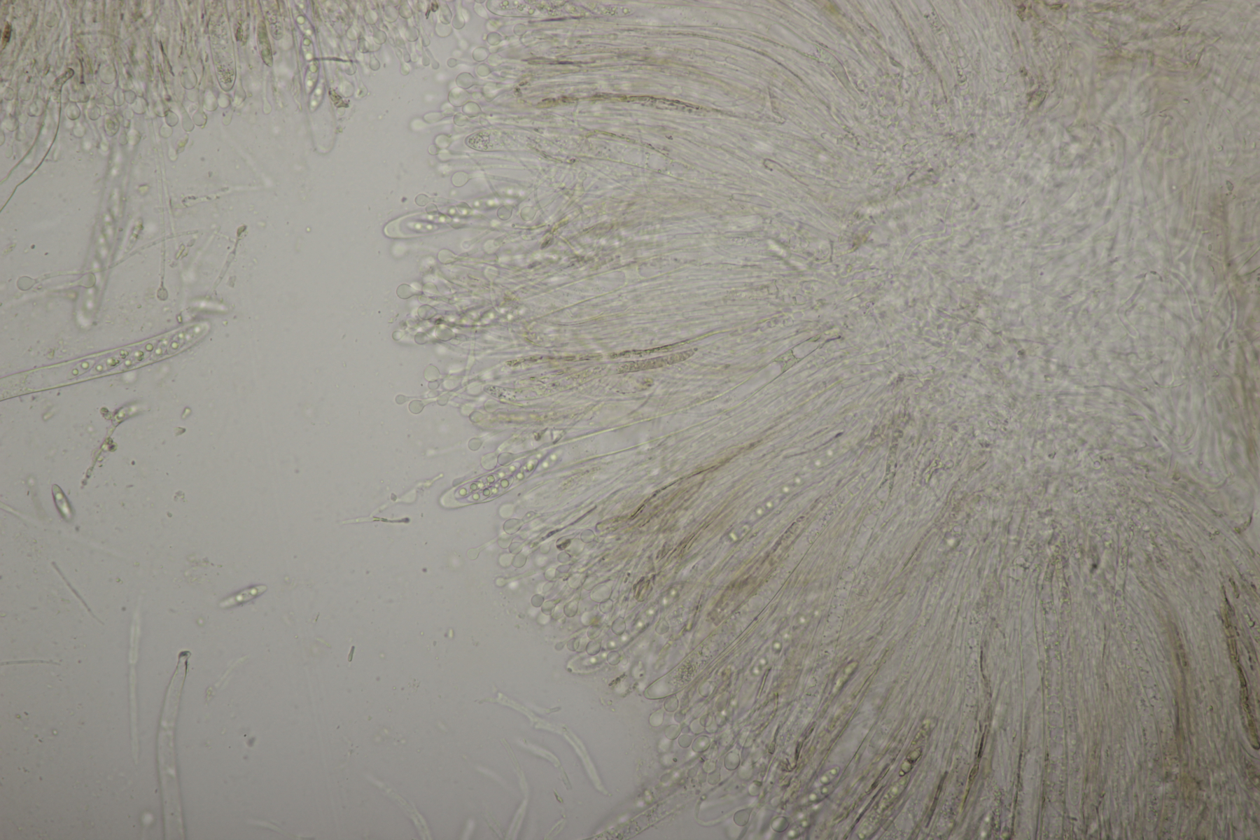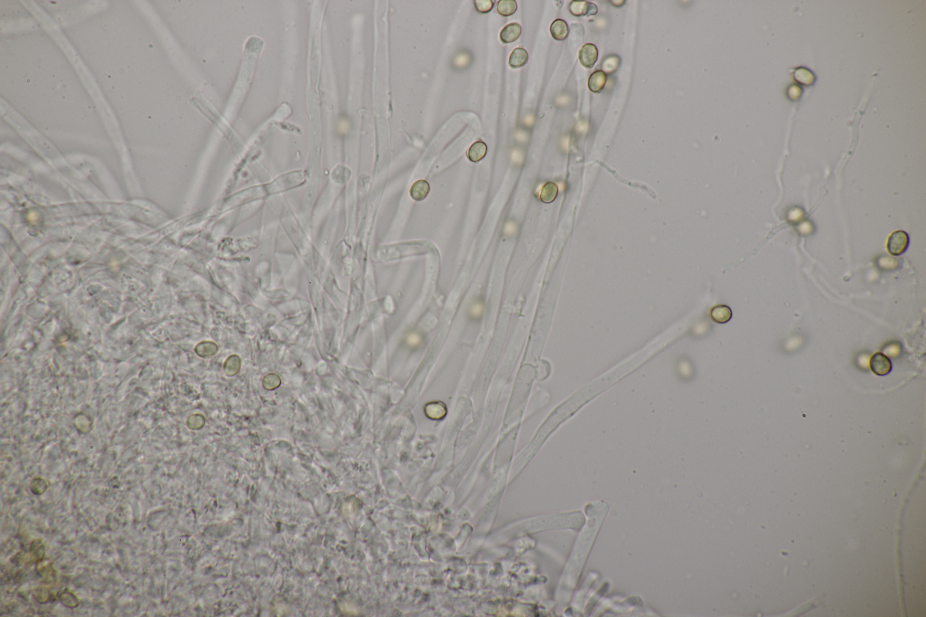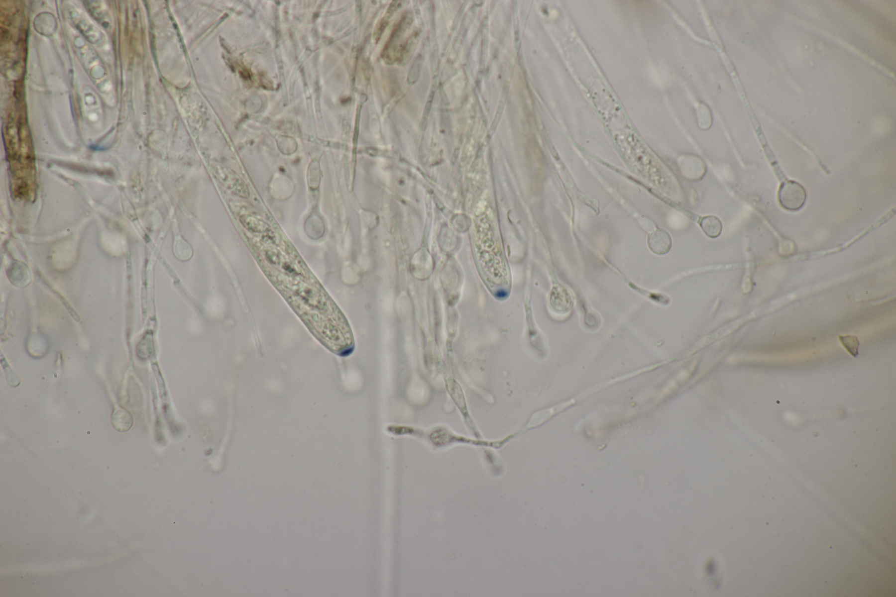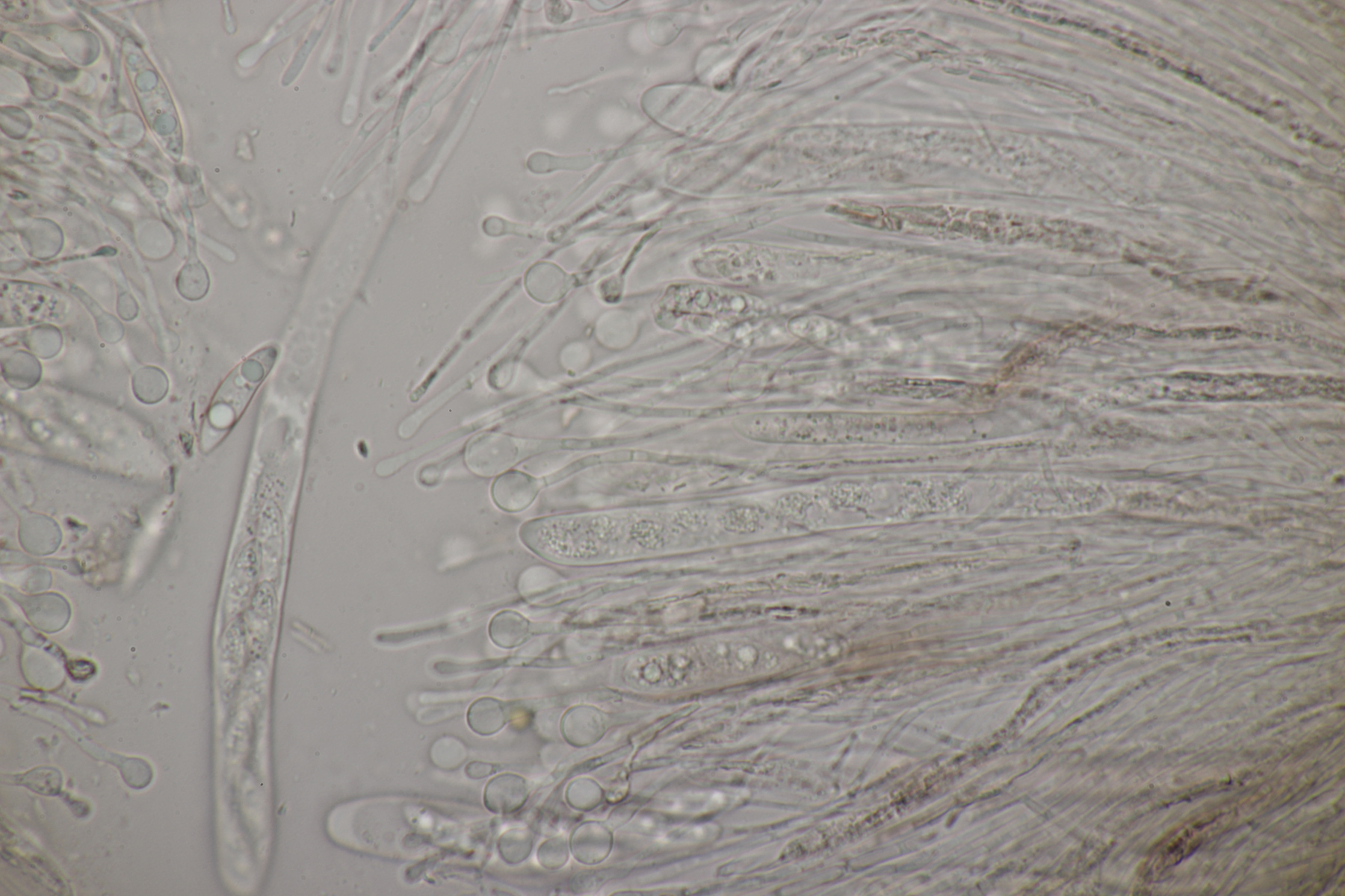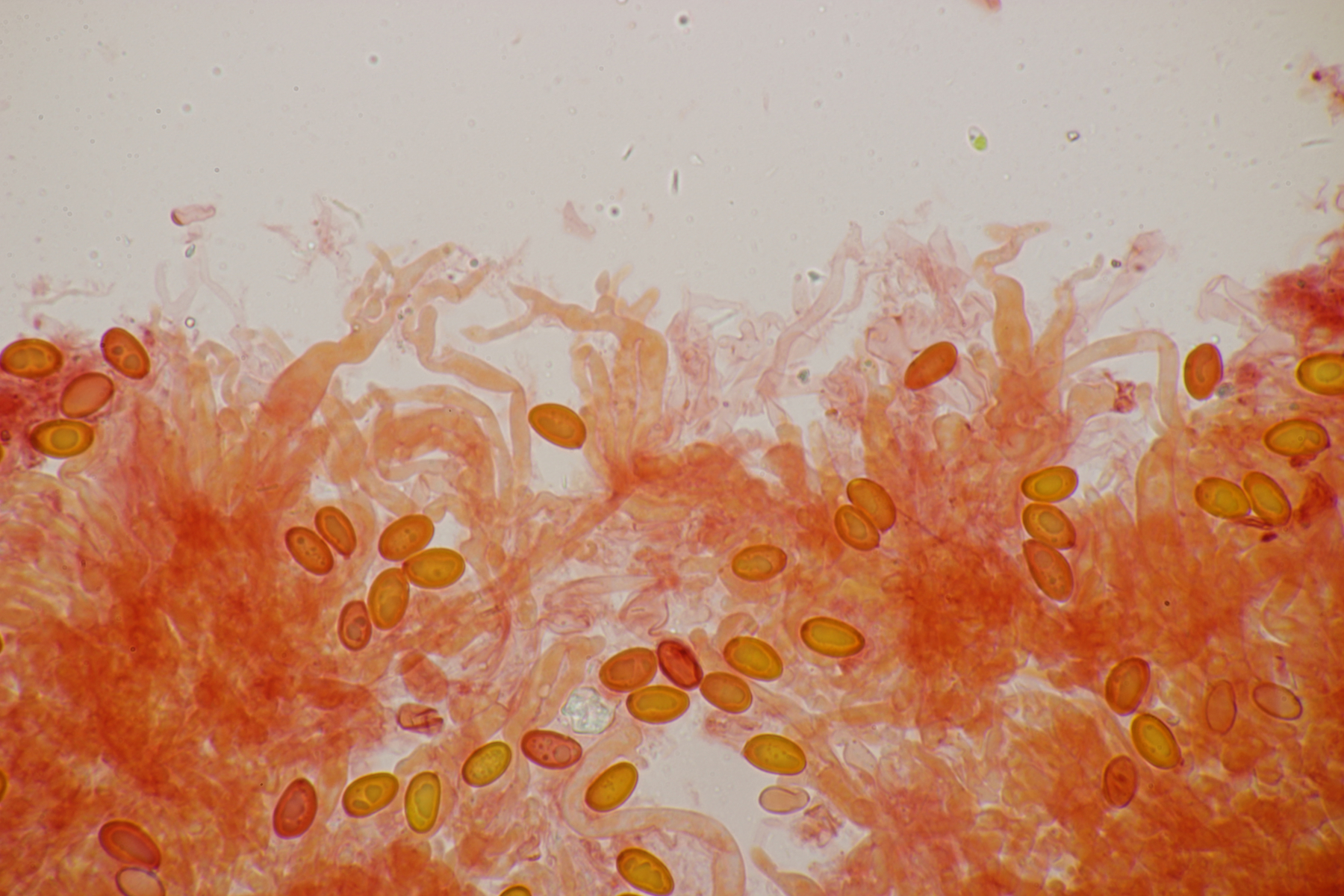 2. Am gleichen Stubben dann ein stacheliger Geselle, den ich gerne Mucronella calva nennen möchte. Sporengröße (4.2+-0.2) µm x (2.9+-0.2) µm, Q=1.4+-0.1, (3.7-4.5) µm x (2.5-3.3) µm, Q=1.3-1.7