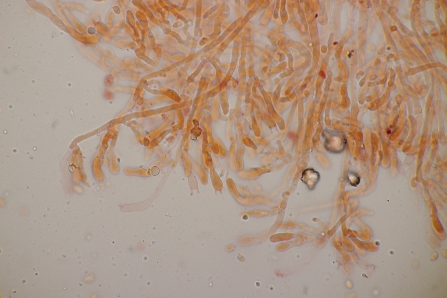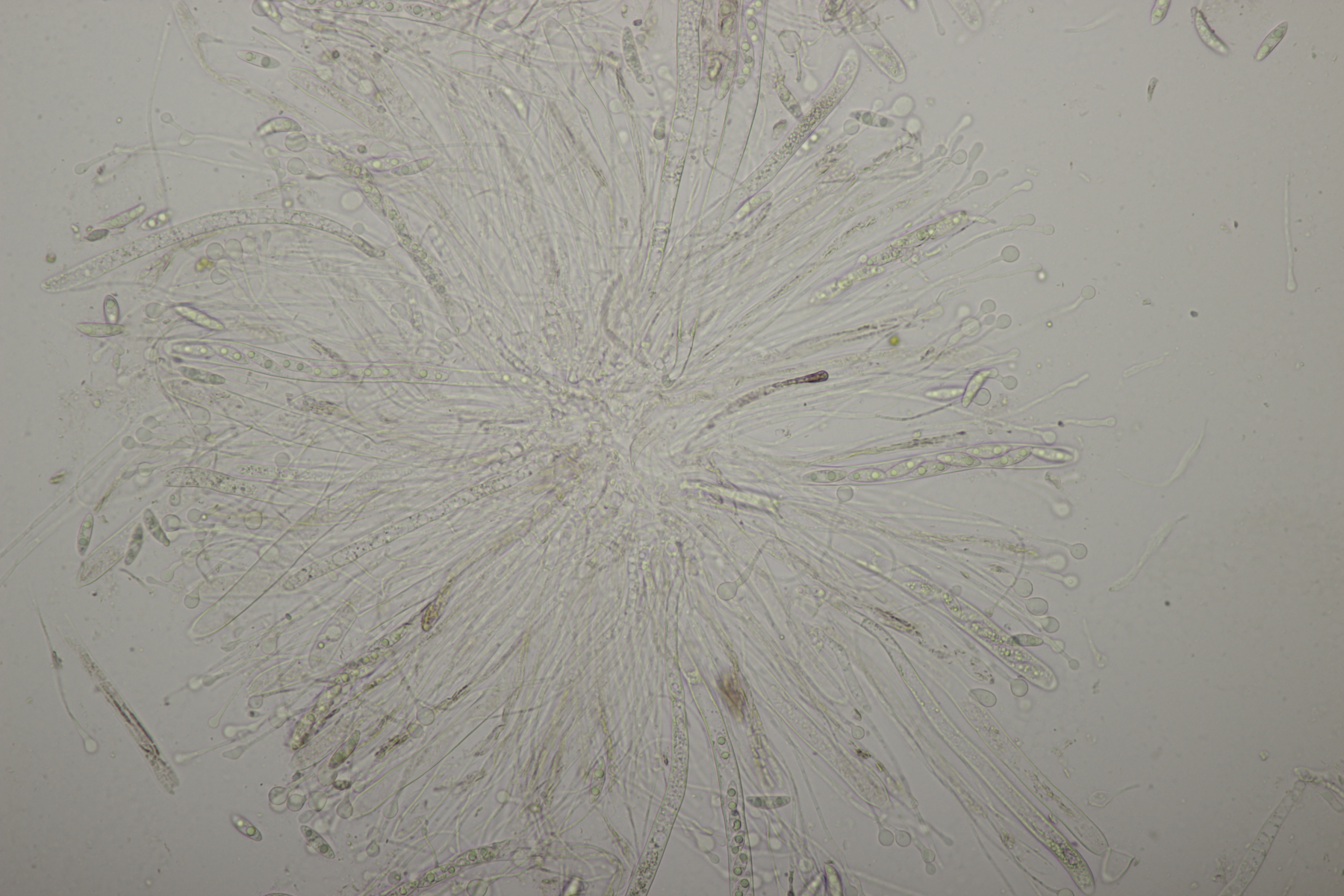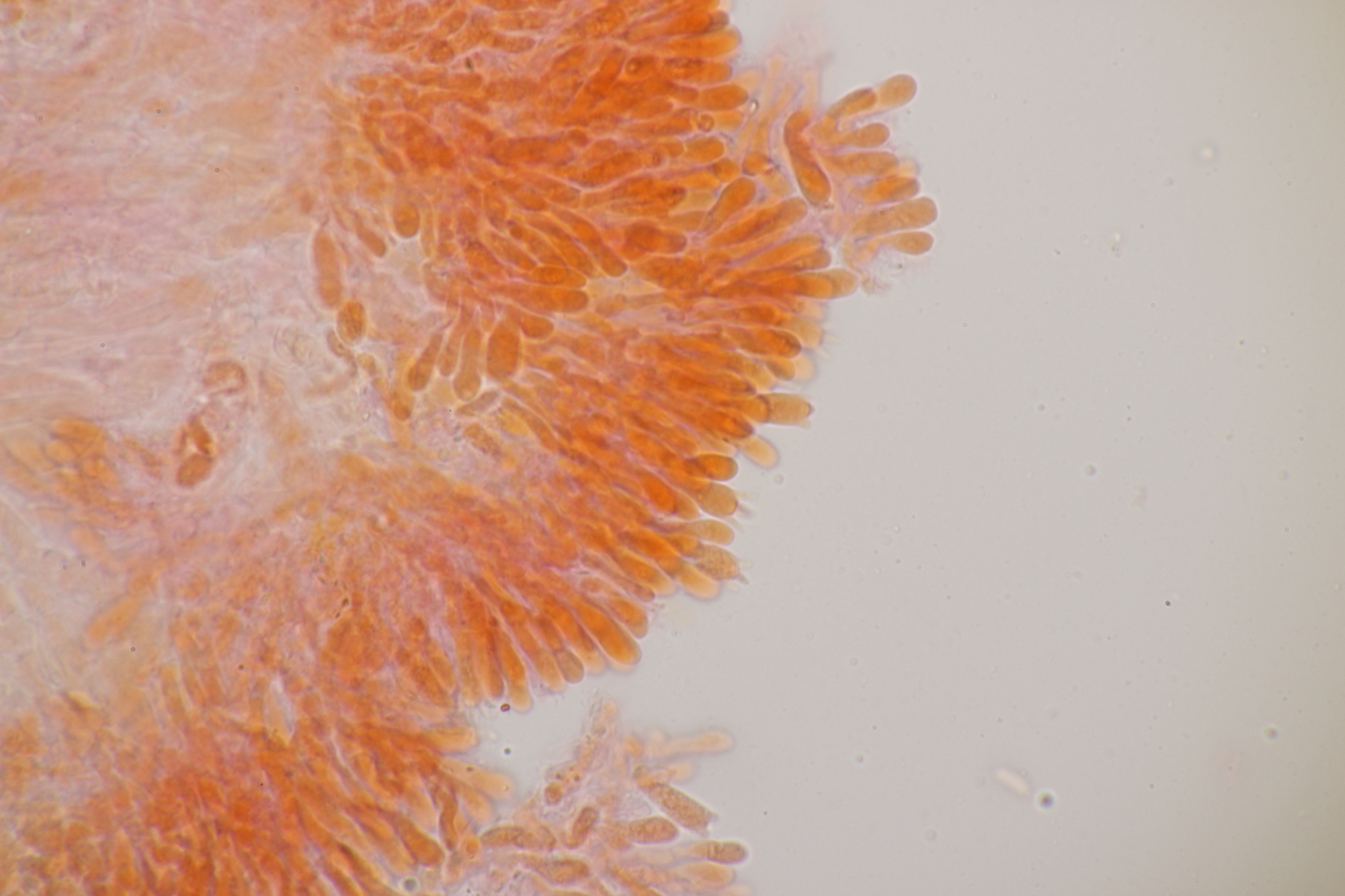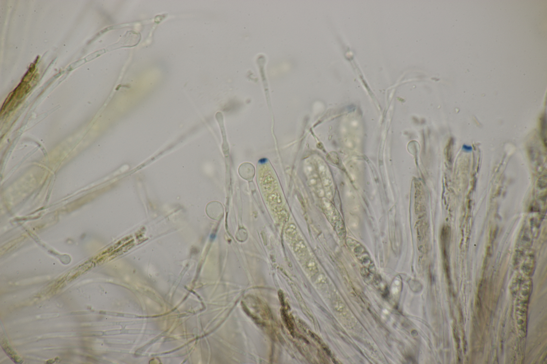 2. Am gleichen Stubben dann ein stacheliger Geselle, den ich gerne Mucronella calva nennen möchte. Sporengröße (4.2+-0.2) µm x (2.9+-0.2) µm, Q=1.4+-0.1, (3.7-4.5) µm x (2.5-3.3) µm, Q=1.3-1.7