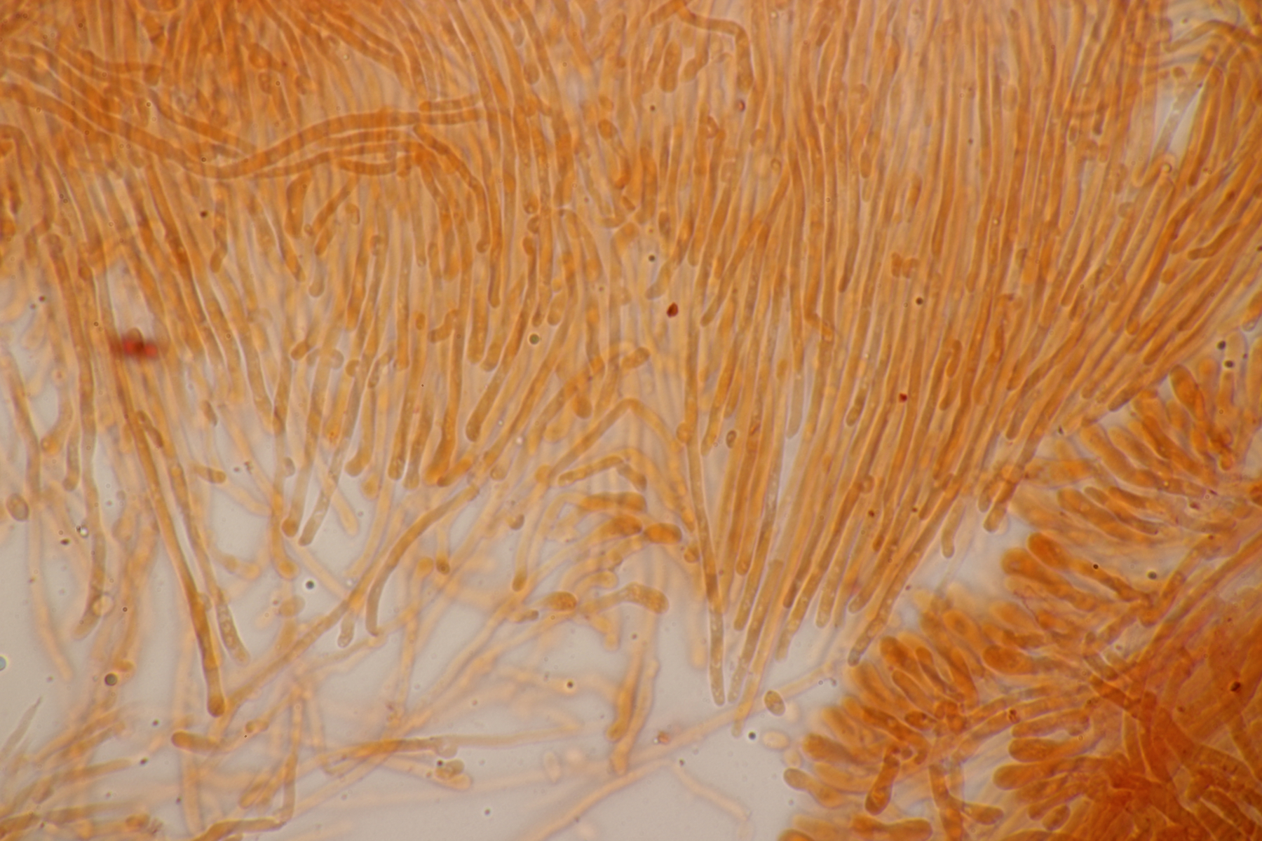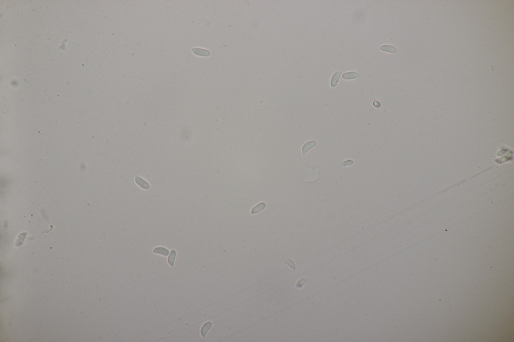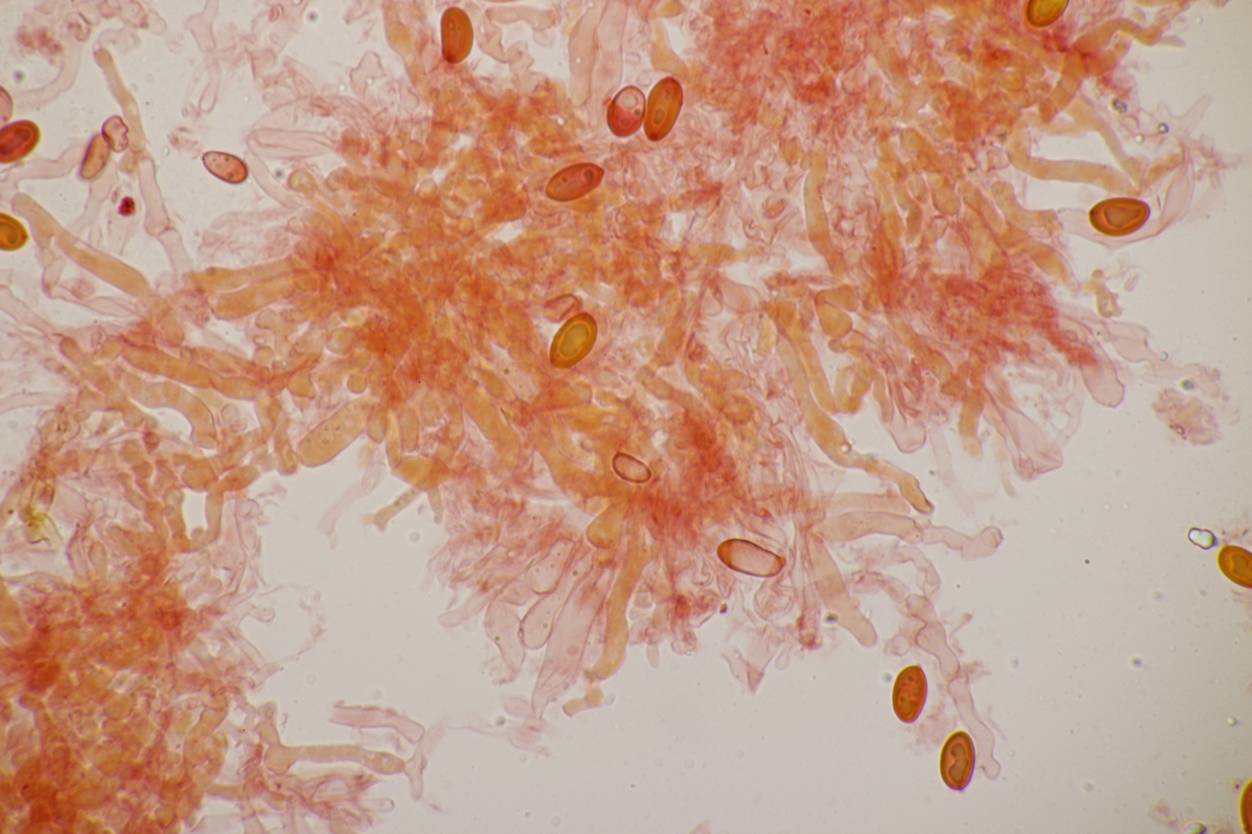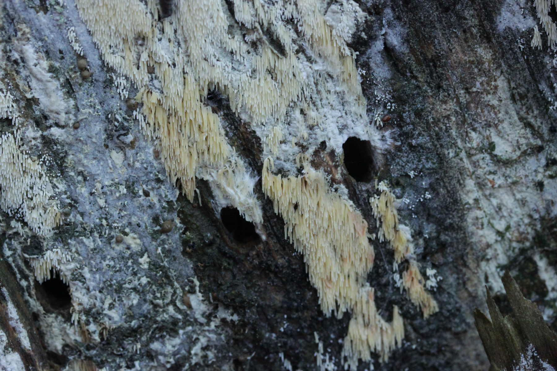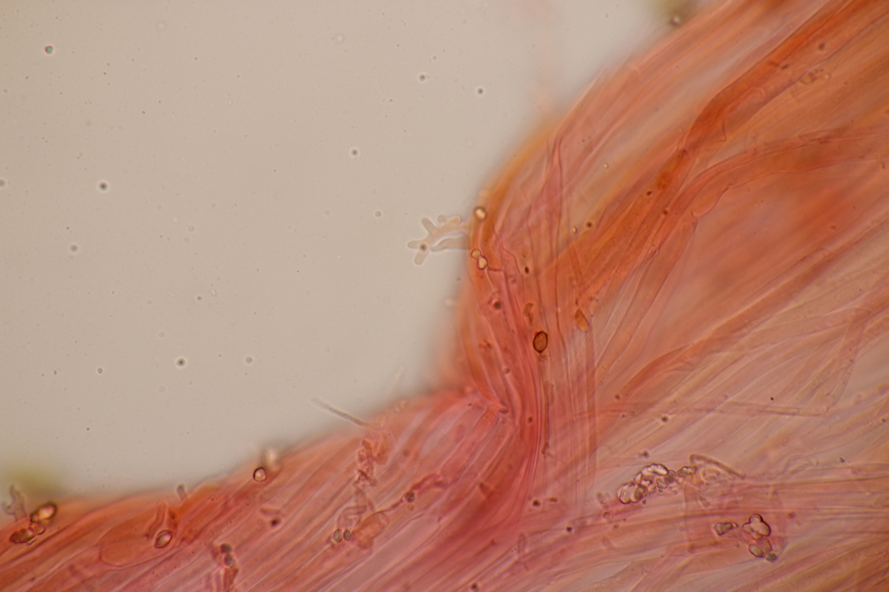 2. Am gleichen Stubben dann ein stacheliger Geselle, den ich gerne Mucronella calva nennen möchte. Sporengröße (4.2+-0.2) µm x (2.9+-0.2) µm, Q=1.4+-0.1, (3.7-4.5) µm x (2.5-3.3) µm, Q=1.3-1.7