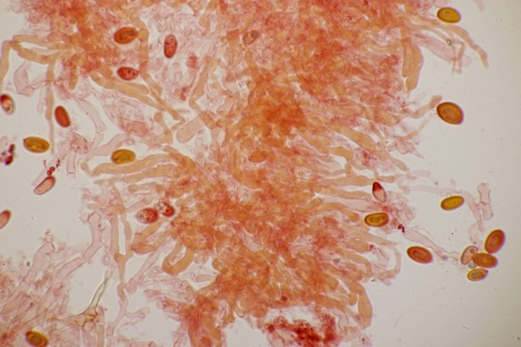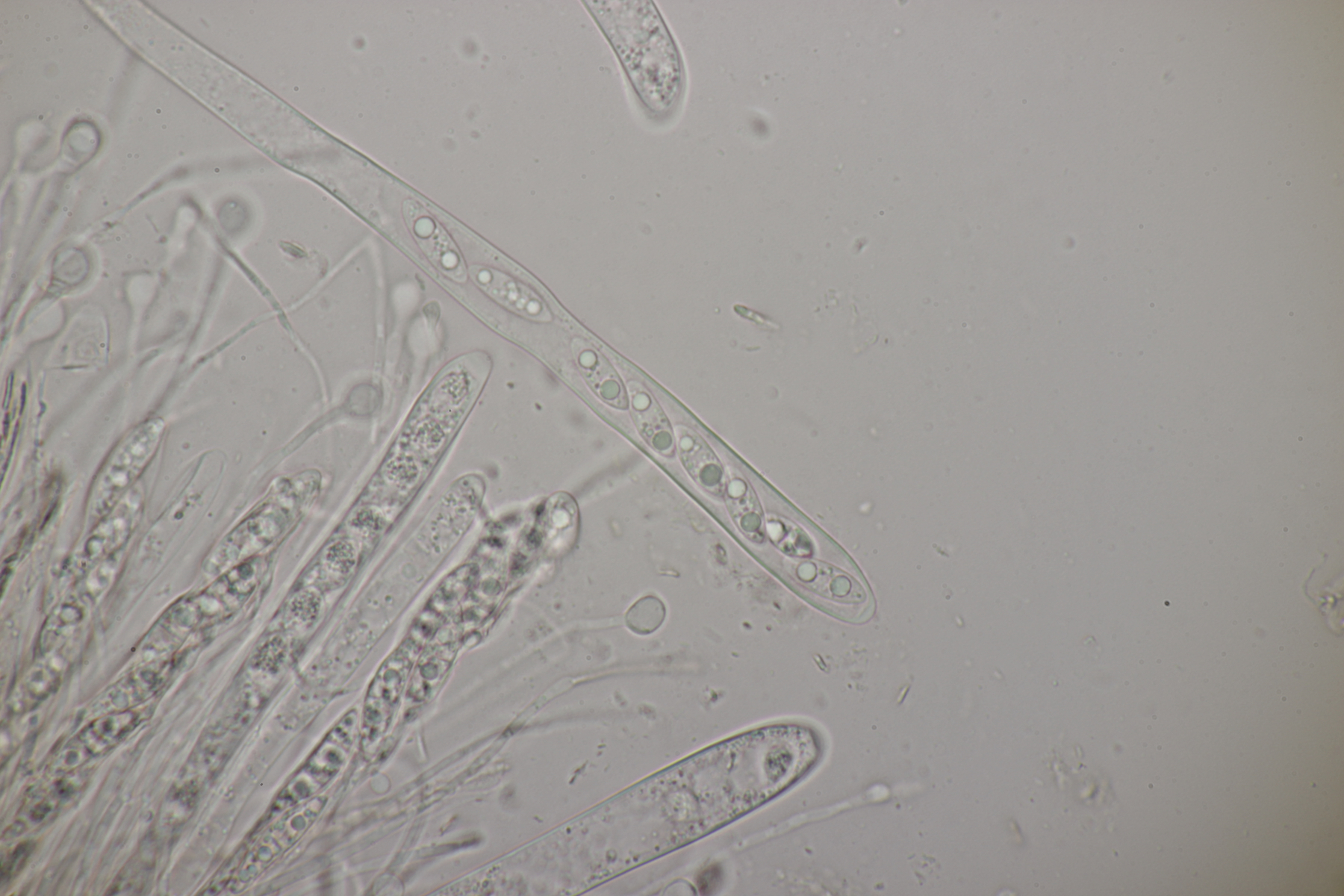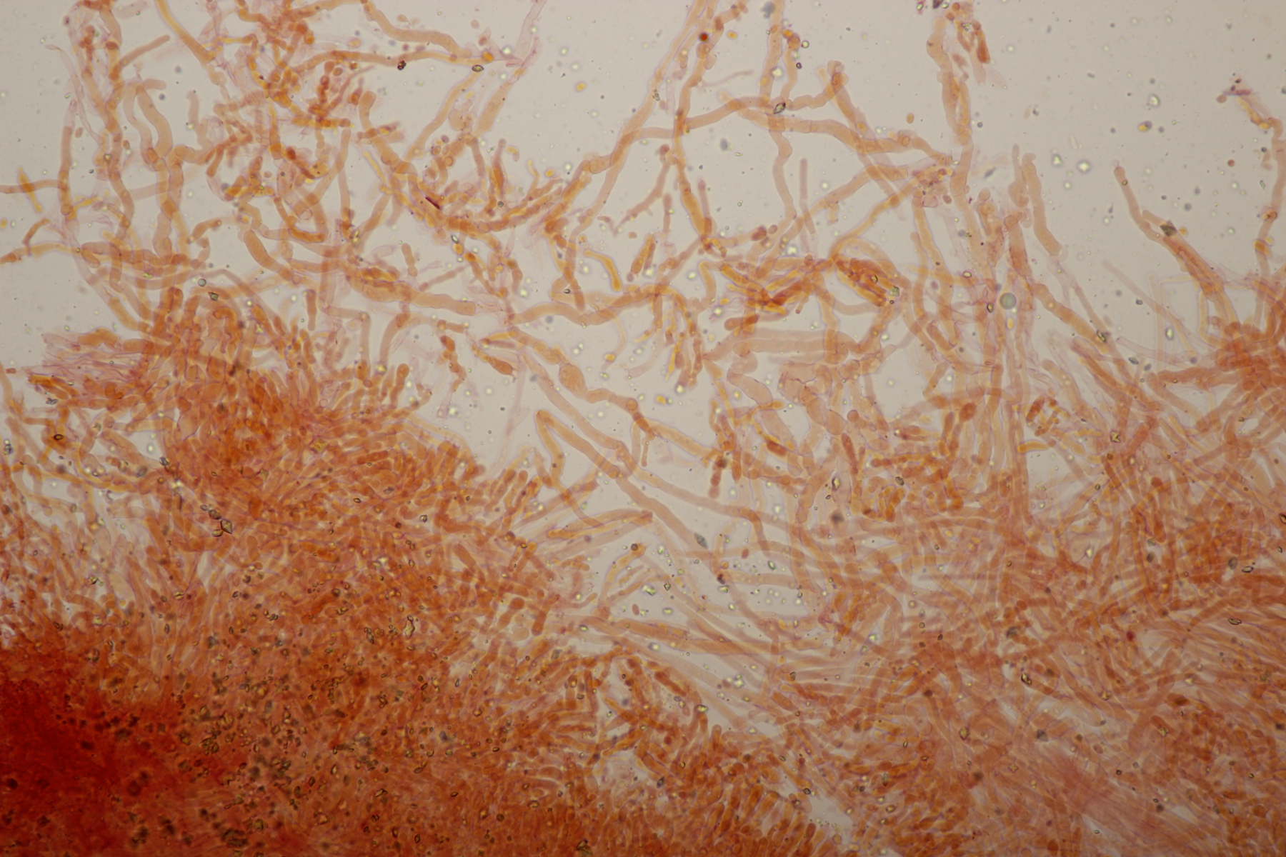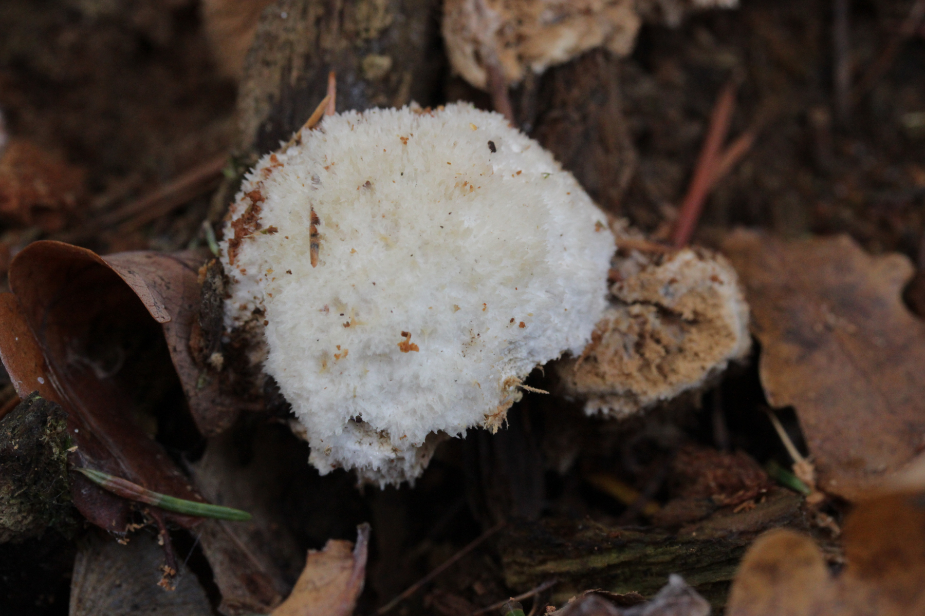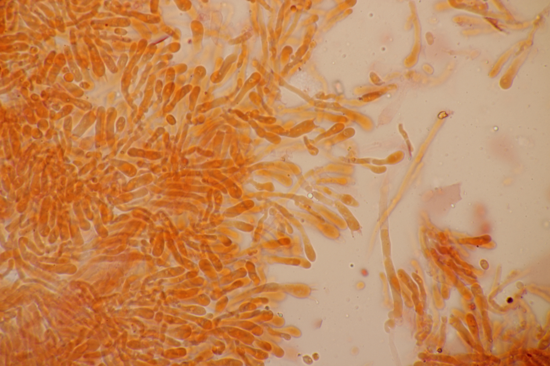2. Am gleichen Stubben dann ein stacheliger Geselle, den ich gerne Mucronella calva nennen möchte. Sporengröße (4.2+-0.2) µm x (2.9+-0.2) µm, Q=1.4+-0.1, (3.7-4.5) µm x (2.5-3.3) µm, Q=1.3-1.7