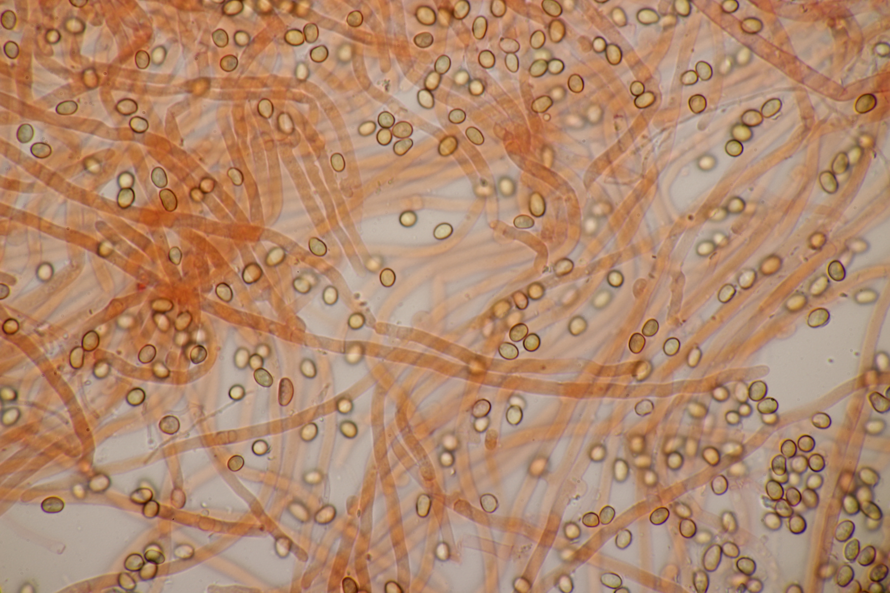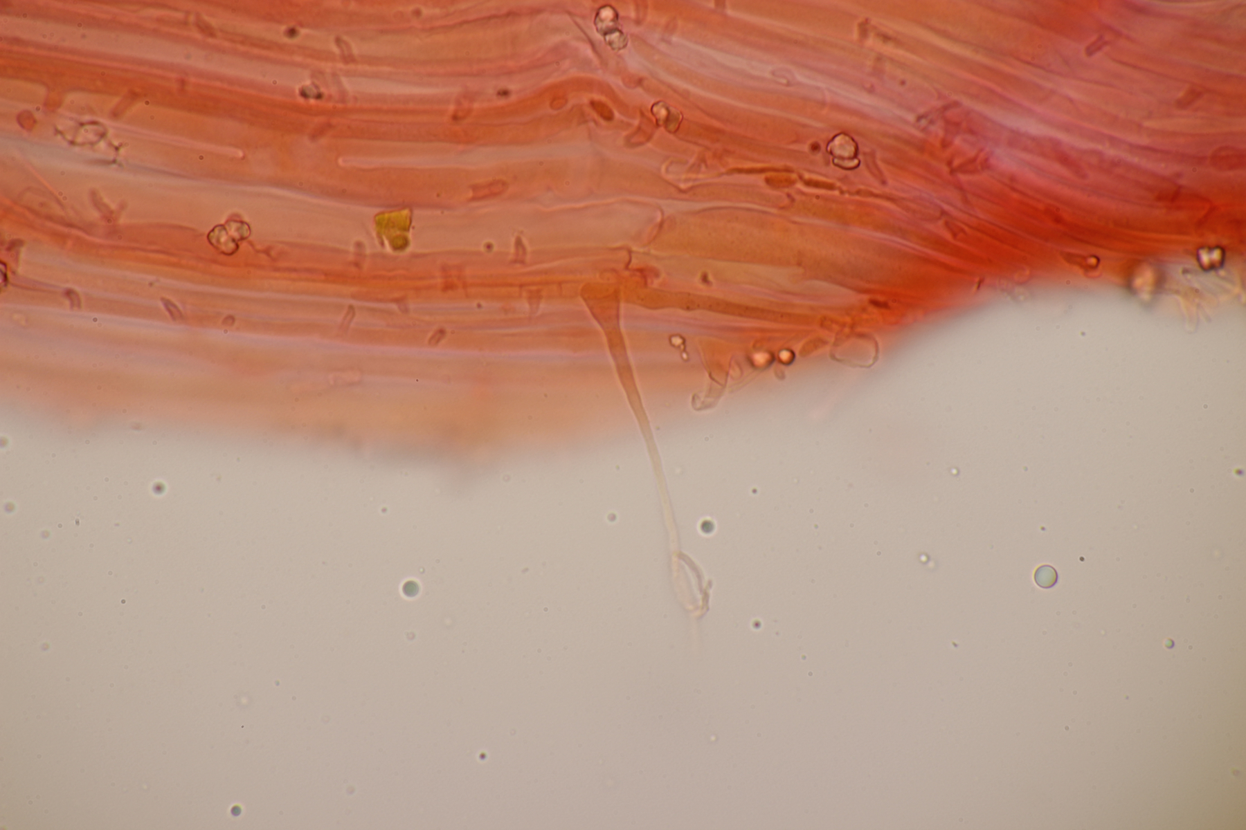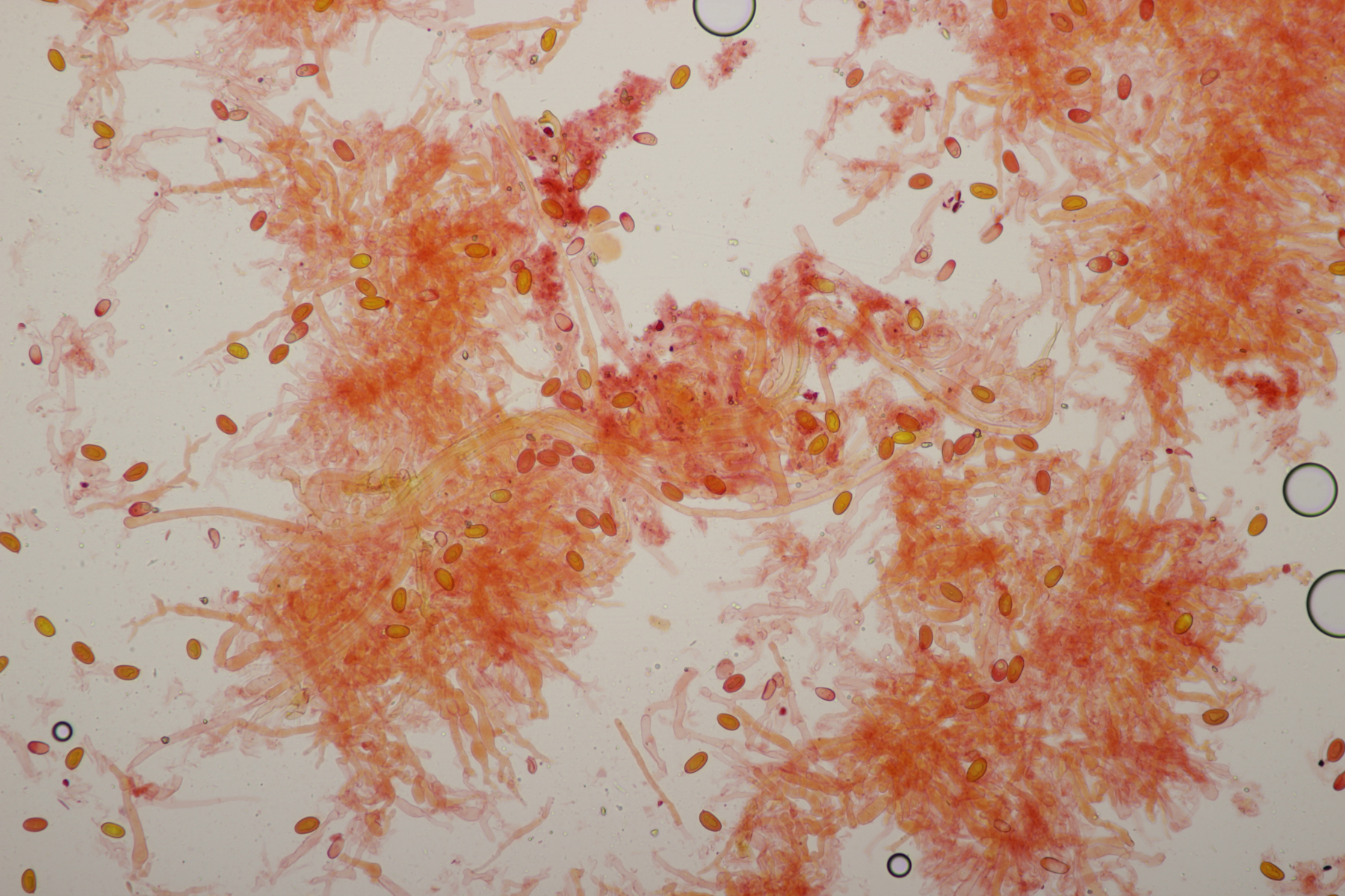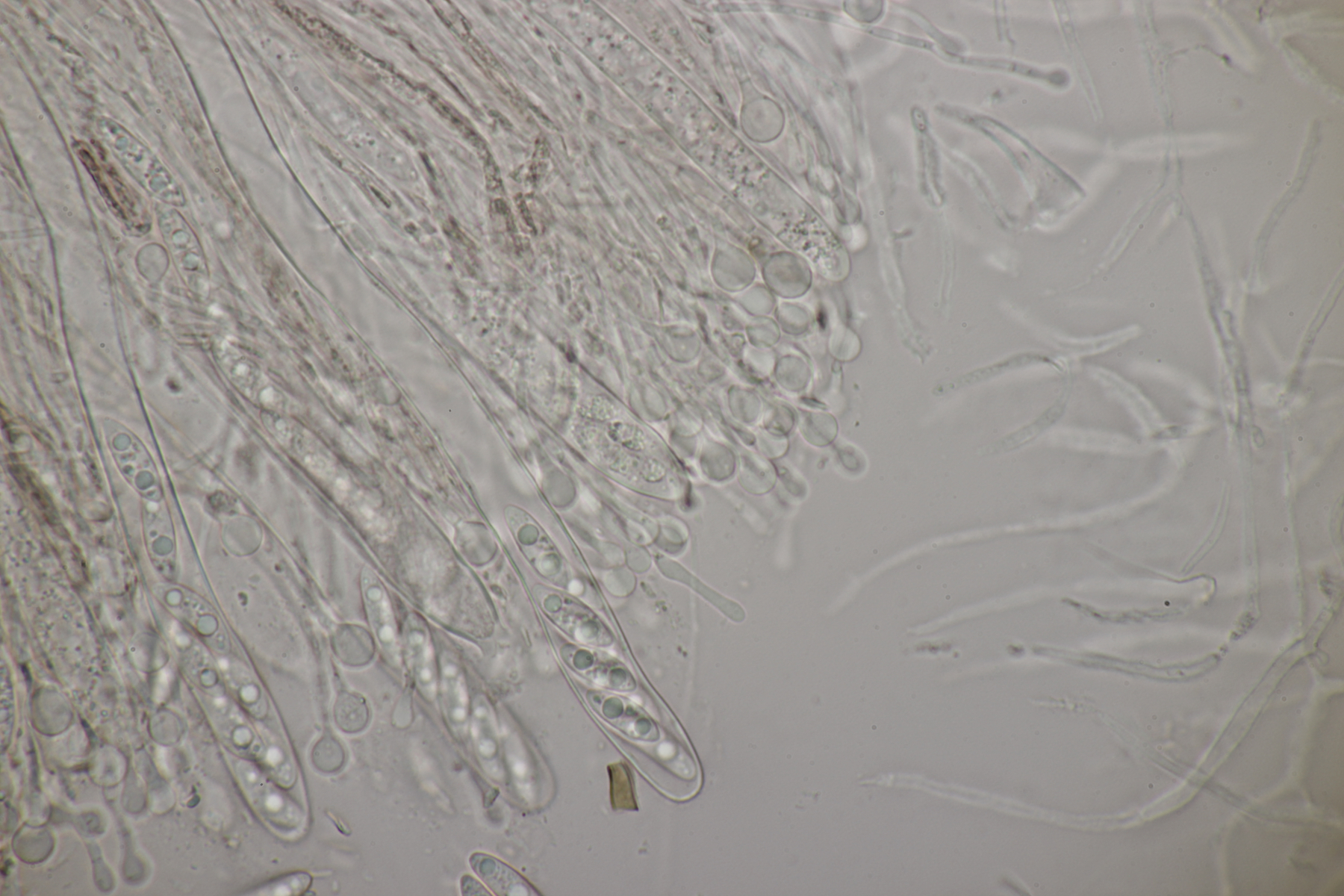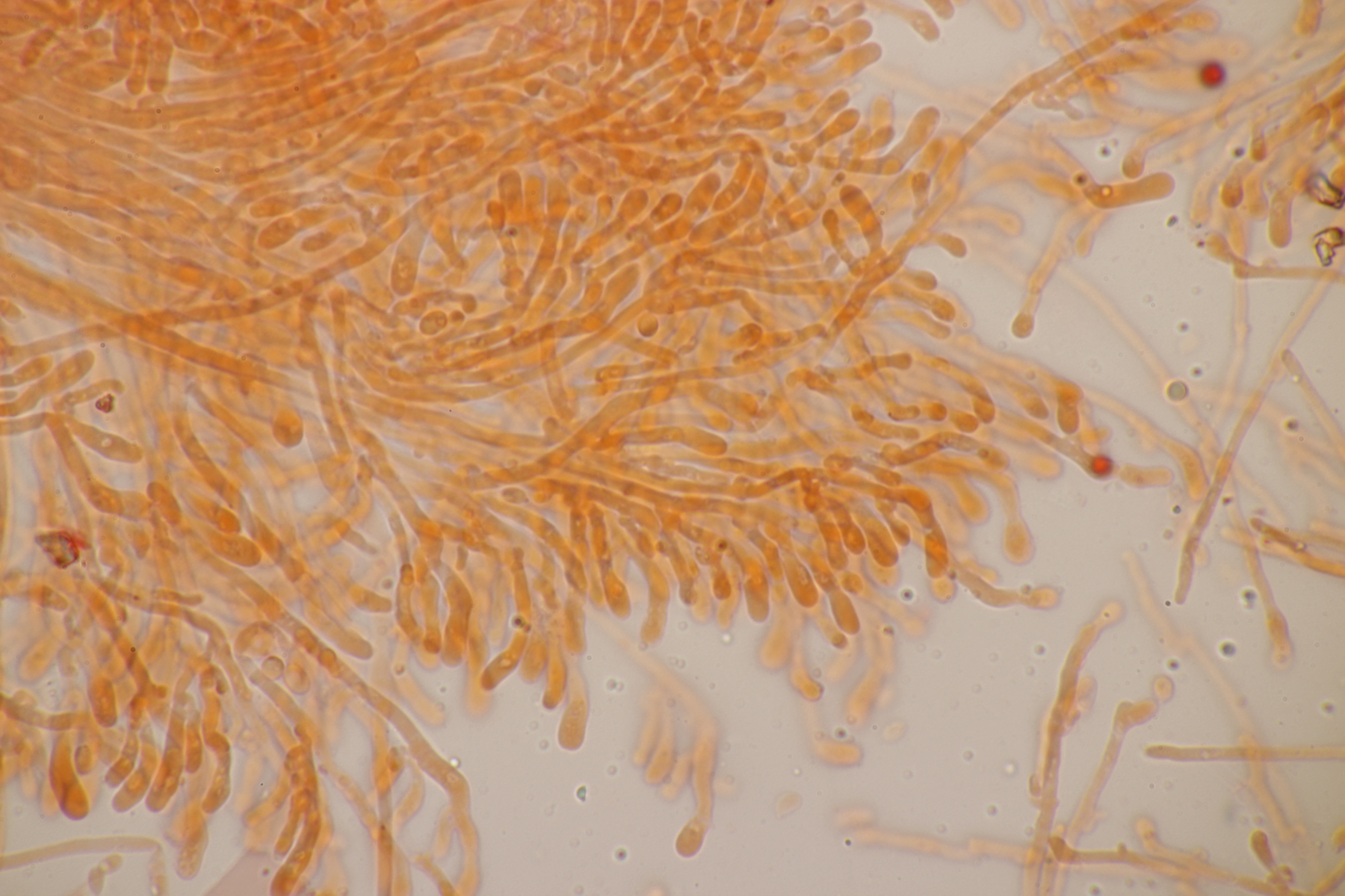 2. Am gleichen Stubben dann ein stacheliger Geselle, den ich gerne Mucronella calva nennen möchte. Sporengröße (4.2+-0.2) µm x (2.9+-0.2) µm, Q=1.4+-0.1, (3.7-4.5) µm x (2.5-3.3) µm, Q=1.3-1.7