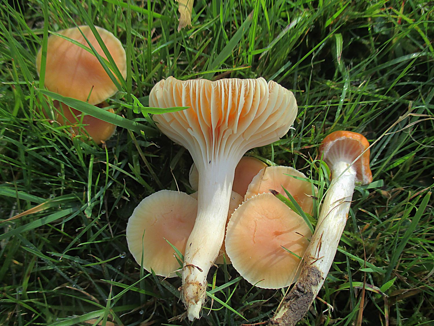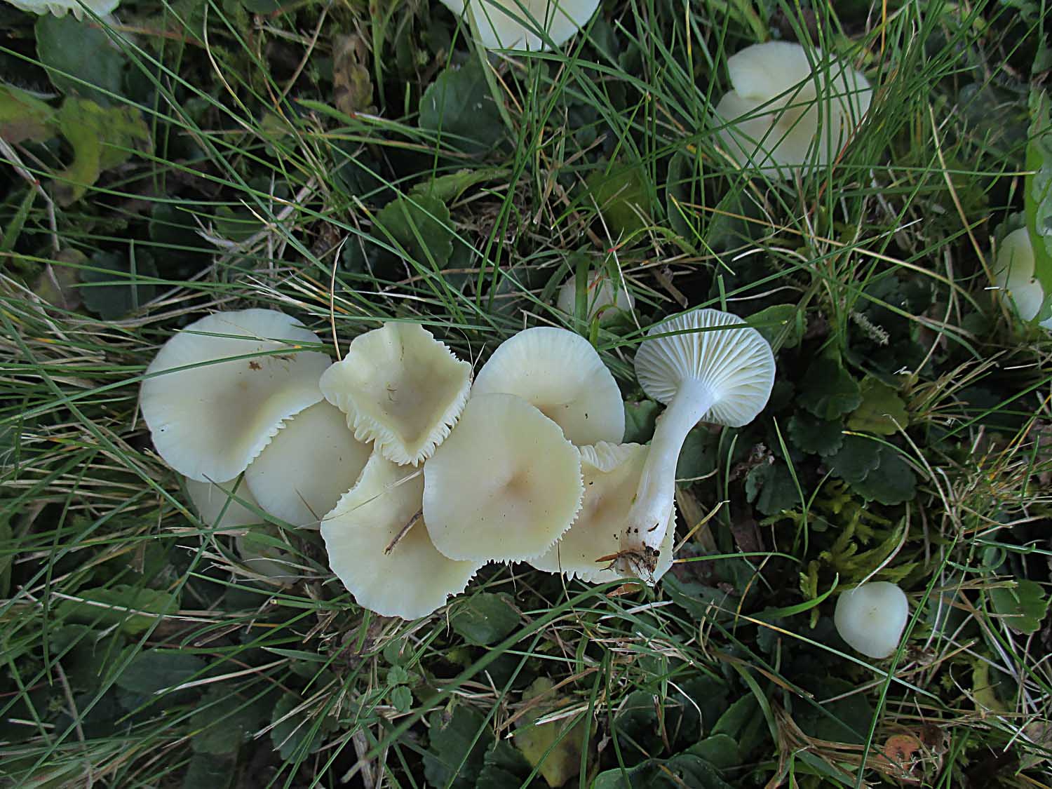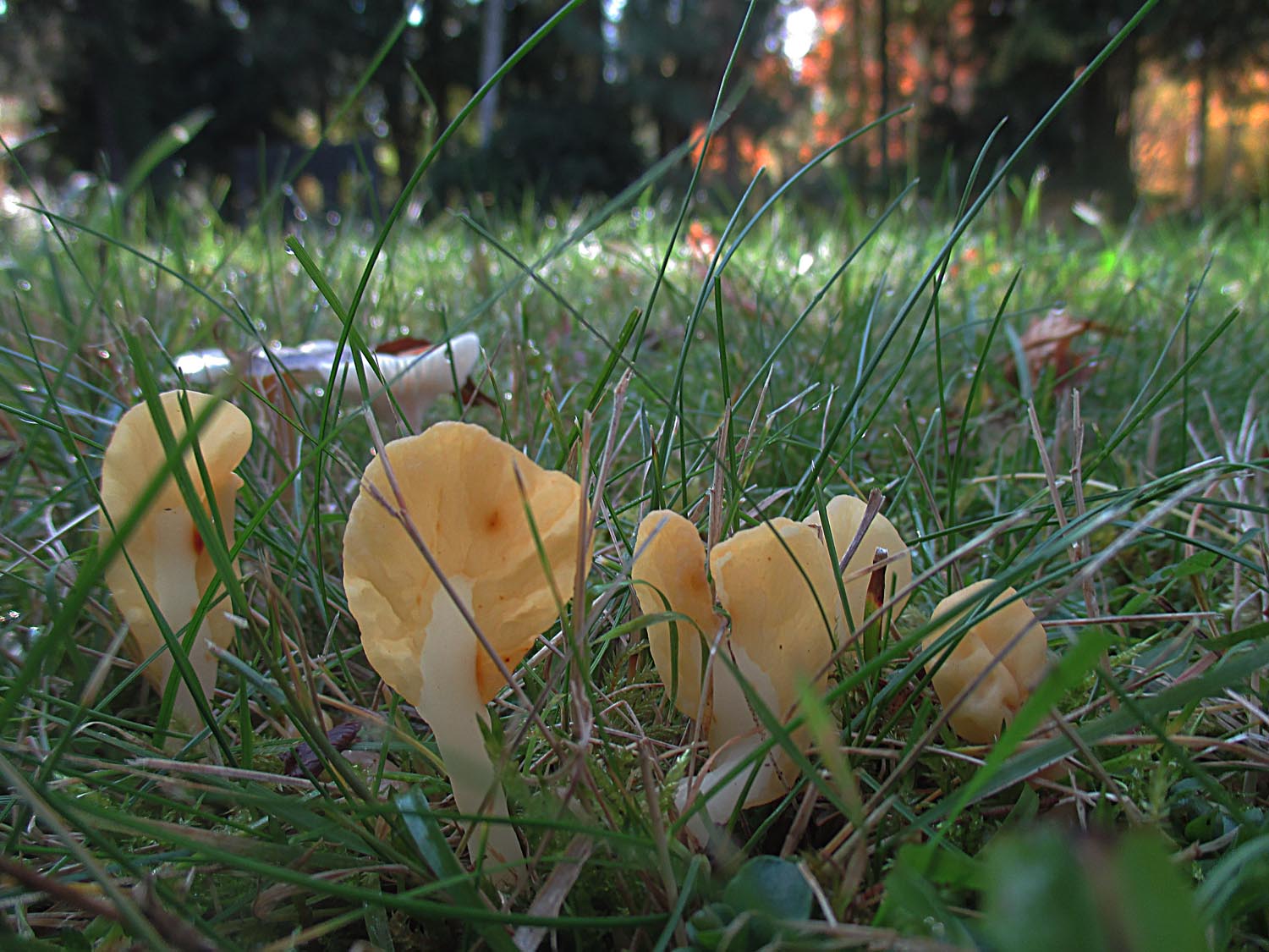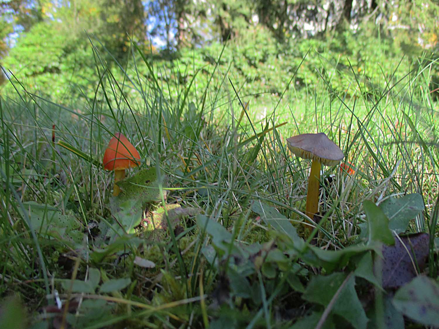 Sehr viele der Orangeellerlinge (Cuphophyllus pratensis) und Jungfernellerlinge (Cuphophyllus virgineus) hatten die Laubbläserattaken nicht überlebt.
