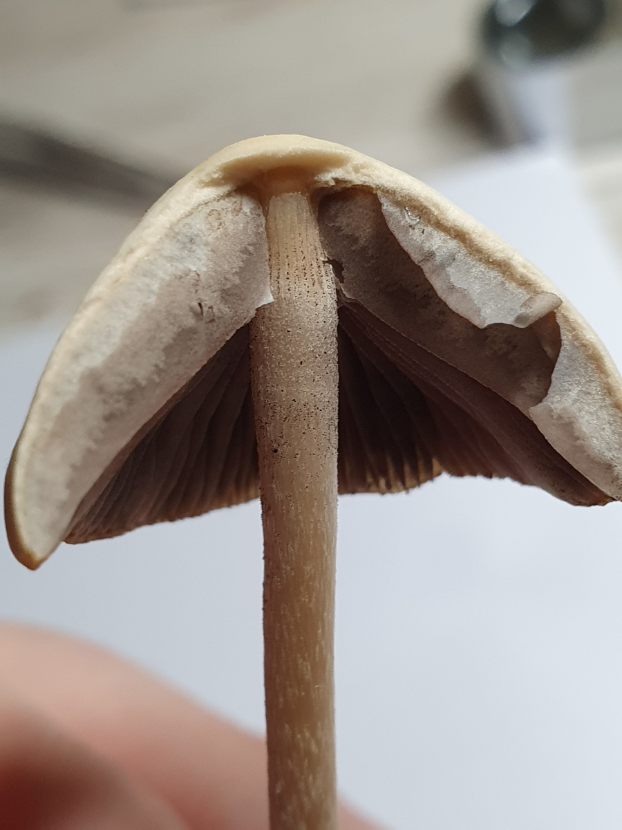 Lamellen beim Fund von letzter Woche eher gräulich wie auch die ganze Gestalt. Der Fund von letzter Woche zeigt auch noch ein deutlich kräftigeres Velum.