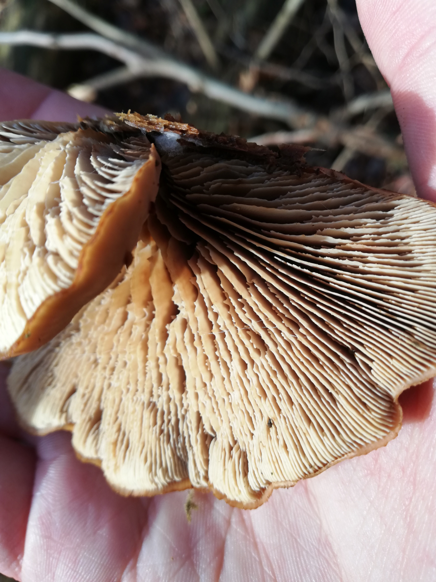 Der hier hat ein bisschen was von einem Seitling, da 0 Stiel und an Nadelholz wachsend, pilzartiger, leicht muffiger Geruch (fast angenehm), doch die Farbe und die gezähnten Lamellen lassen mich ziemlich ratlos dastehen.