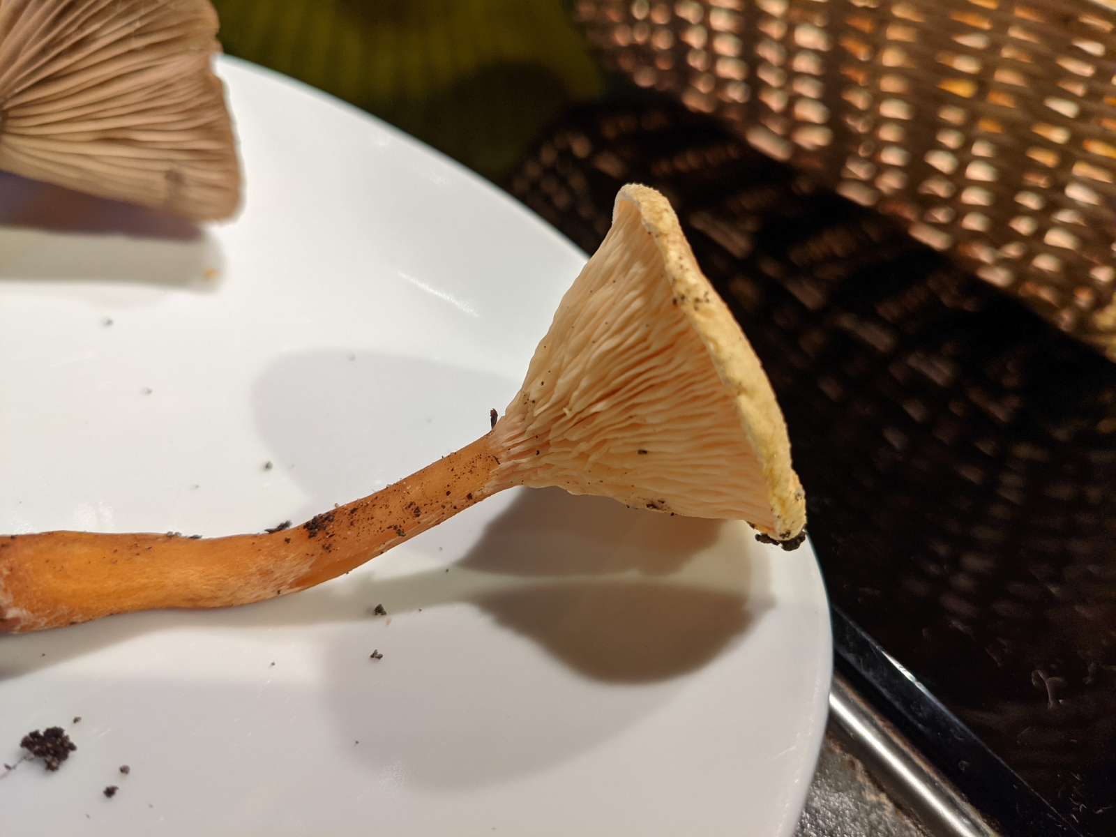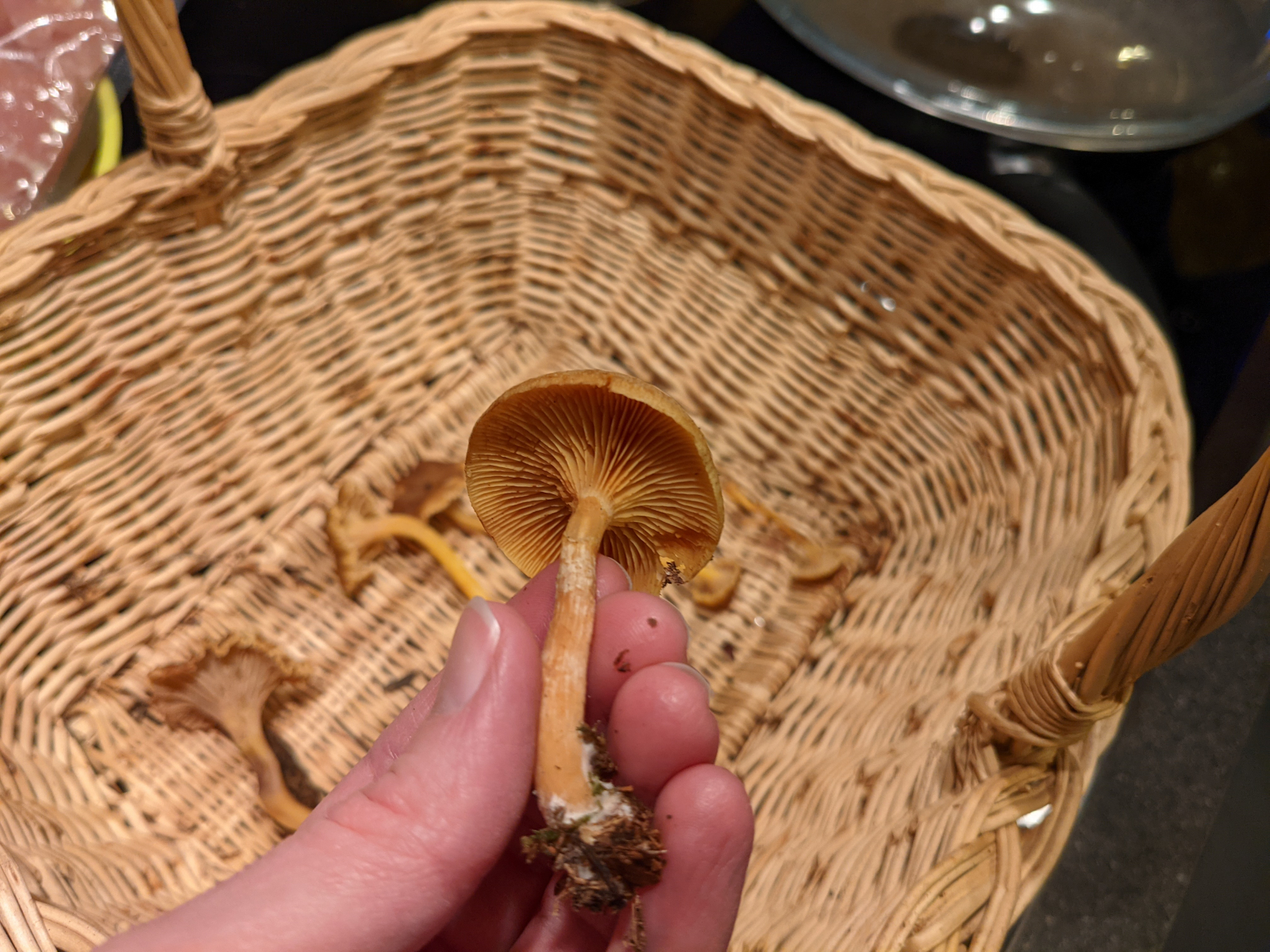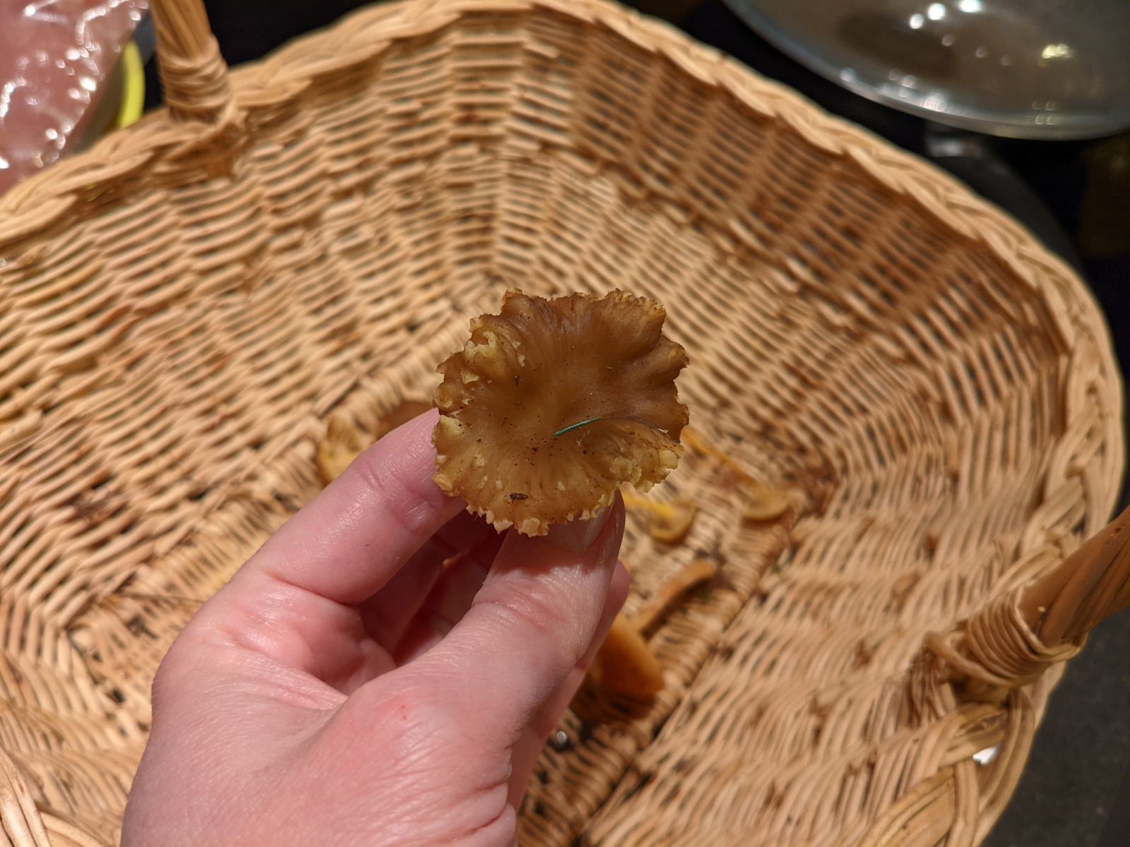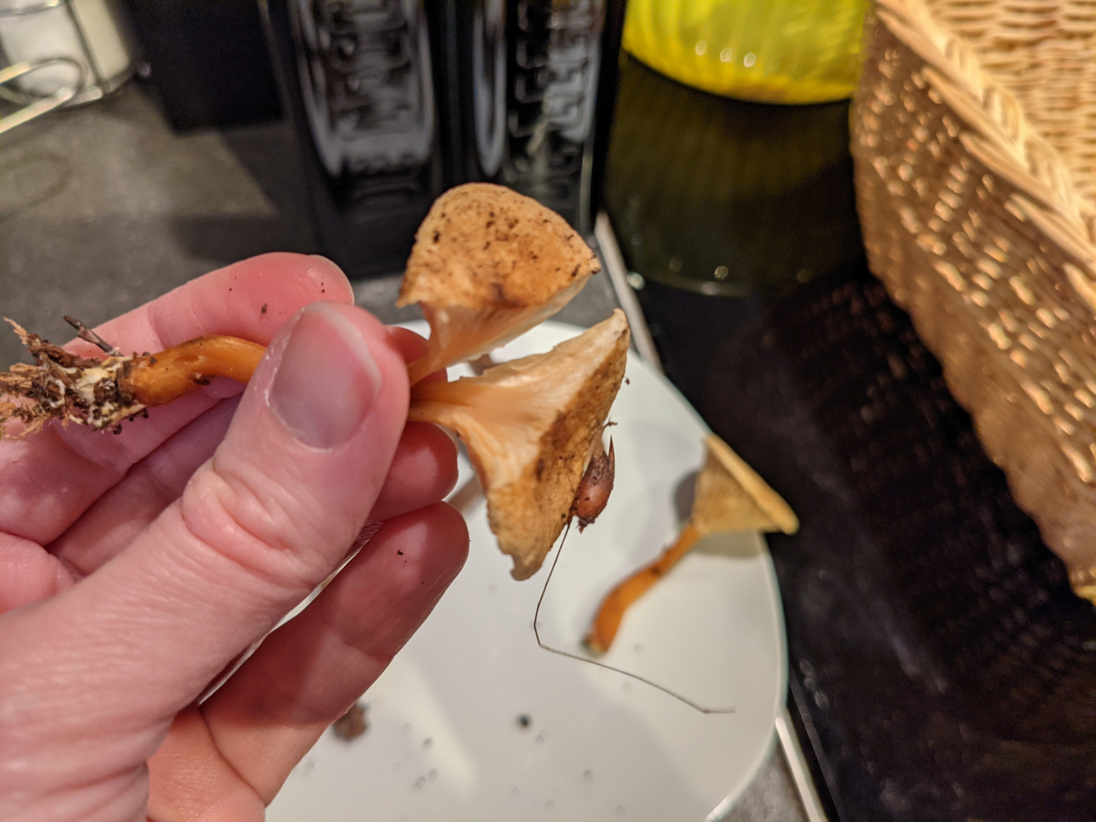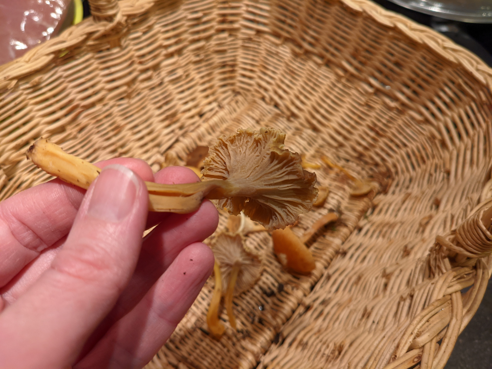 Ich glaube, dass ich noch nie echte Pfifferlinge gefunden habe. Bisher waren es immer falsche Pfifferlinge oder eben Trompeten. Aber bei diesem hier bin ich ganz optimistisch...?